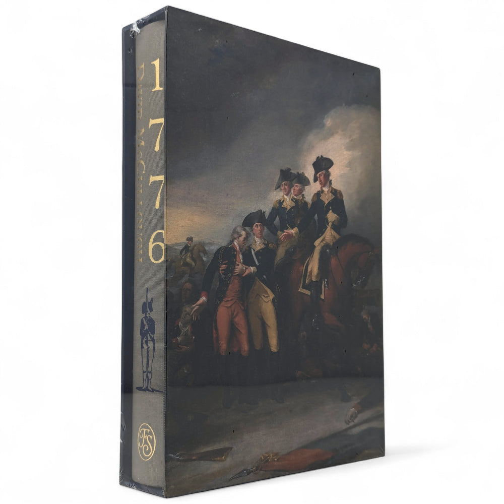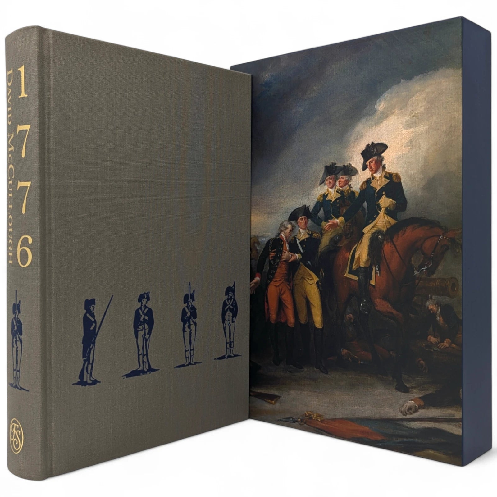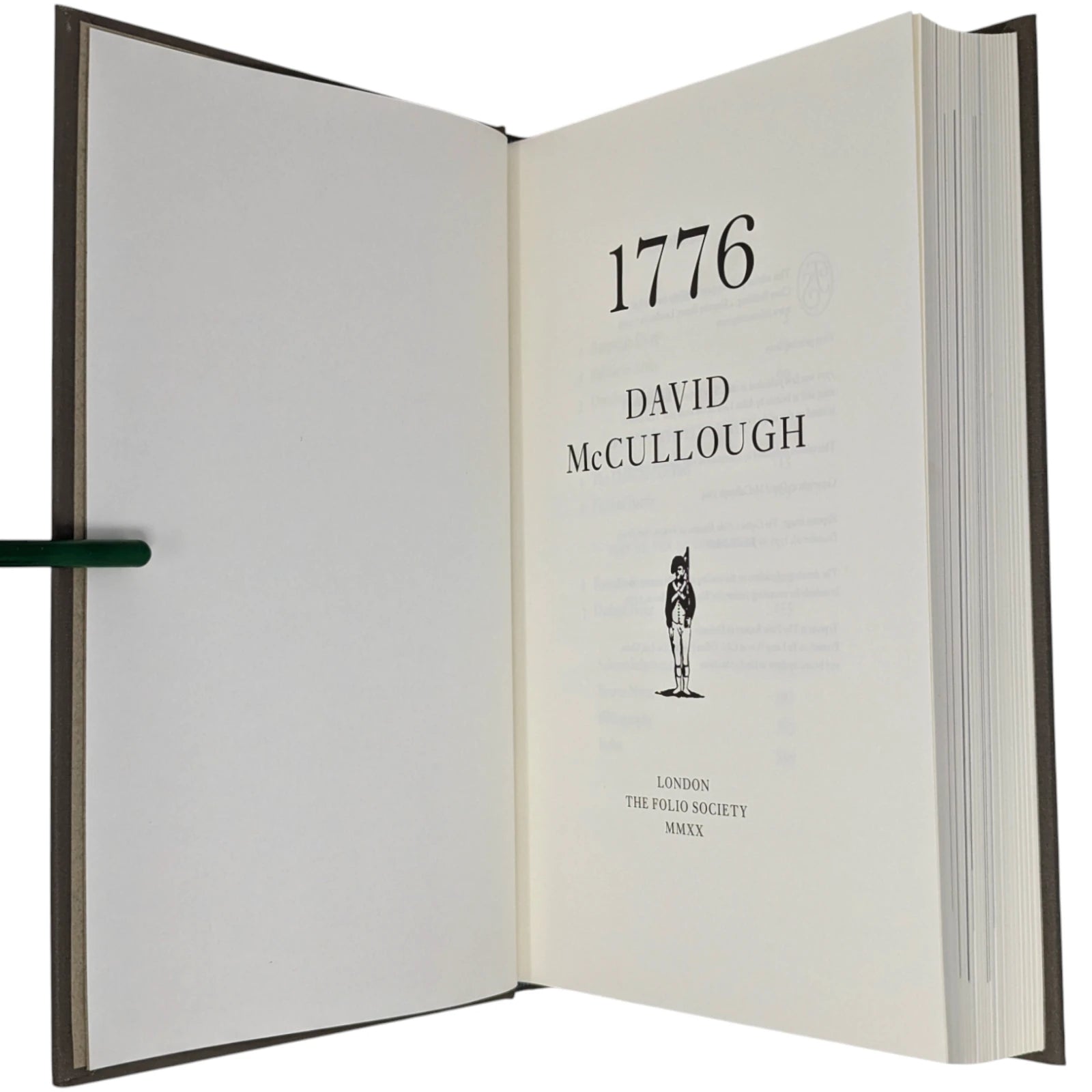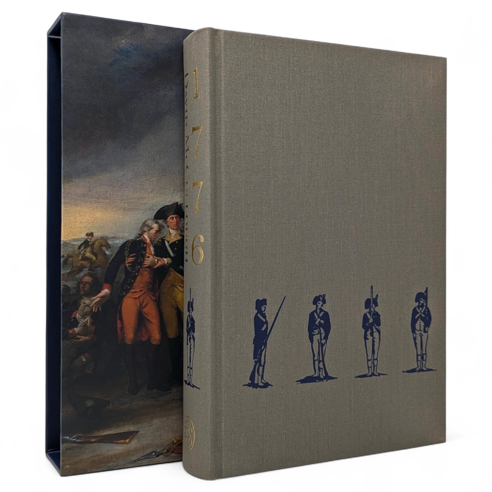 1776, David McCullough. London: The Folio Society, 2020. First printing thus. 240 × 164 × 36 mm. Pp. [i–vii] viii–ix [x–xviii], [1–3] 4–410 [411–414]: [12] leaves of colour plates. Type: Ehrhardt. Printed and bound by C & C Offset in full grey buckram blocked in blue; pale grey flecked endleaves. Printed slip case. Primarily illustrated by photographs of oil paintings and engravings. In addition to the plates, sketches from the year in question by British engineer Captain Archibald Robertson are reproduced in the text. Maps are on pages [27], [139] and [280]. Focuses on the second year of the American War of Independence.