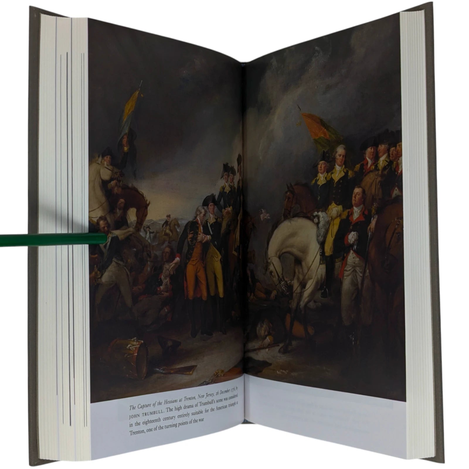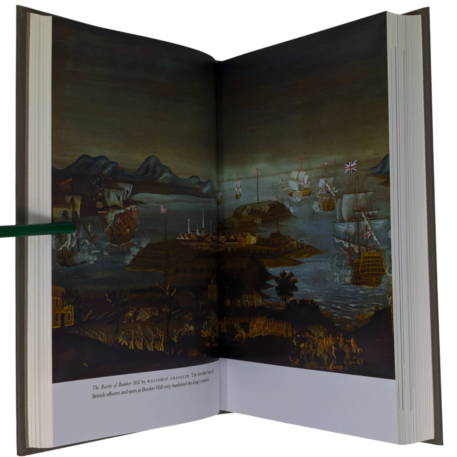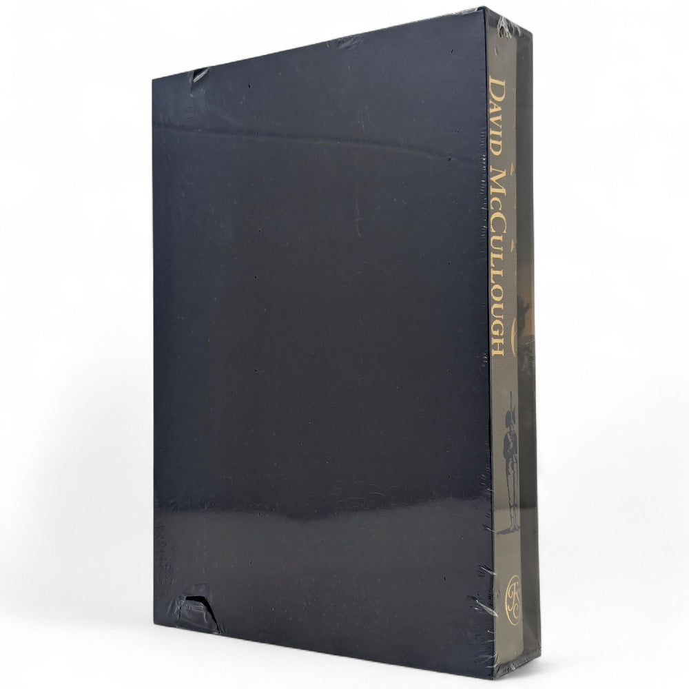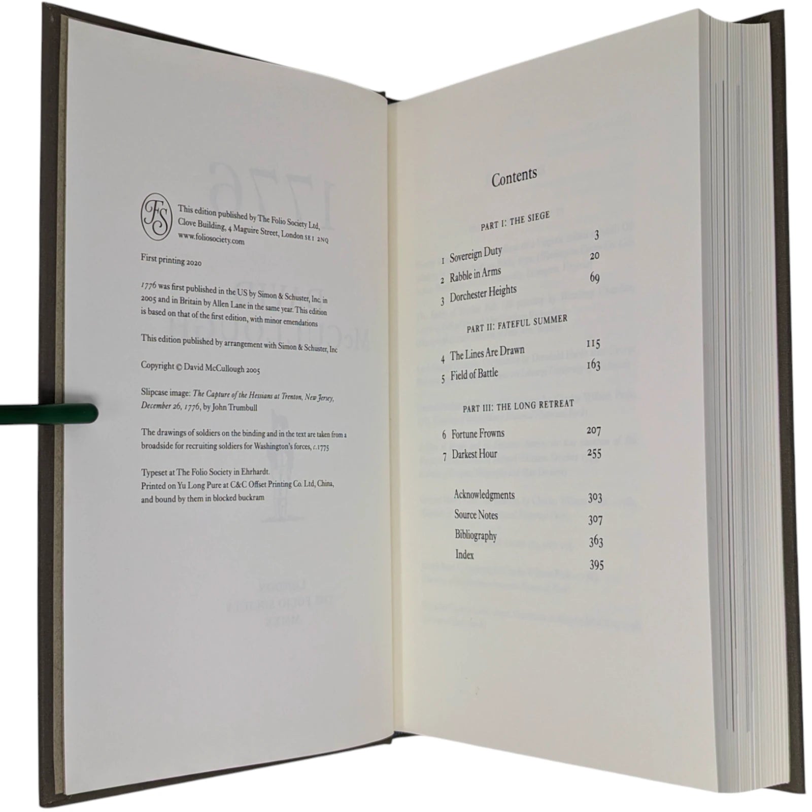 1776, David McCullough. London: The Folio Society, 2020. First printing thus. 240 × 164 × 36 mm. Pp. [i–vii] viii–ix [x–xviii], [1–3] 4–410 [411–414]: [12] leaves of colour plates. Type: Ehrhardt. Printed and bound by C & C Offset in full grey buckram blocked in blue; pale grey flecked endleaves. Printed slip case. Primarily illustrated by photographs of oil paintings and engravings. In addition to the plates, sketches from the year in question by British engineer Captain Archibald Robertson are reproduced in the text. Maps are on pages [27], [139] and [280]. Focuses on the second year of the American War of Independence.