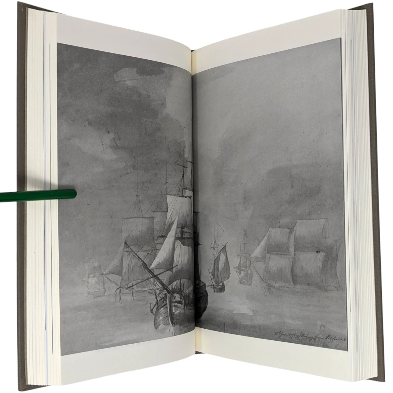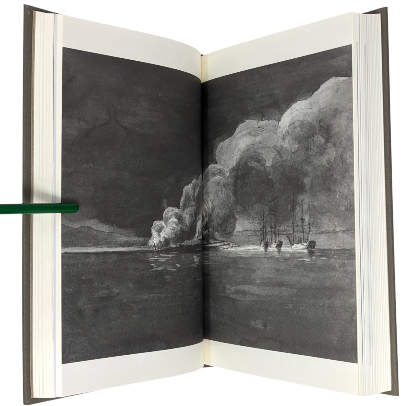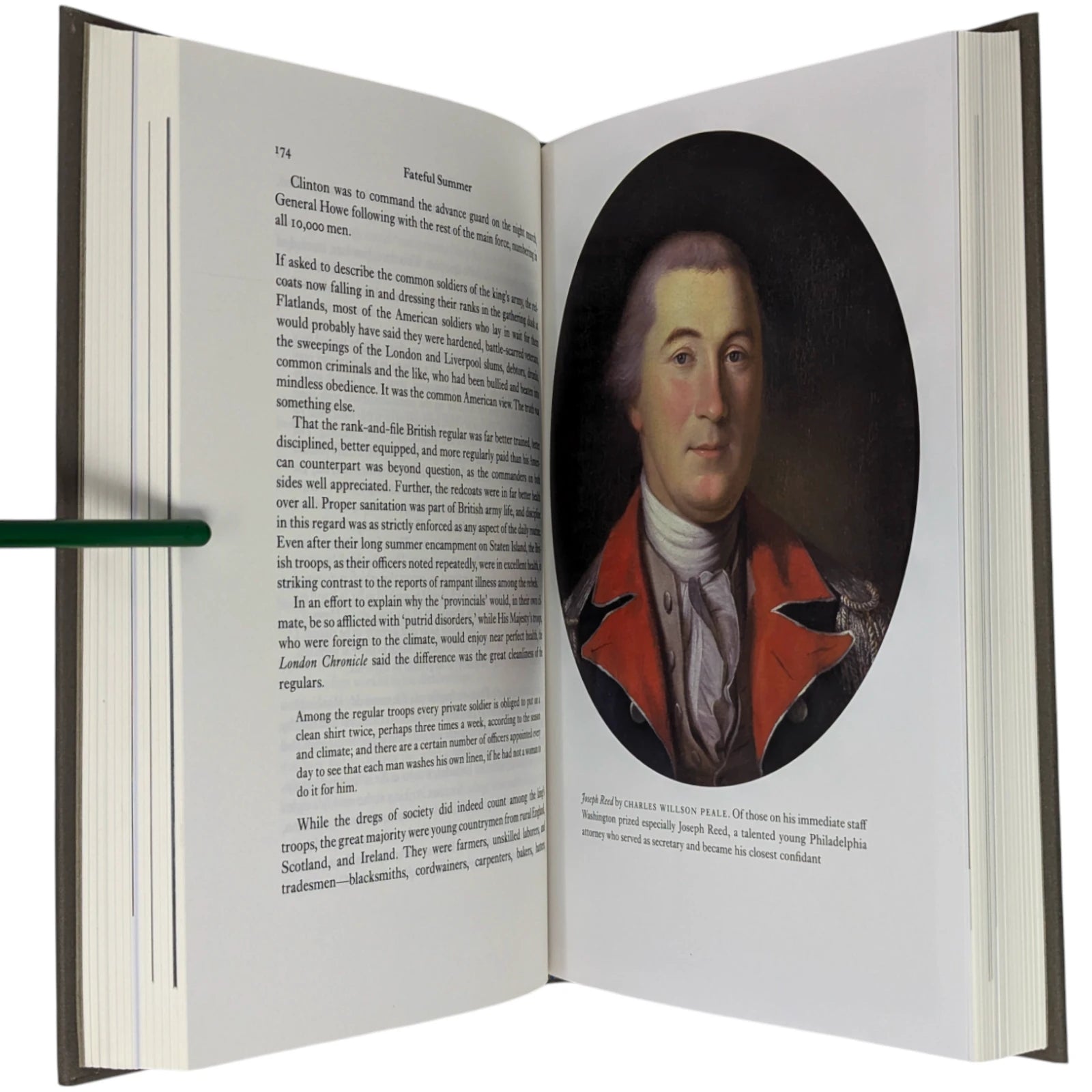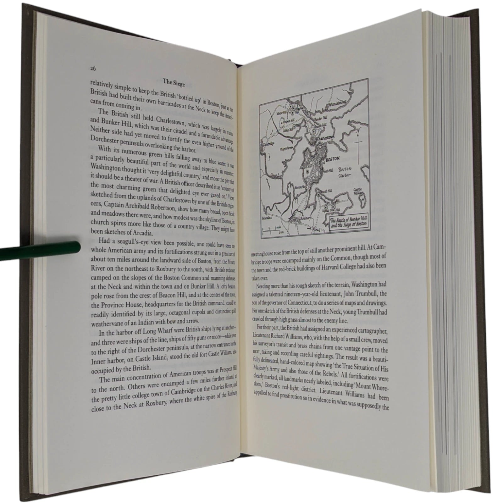 1776, David McCullough. London: The Folio Society, 2020. First printing thus. 240 × 164 × 36 mm. Pp. [i–vii] viii–ix [x–xviii], [1–3] 4–410 [411–414]: [12] leaves of colour plates. Type: Ehrhardt. Printed and bound by C & C Offset in full grey buckram blocked in blue; pale grey flecked endleaves. Printed slip case. Primarily illustrated by photographs of oil paintings and engravings. In addition to the plates, sketches from the year in question by British engineer Captain Archibald Robertson are reproduced in the text. Maps are on pages [27], [139] and [280]. Focuses on the second year of the American War of Independence.