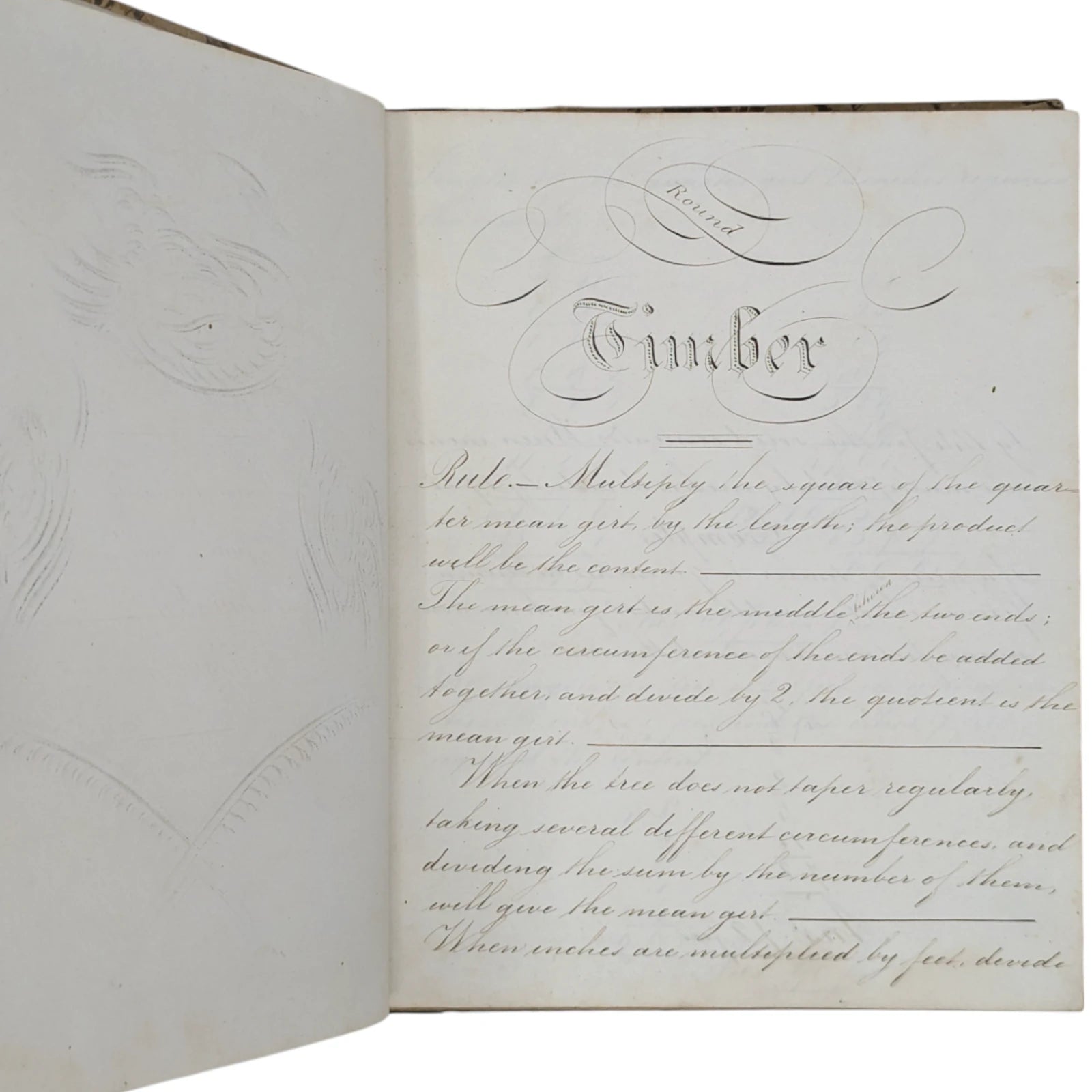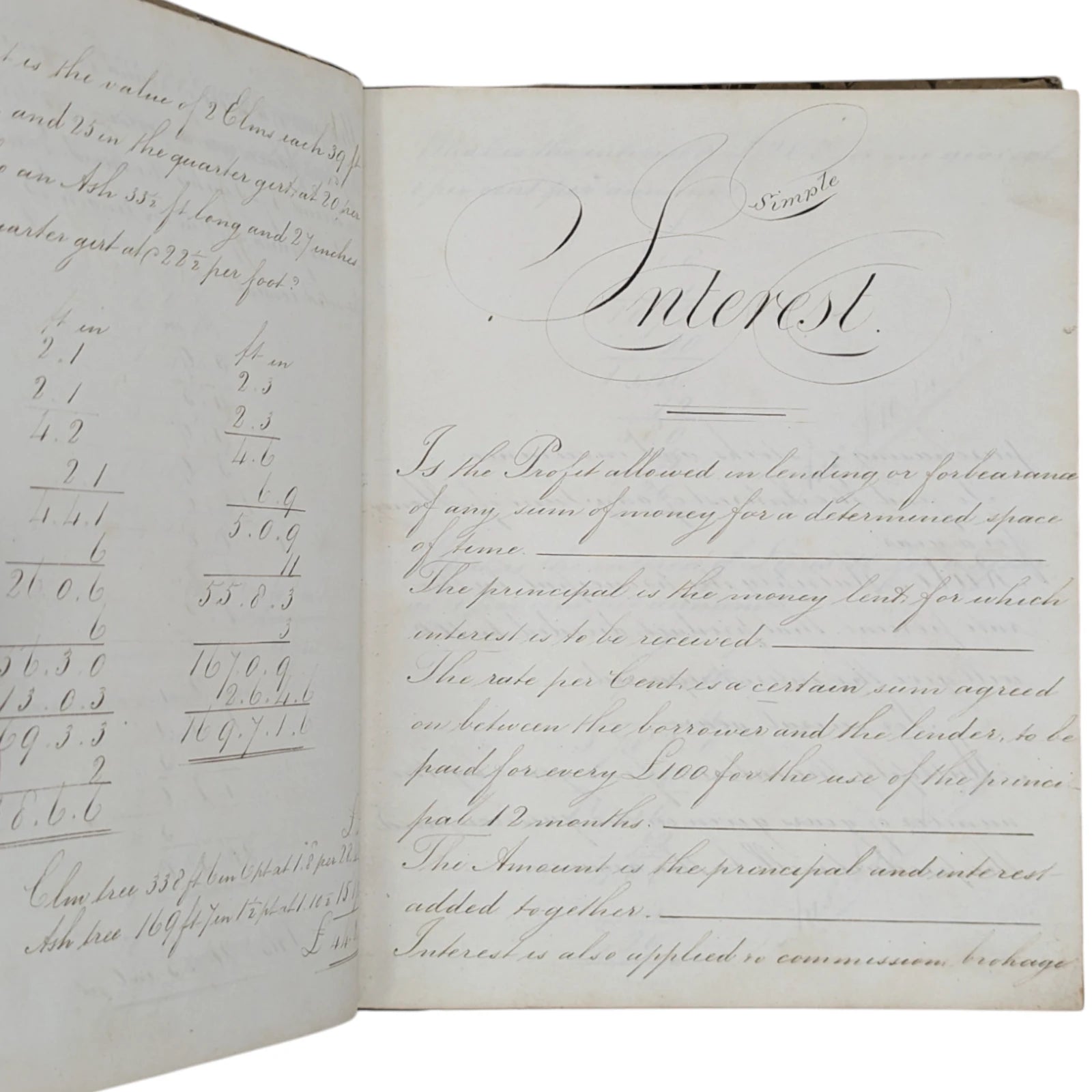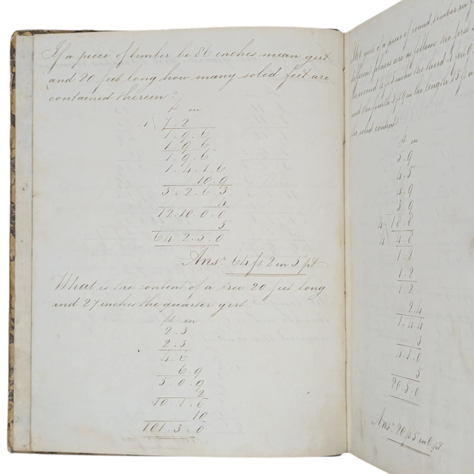 Hardcover; quarter-leather with hand-marbled sides and marbled edges; 18.5 x 23 cm, 126 unnumbered pages. Handwritten throughout in exquisite penmanship, including lessons on round timber, compound interest, rebate or discount, equation of payments, barter, profit and loss, reduction of vulgar fractions, multiplication of decimals, containing both written theory and many, many examples throughout. Externally very, very worn with patches of marbled paper missing from the boards, leather dry and coming off the boards, bumped and rubbed to extremities. Internally with strong joints and pages securely bound, foxing to prelims, thumbmarks and some sporadic foxing to extremities; else clean and legible.