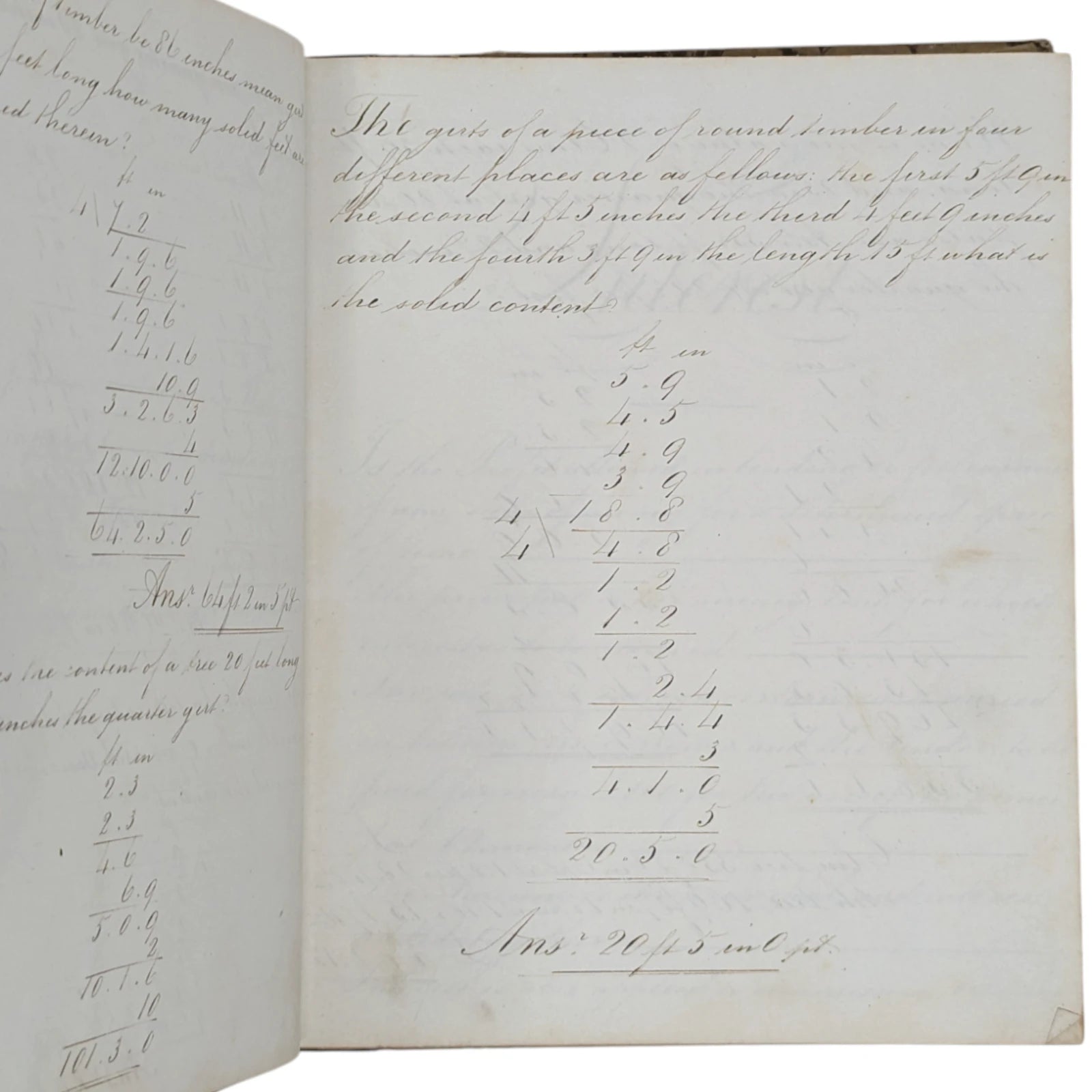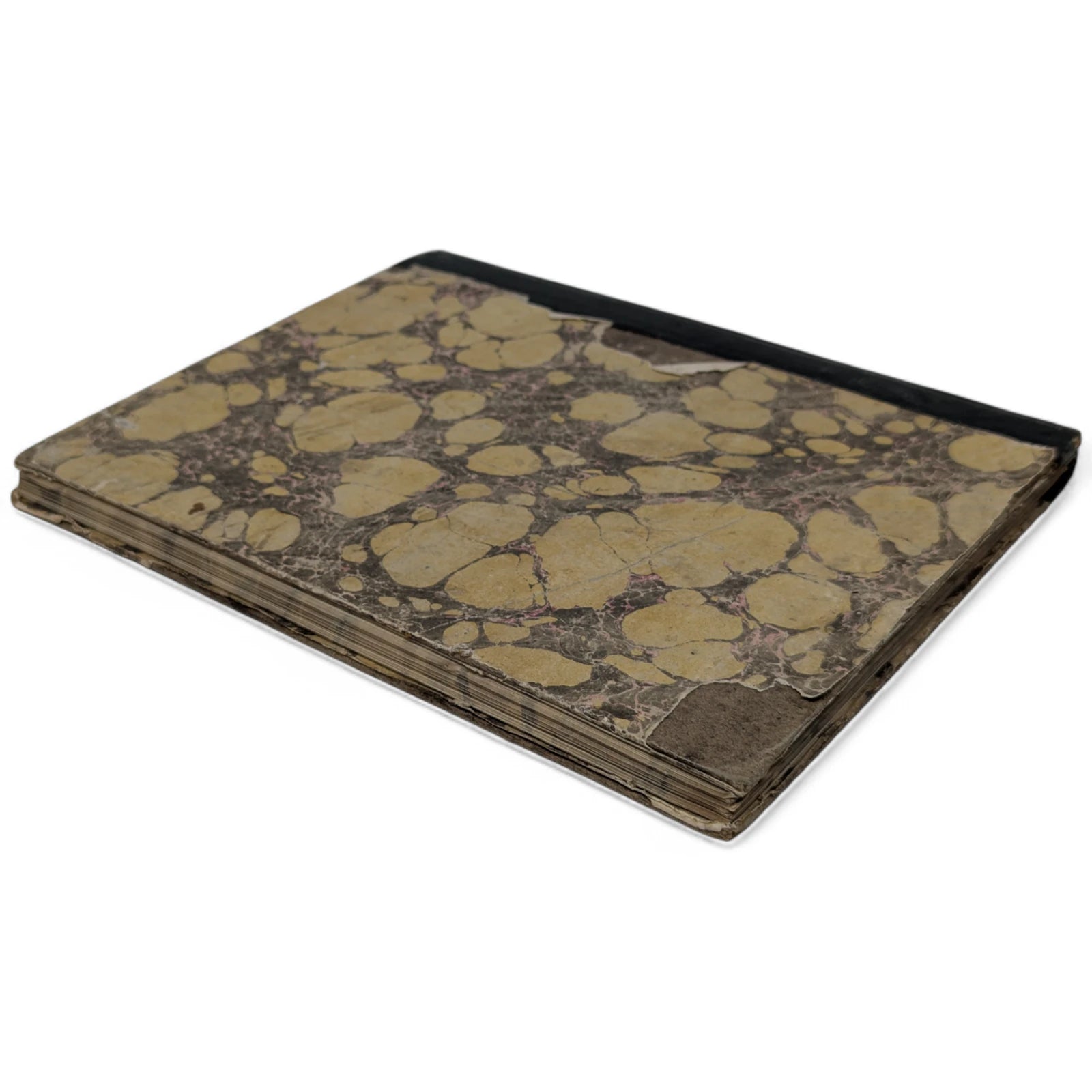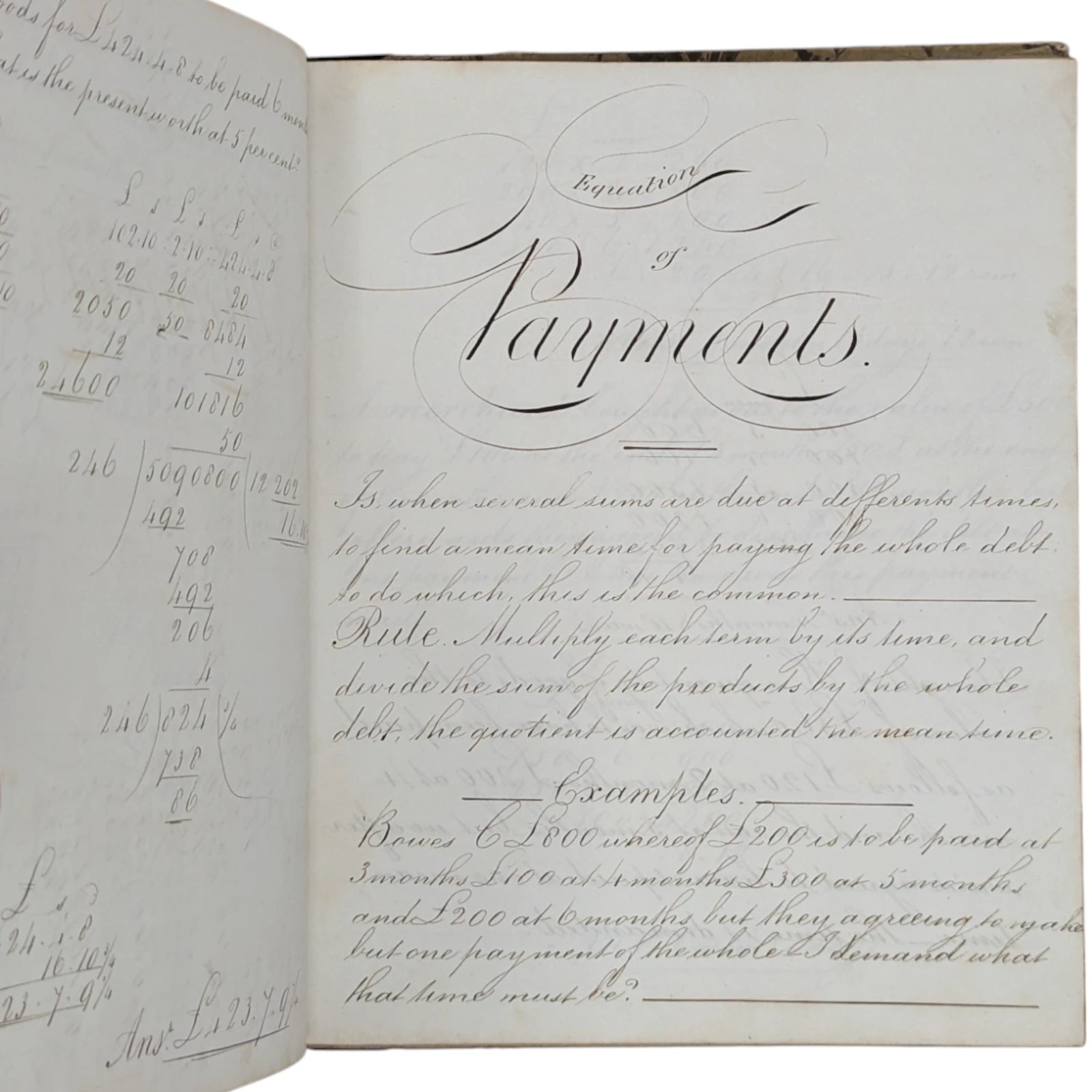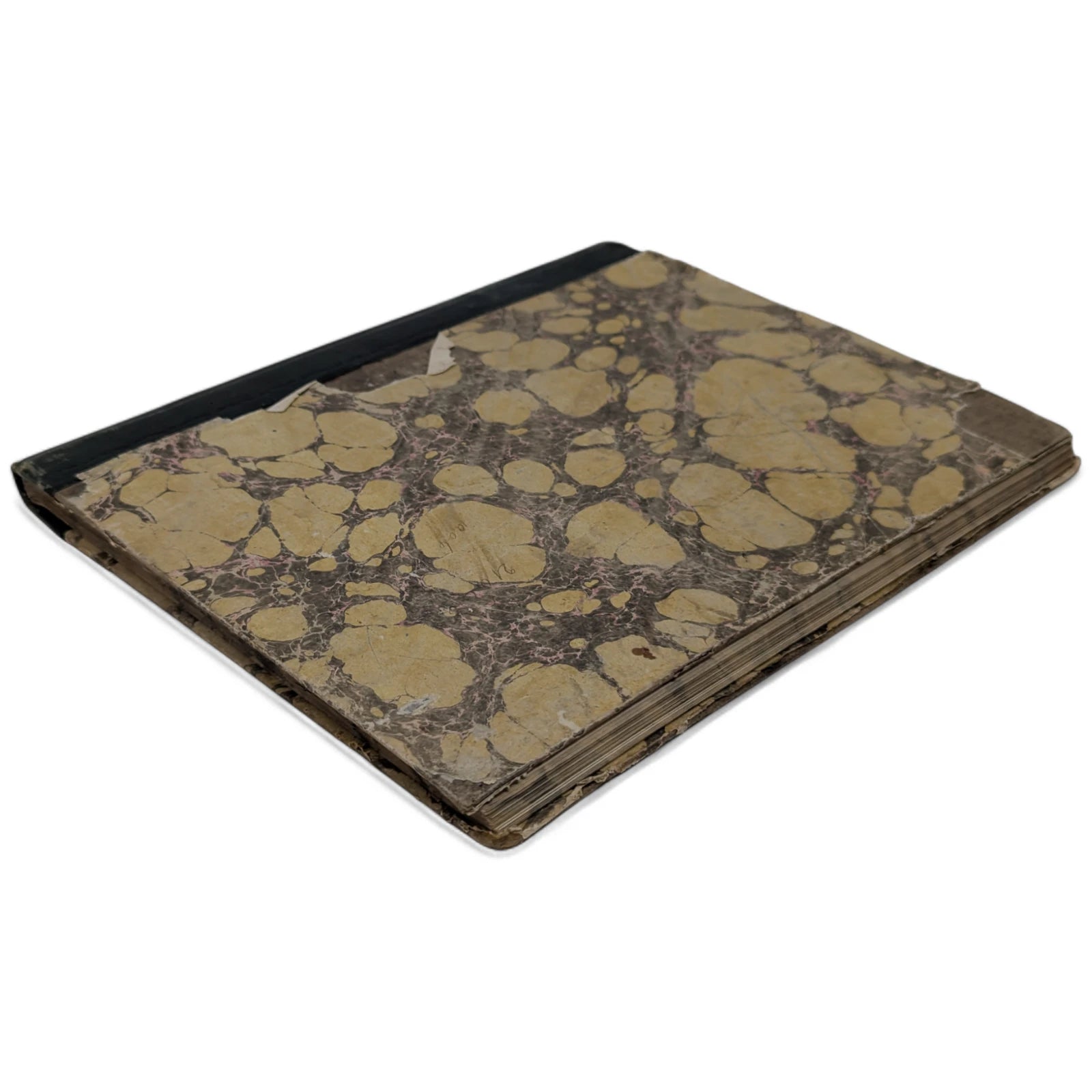 Hardcover; quarter-leather with hand-marbled sides and marbled edges; 18.5 x 23 cm, 126 unnumbered pages. Handwritten throughout in exquisite penmanship, including lessons on round timber, compound interest, rebate or discount, equation of payments, barter, profit and loss, reduction of vulgar fractions, multiplication of decimals, containing both written theory and many, many examples throughout. Externally very, very worn with patches of marbled paper missing from the boards, leather dry and coming off the boards, bumped and rubbed to extremities. Internally with strong joints and pages securely bound, foxing to prelims, thumbmarks and some sporadic foxing to extremities; else clean and legible.