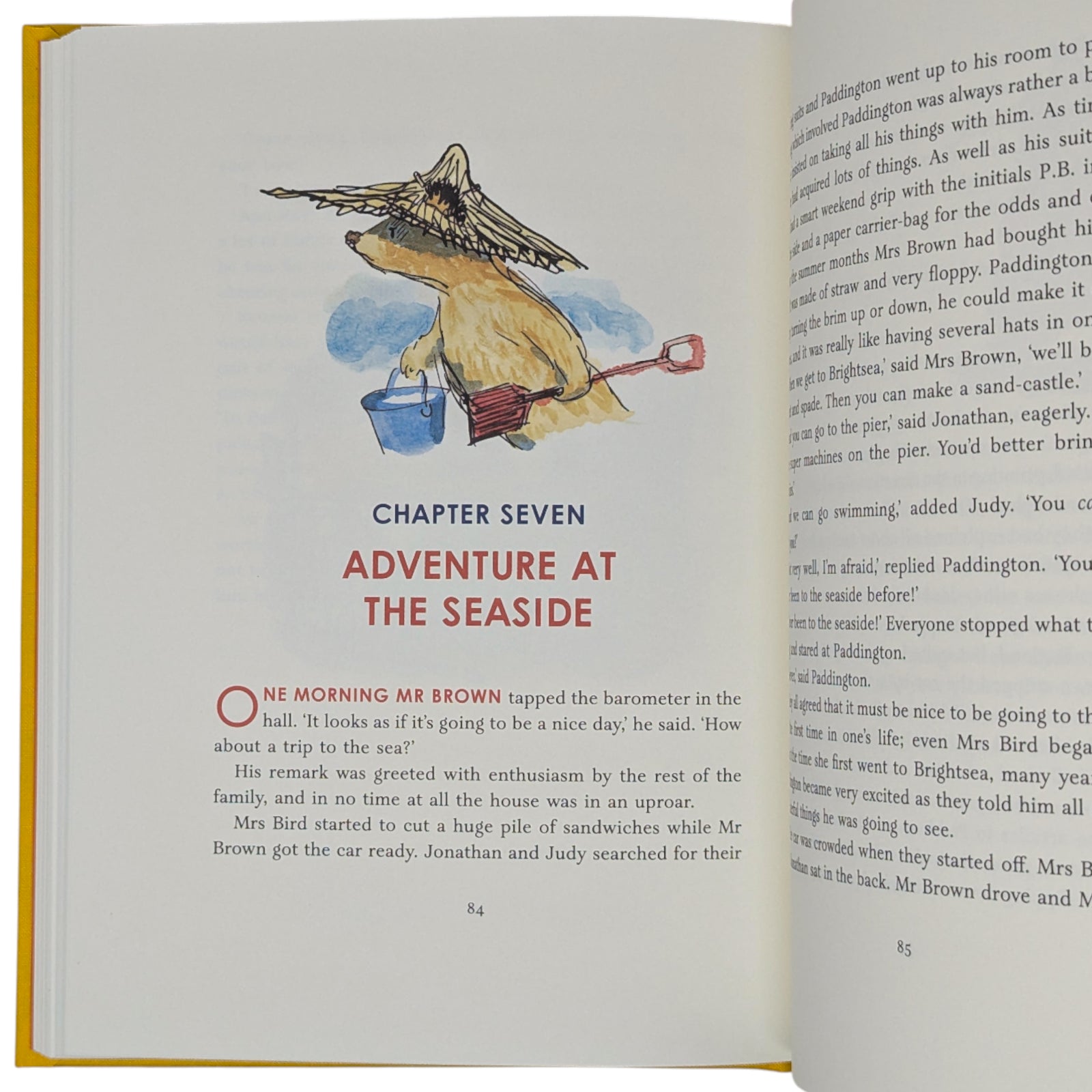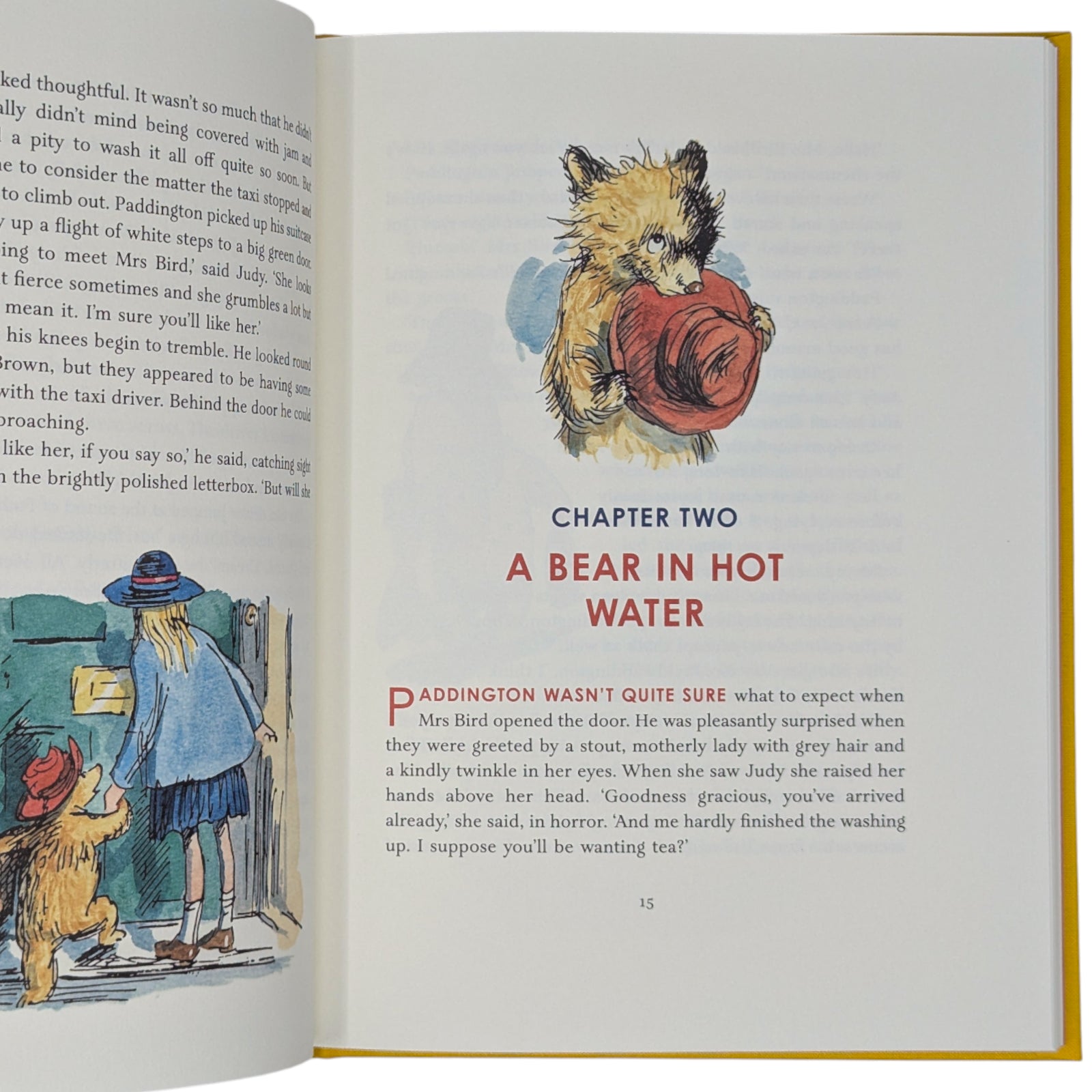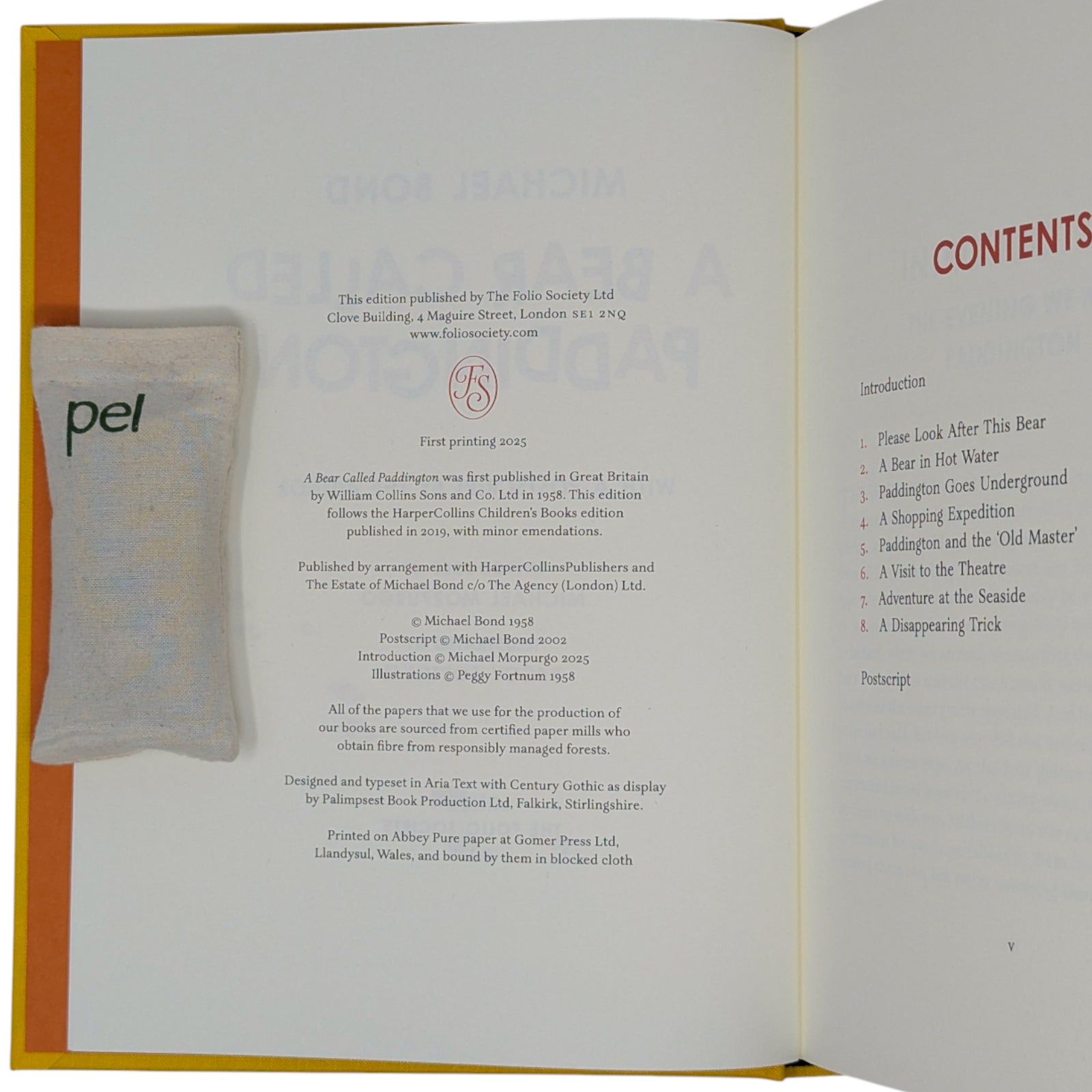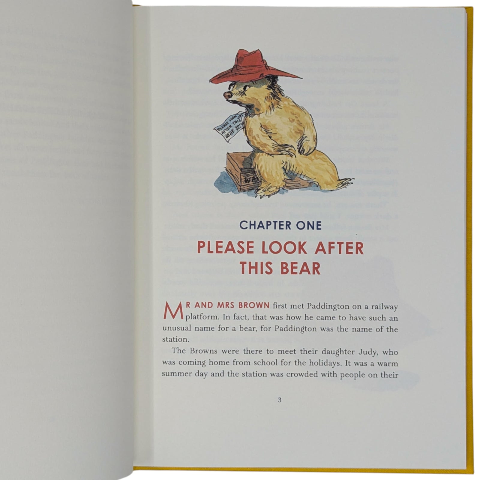 BOND, Michael. A Bear Called Paddington. London: The Folio Society, 2025. First printing thus. Introduced by Michael Morpurgo, extensively illustrated with Peggy Fortnum’s original integrated pictures, colourised and enlarged. 10 inches x 7½ inches, 128 pp. Bound in yellow cloth with red and blue lettering and illustrations of Paddington bear to upper and rear covers, printed orange endpapers with an illustration of a marmelade jar. Housed in a blue slipcase blocked with Peggy Fortnum's illustration of lettering and pawprints.