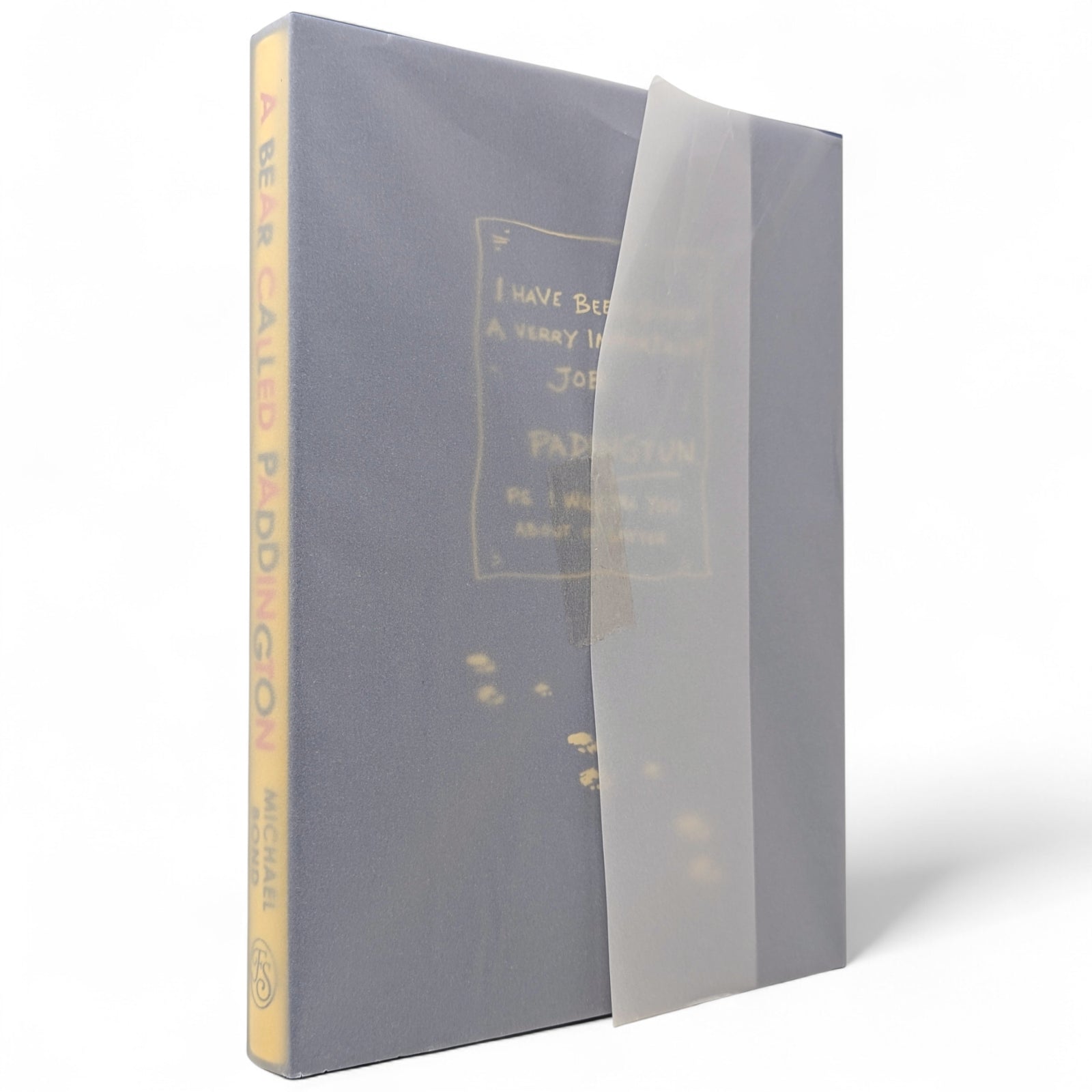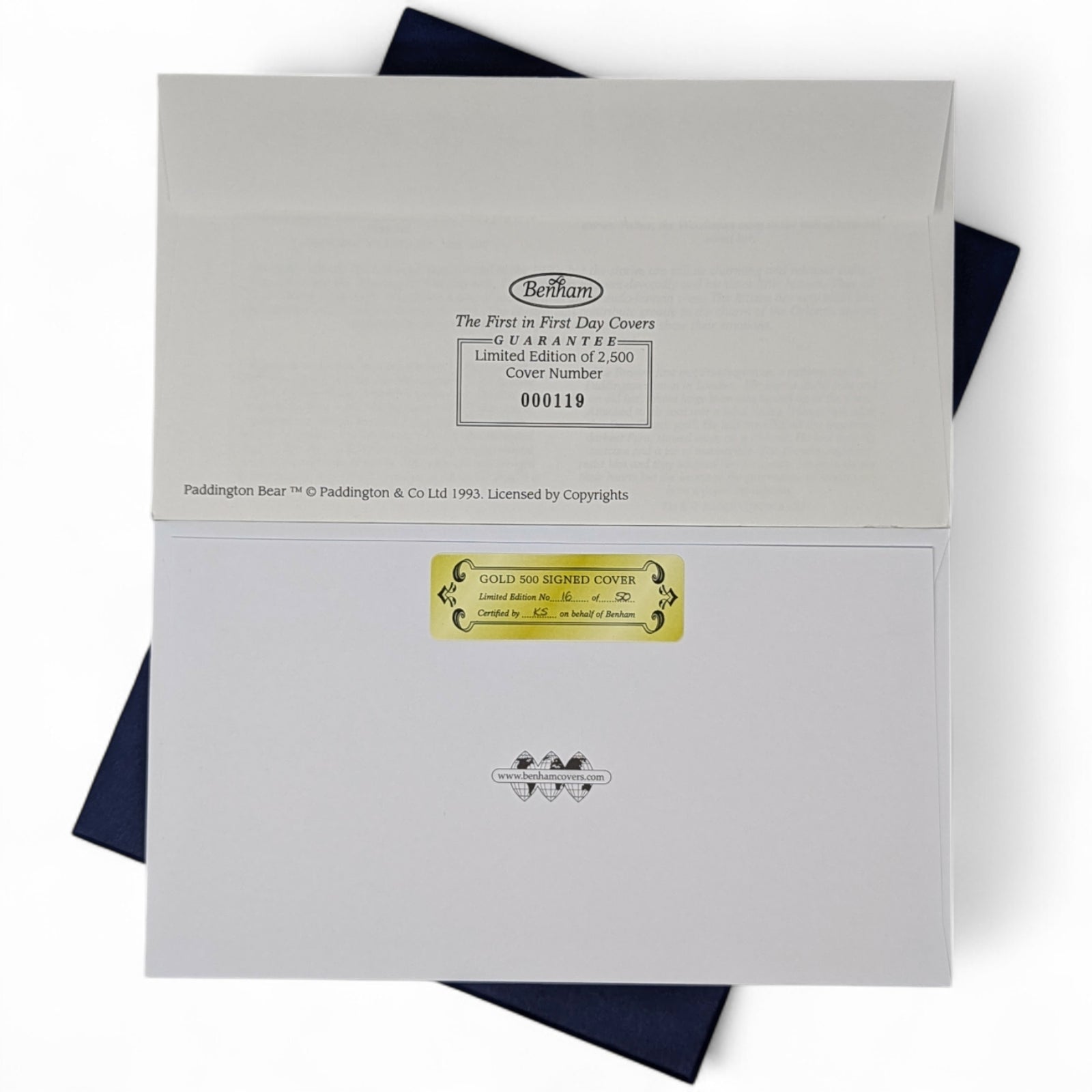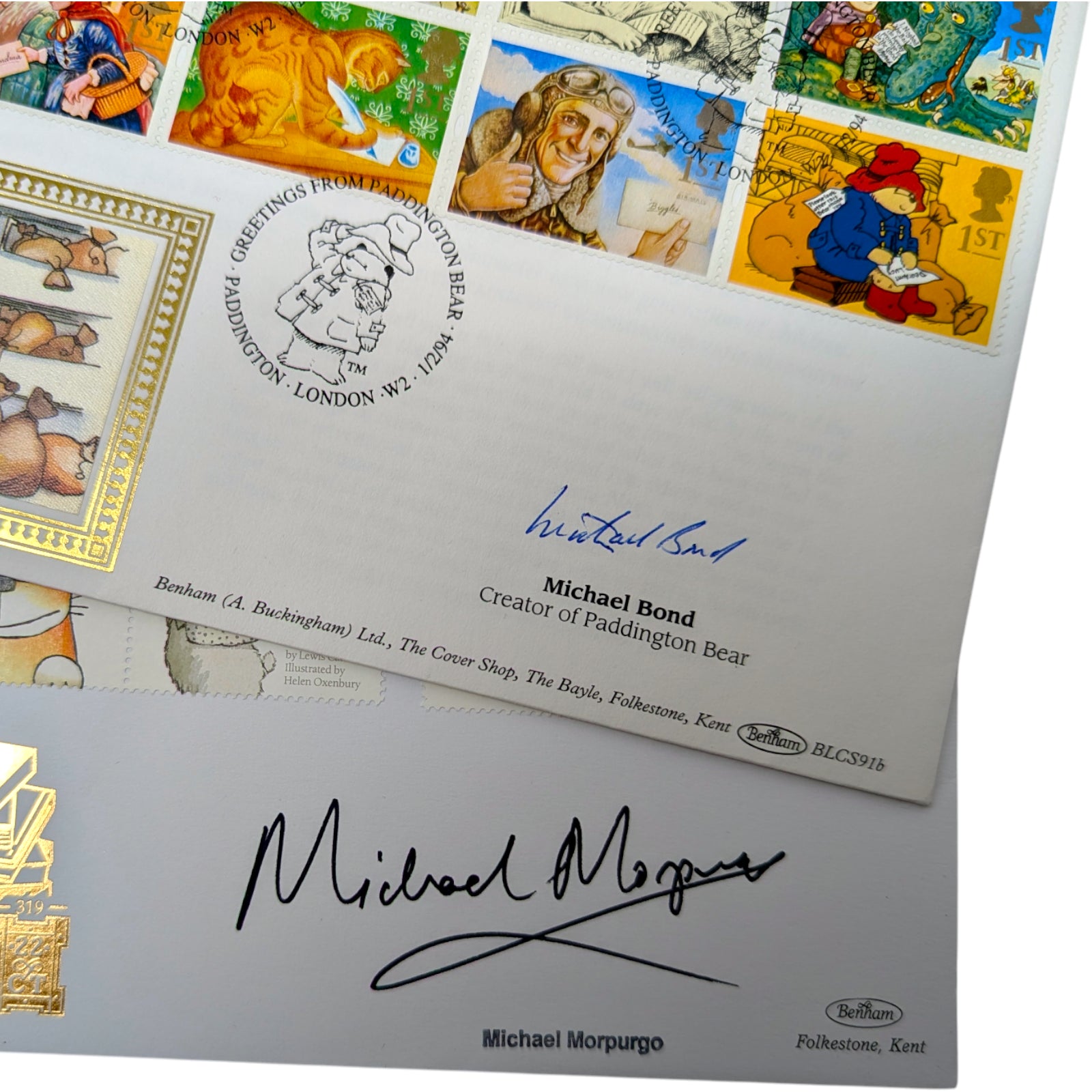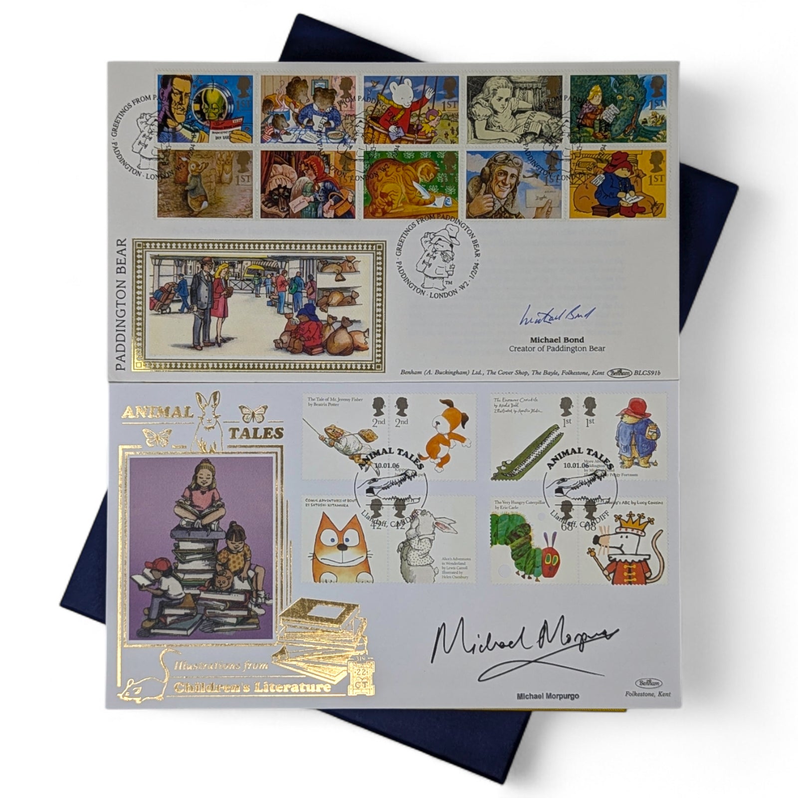 Two official Benham Limited Edition First Day Covers, loosely inserted, each themed around classic children’s literature and including some delightful commemorative Royal Mail stamps featuring scenes from Paddington Bear's adventures. One (1994) was issued in a limited edition of 2,500 copies, and is hand-signed by the author Michael Bond, while the other (2006) was released as part of the Gold 50 Signed Cover series and is hand-signed by the introducer Michael Morpurgo (the author of beloved classic War Horse).