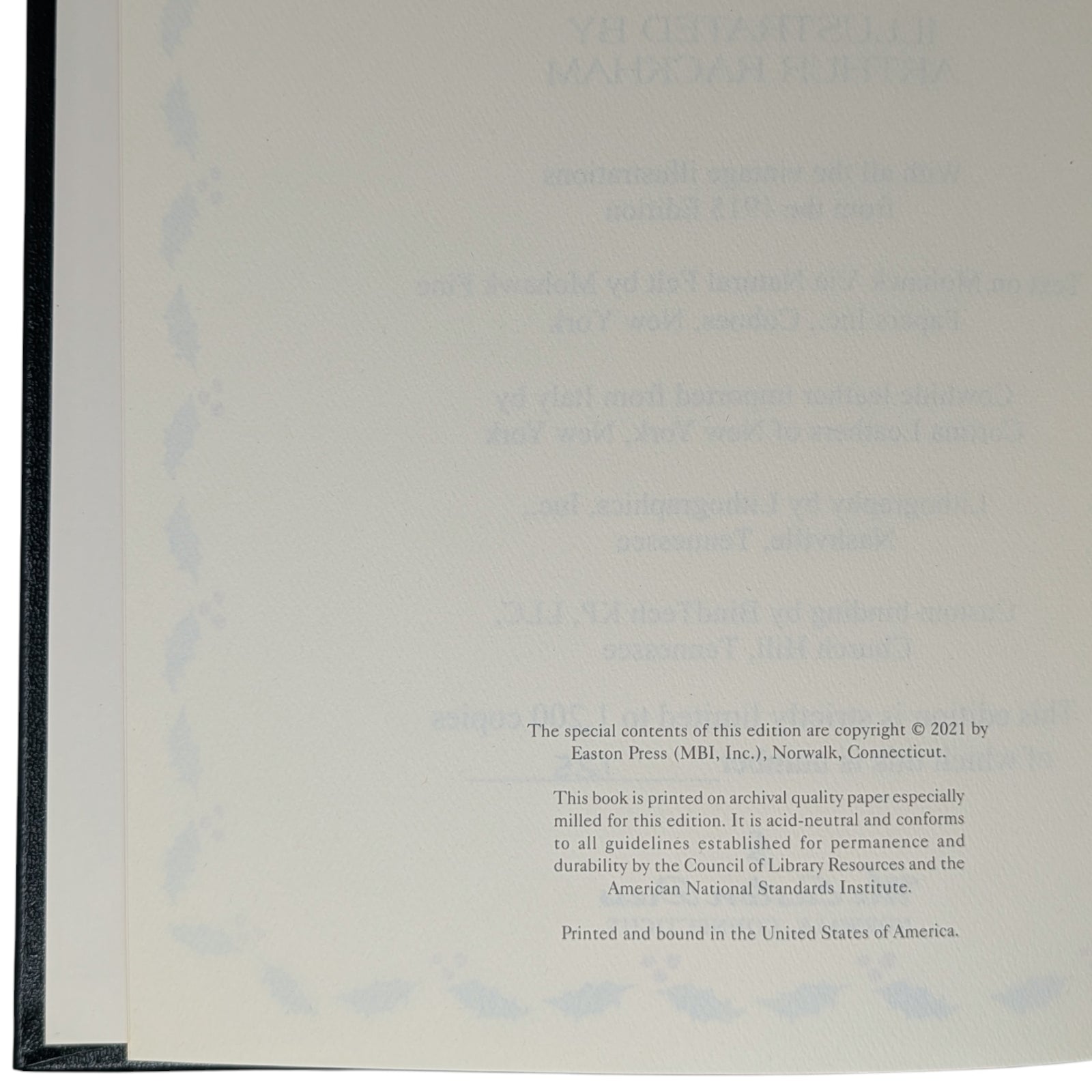 9" x 11 1/4”, 168pp. Bound in full cowhide leather imported from Italy in Church Hill, Tennessee, with five raised bands to spine and gilt decoration to front cover and spine. All edges gilt. Illustrated endpapers (reproduced from the 1915 edition). Satin ribbon page marker. Printed on acid-neutral Mohawk via Natural Felt paper by Mohawk Fine Papers in New York. Sewn binding. All illustrations with captioned tissue guards. Housed in a cloth-bound slipcase with gilt decoration to one panel. A rather beautiful production.