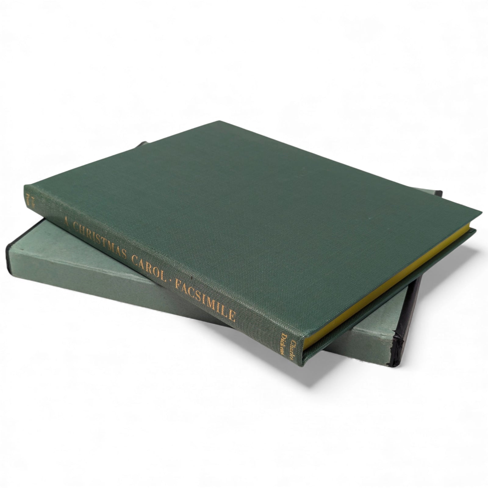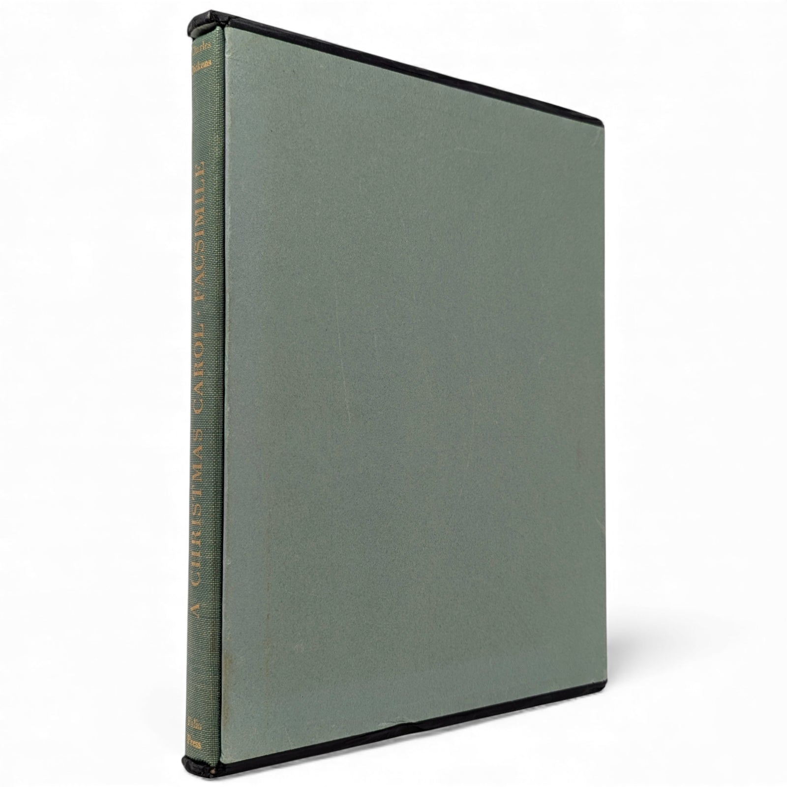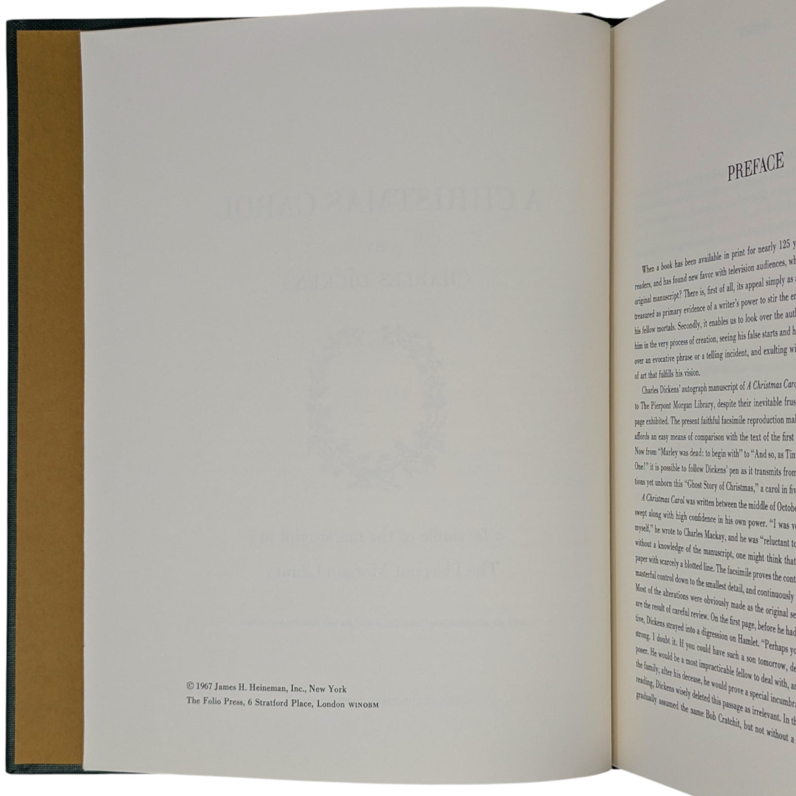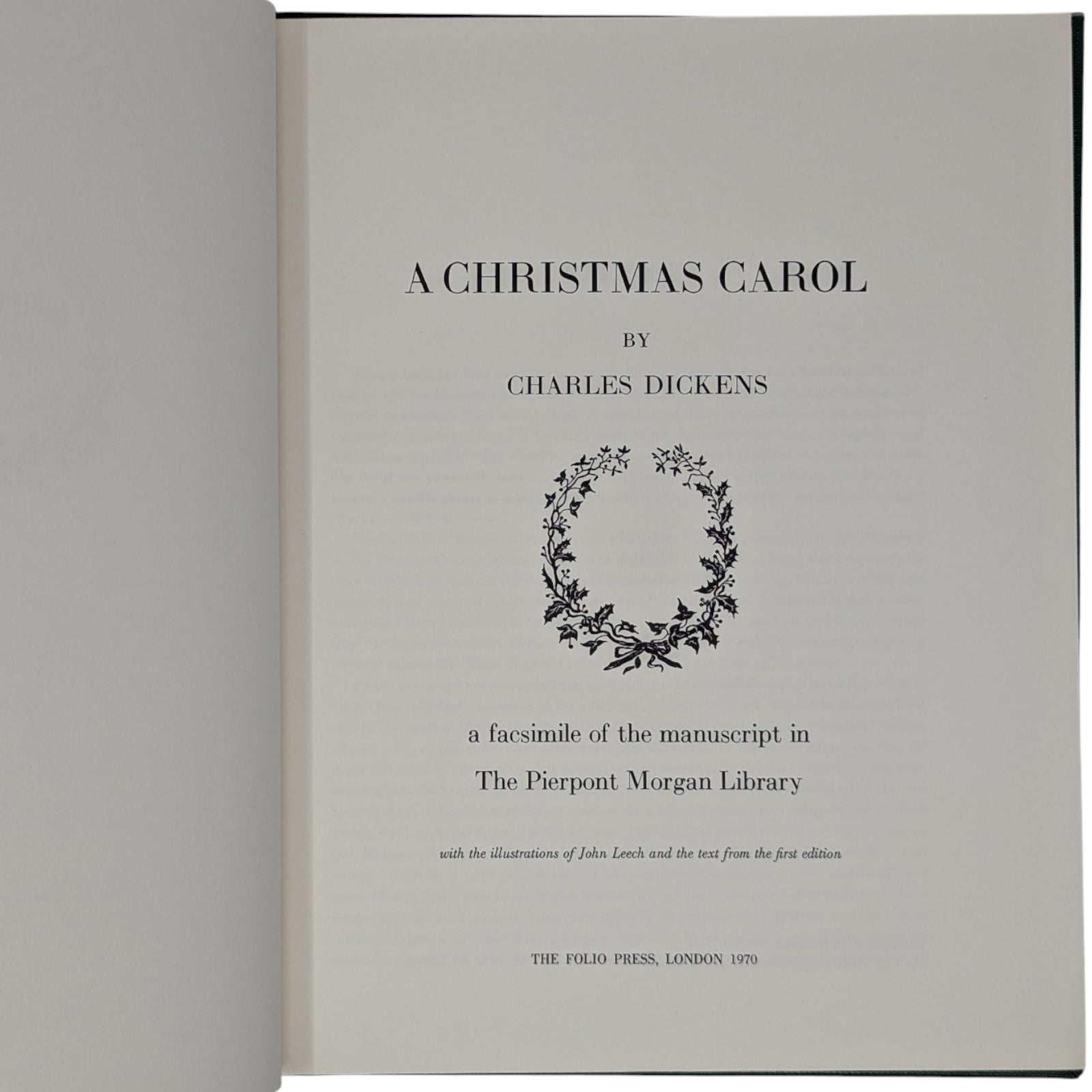 DICKENS, Charles. A Christmas Carol in Prose Being a Ghost Story of Christmas. London: The Folio Press, [1970]. A facsimile of the manuscript in the Pierpont Morgan Library, with the illustrations of John Leech and the text from the first edition. Introduction by Monica Dickens, the great-granddaughter of Charles Dickens. Designed by Norma Levarie. Wood-engraved vignettes by W.J. Linton. 276 × 221 × 18 mm. Pp. [i–iv] v–xi [xii], [1–4] 5–142 [143–148]. Type: Bodoni Book. Printed by the Meriden Gravure Company. Bound by Mackay in full green buckram; yellow endleaves. Green and black slip case.