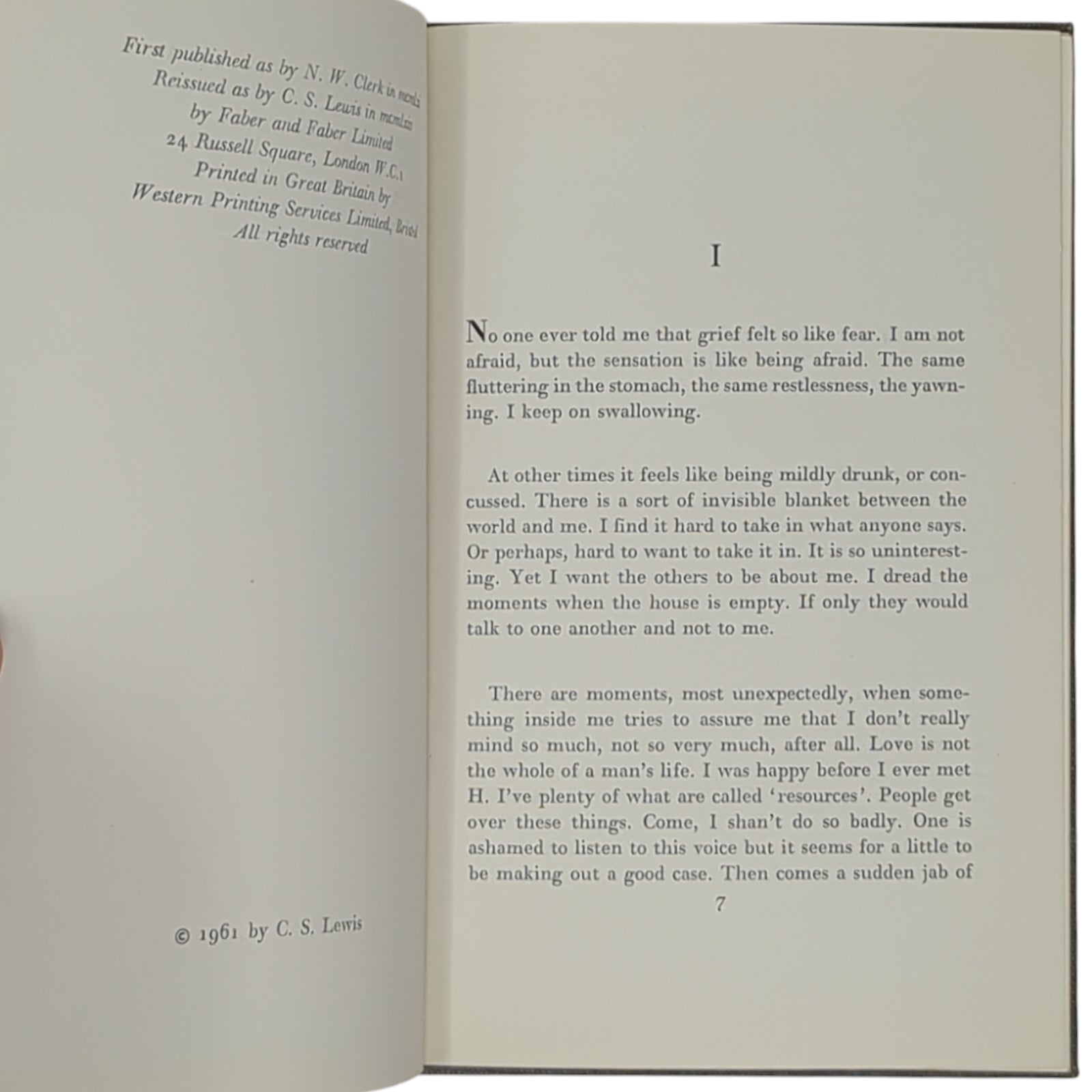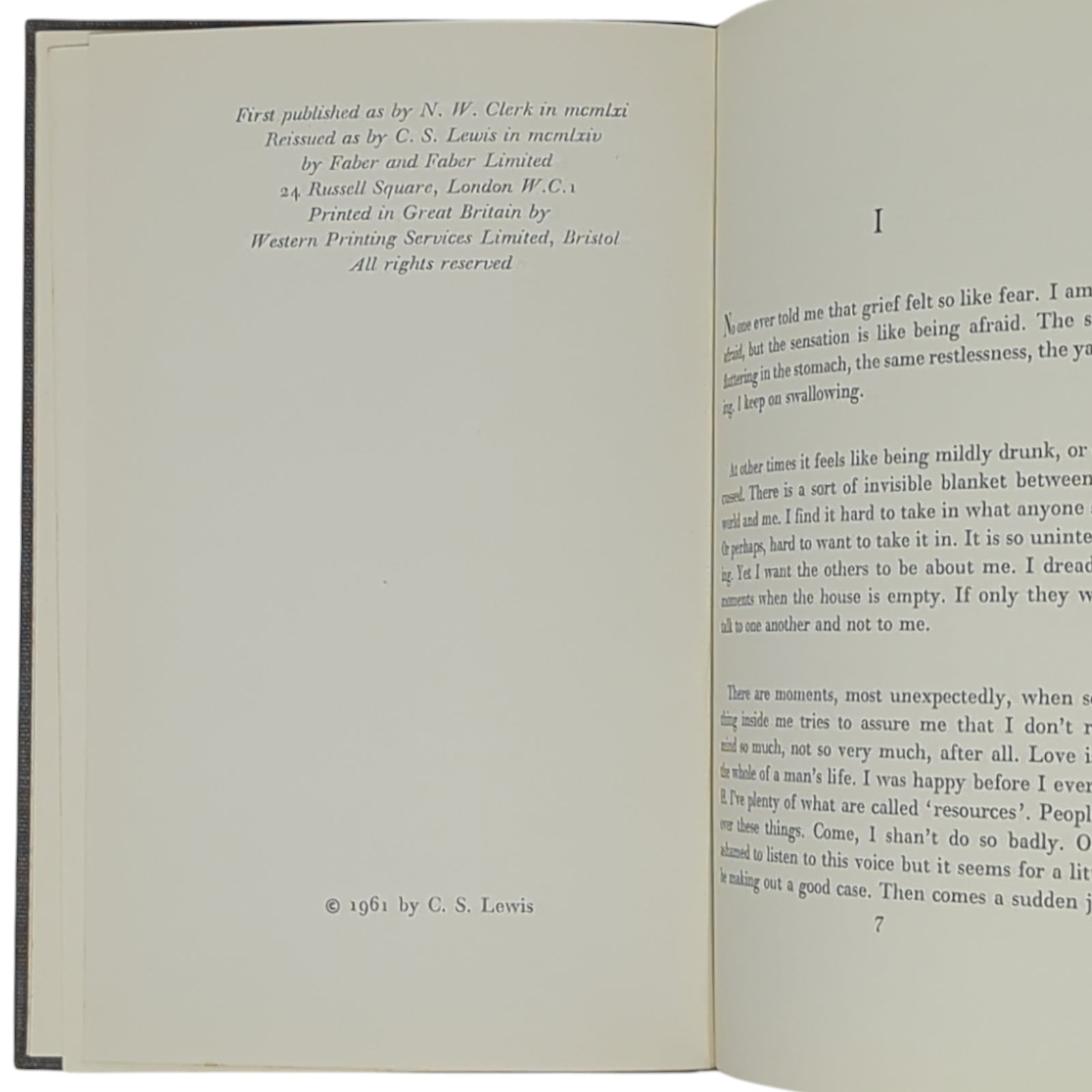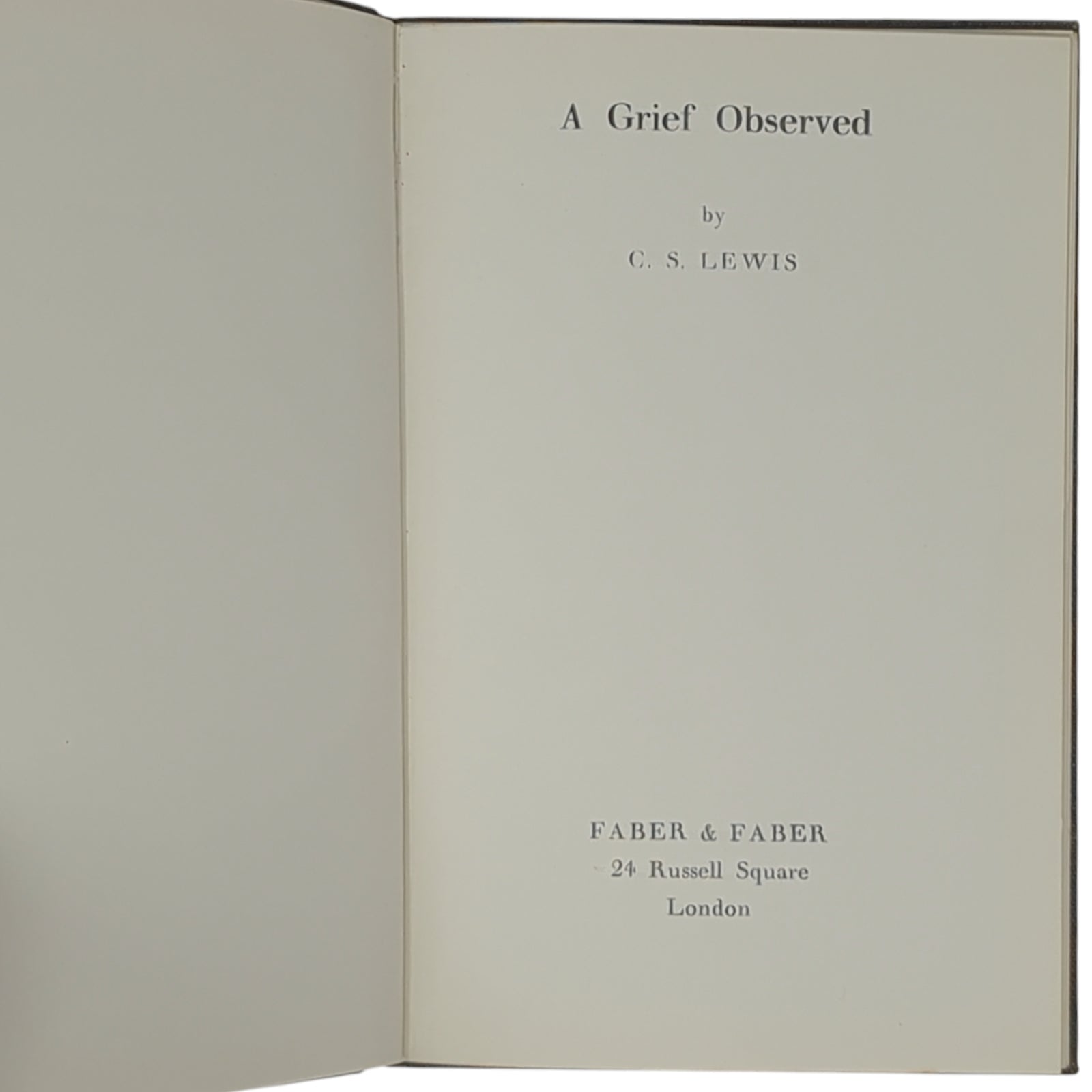 LEWIS, C. S. A Grief Observed. London: Faber and Faber, 1964. First re-issue under the name of C. S. Lewis (as opposed to the true first edition that was published three years earlier under the pseudonym N. W. Clerk), first impression of Lewis' most vulnerable and intimate work documenting his thoughts and feelings following the death of his beloved wife, Joy Davidman.
