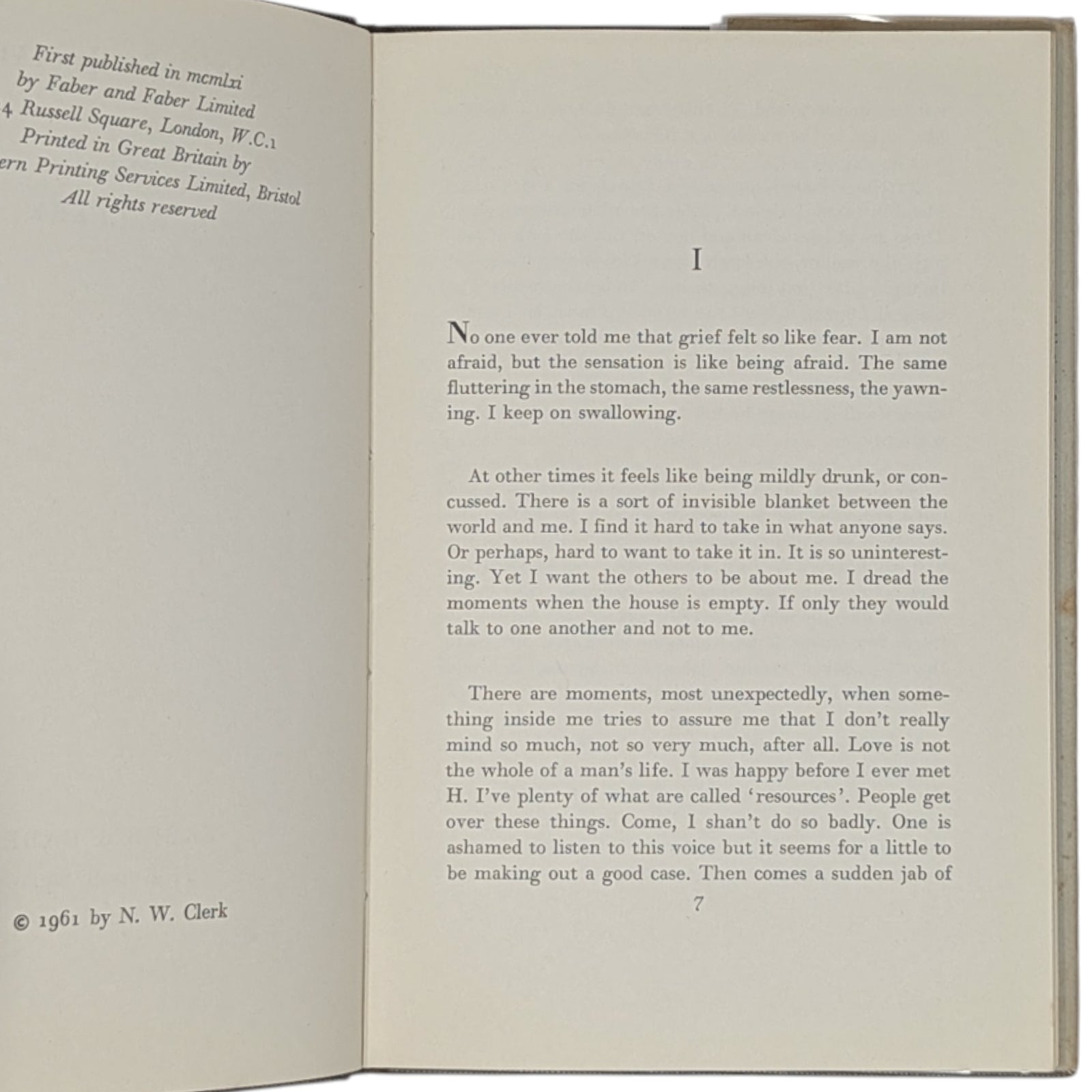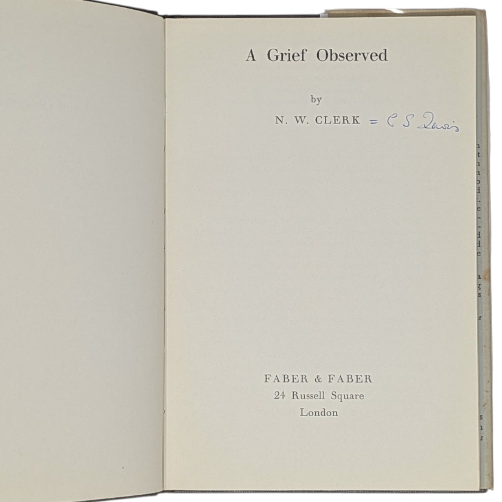 CLERK, N.W. (LEWIS, C. S.). A Grief Observed. London: Faber and Faber, 1961. First edition, first impression of Lewis' most vulnerable and intimate work, published under the pseudonym N. W. Clerk and documenting his thoughts and feelings following the death of his beloved wife, Joy Davidman.