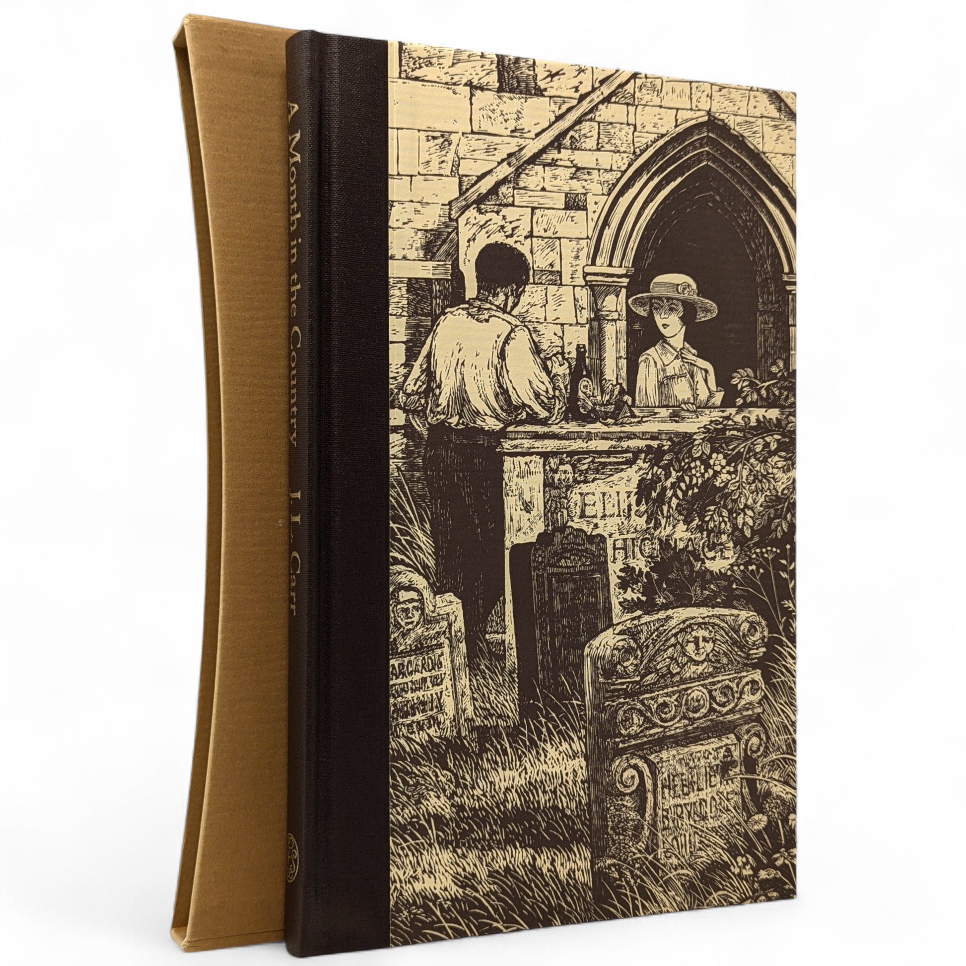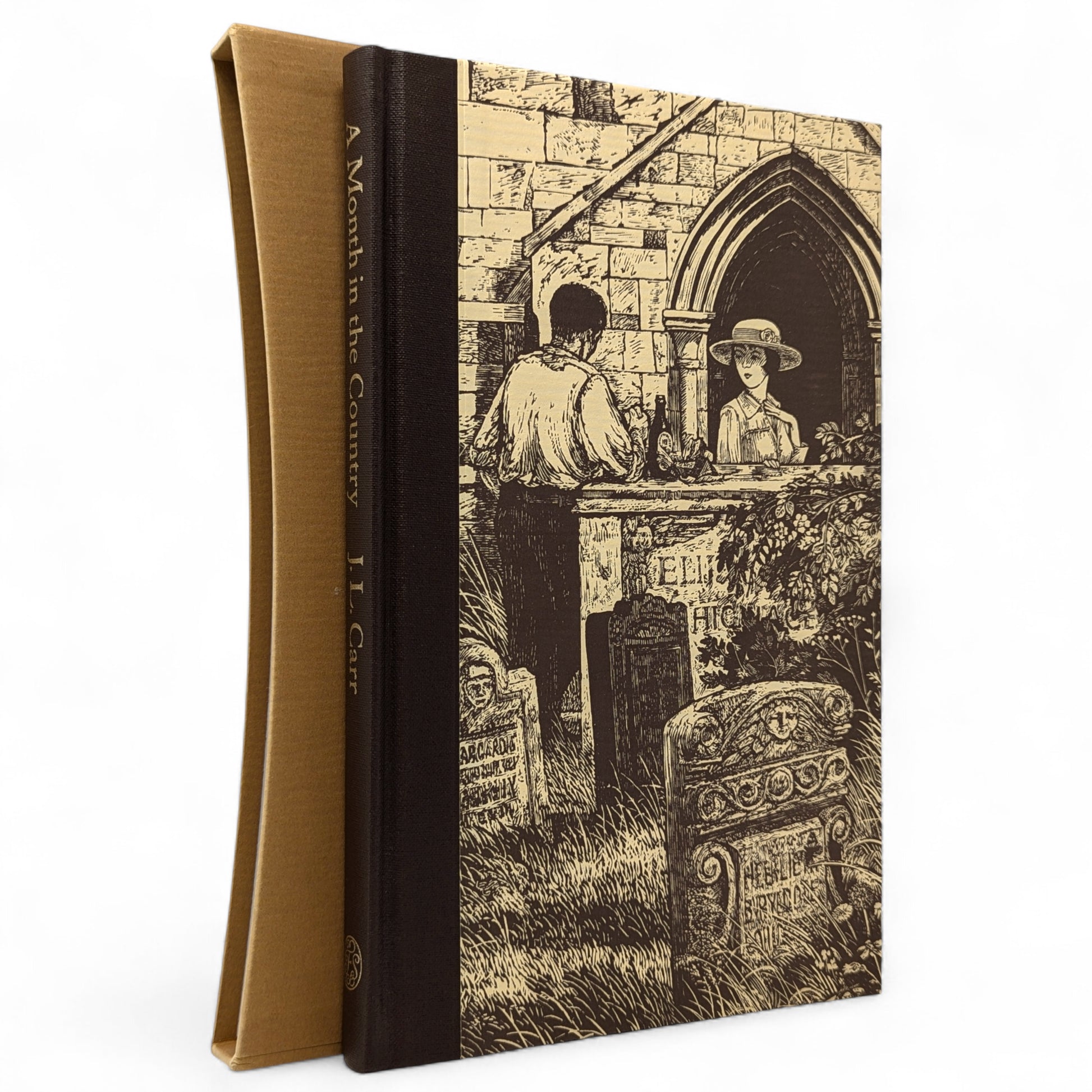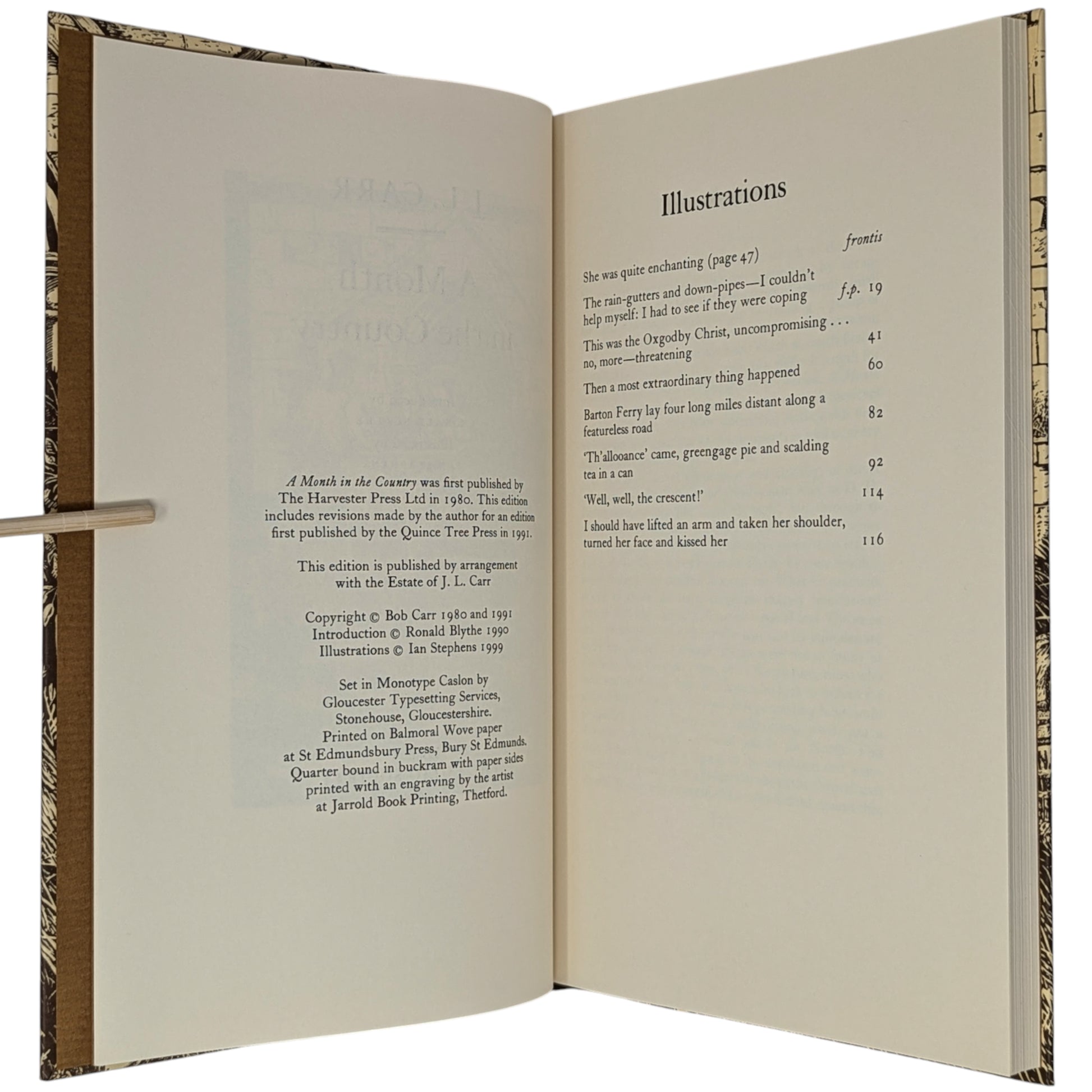 J.L. Carr, A Month in the Country. London: The Folio Society, 1998. First printing thus. Introduced by Ronald Blythe, illustrated by Ian Stephens. 268 × 167 × 15 mm. Pp. [i–ii], [1–6] 7–121 [122–126]: [8] leaves of ‘plates’ (facing pp. [3], 19, 41, 60, 82, 92, 114 and 116). Type: Caslon. Typeset by Gloucester Typesetting, printed by the Saint Edmundsbury Press. Bound by Jarrold in quarter dark brown buckram, cream paper boards with a design in dark brown by Stephens; brown endleaves. Brown slip case. Ian Stephens’s wood-engravings are all full-page, with a detail of one being enlarged for the cover-paper.