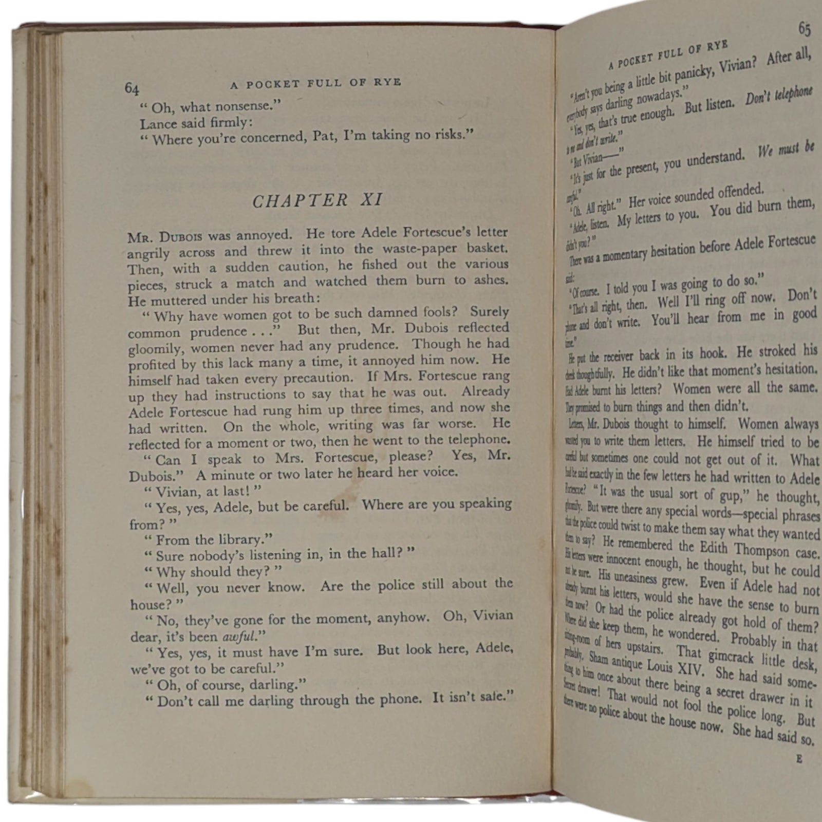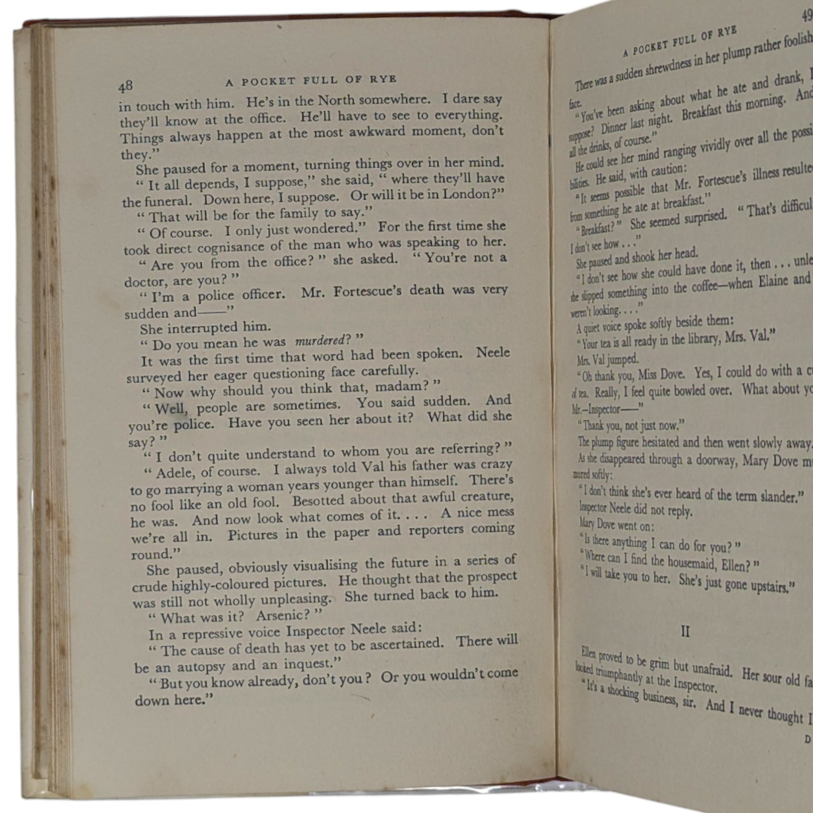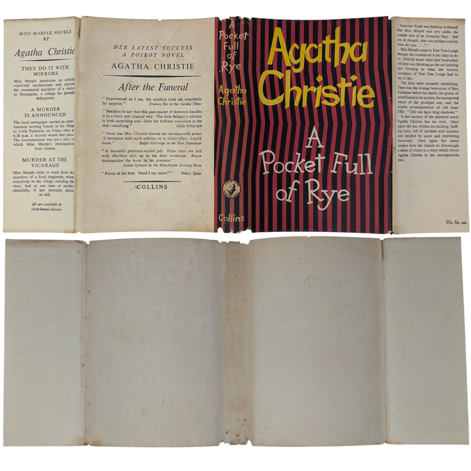 CHRISTIE, Agatha. A Pocket Full of Rye. London: The Crime Club by Collins, 1953. First edition, first impression; with unclipped dust wrapper. 190 x 130 mm approx. 191 pp. Publisher's red cloth, black titles to spine; in original, unclipped dust wrapper showing price 10 s. 6d. net to front flap.