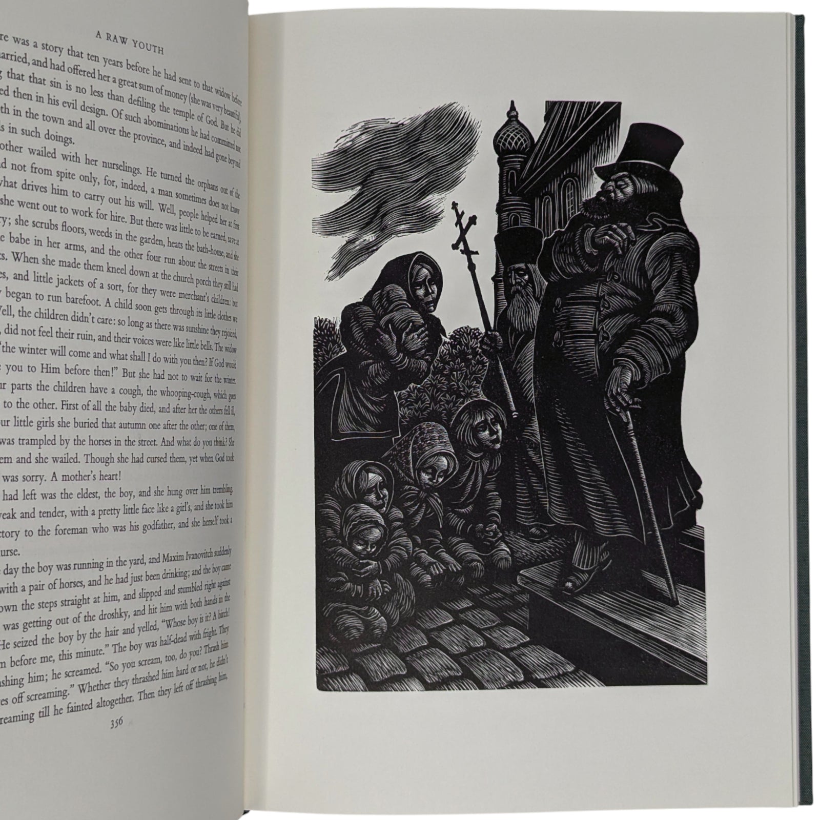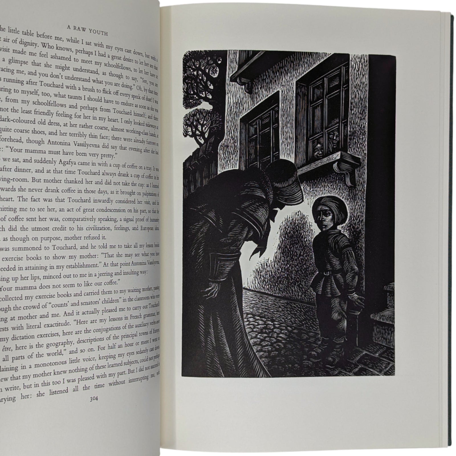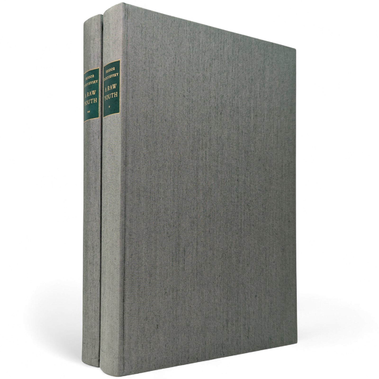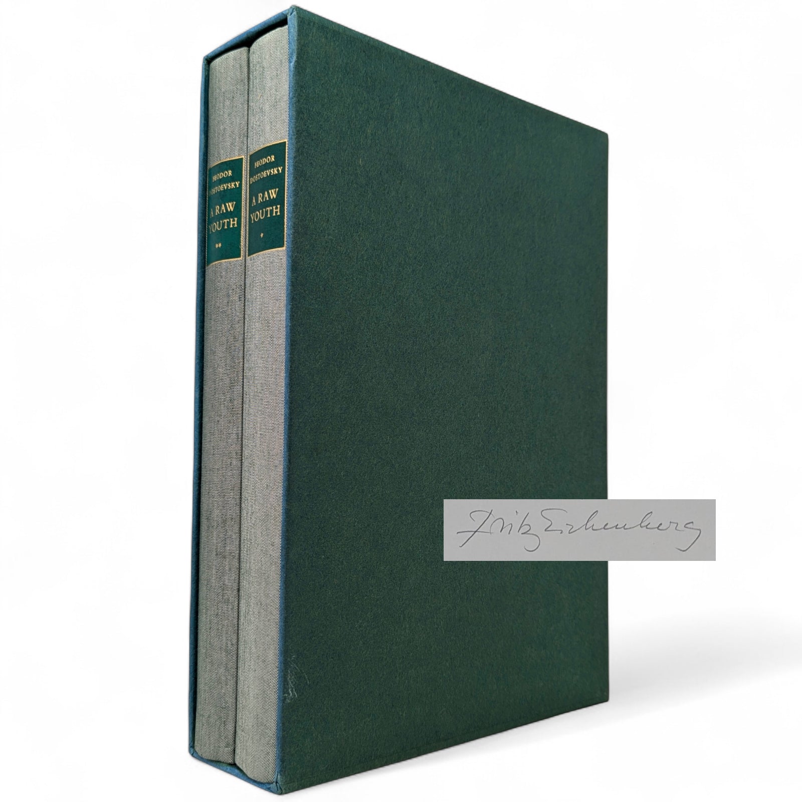 A Raw Youth (The Adolescent) by Fyodor Dostoevsky. New York: The Limited Editions Club, [1974]. (2v.). With 18 full-page wood engravings by Fritz Eichenberg who signed the book. Translated by Constance Garnett. Introduction by Konstantin Mochulsky who is widely considered to have written the best one-volume study of Dostoevsky in any language (Dostoevsky, His Life and Works, published in Russia in 1947 and in English in 1971). Designed by Martino Mardersteig. Printed at the Stamperia Valdonega in Verona, and bound in fine-textured gray-green cloth with a silk finish, spines stamped in pure gold leaf on dark-green panels. Printed on paper that was specially made for this edition by the mill of Cartiere Enrico Magnani in Pescia, Italy. Green slipcase with cream paper title label on edge. 576pp. 28.5x20.5cm. Limited to 2000 copies, out of which this is copy number 1500.