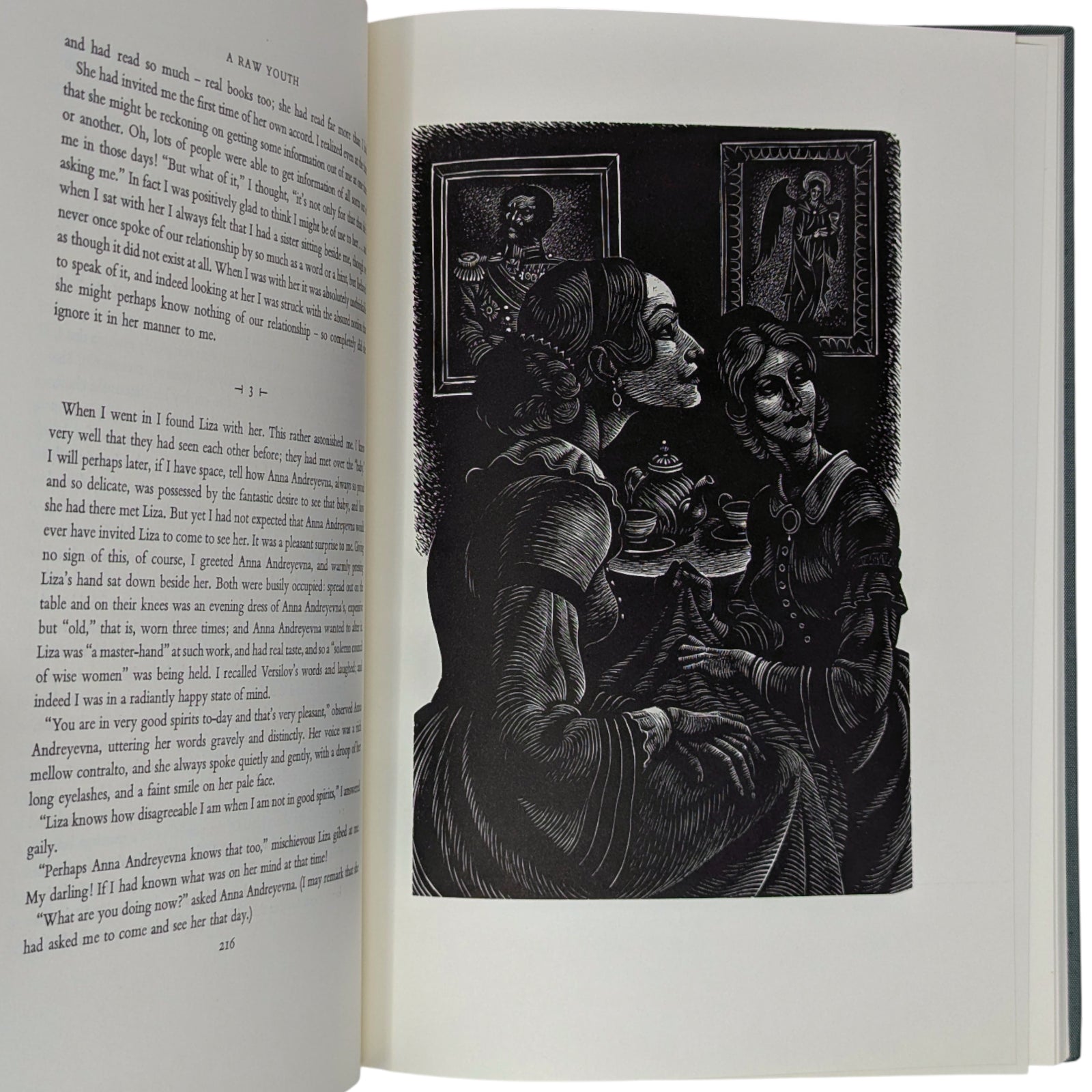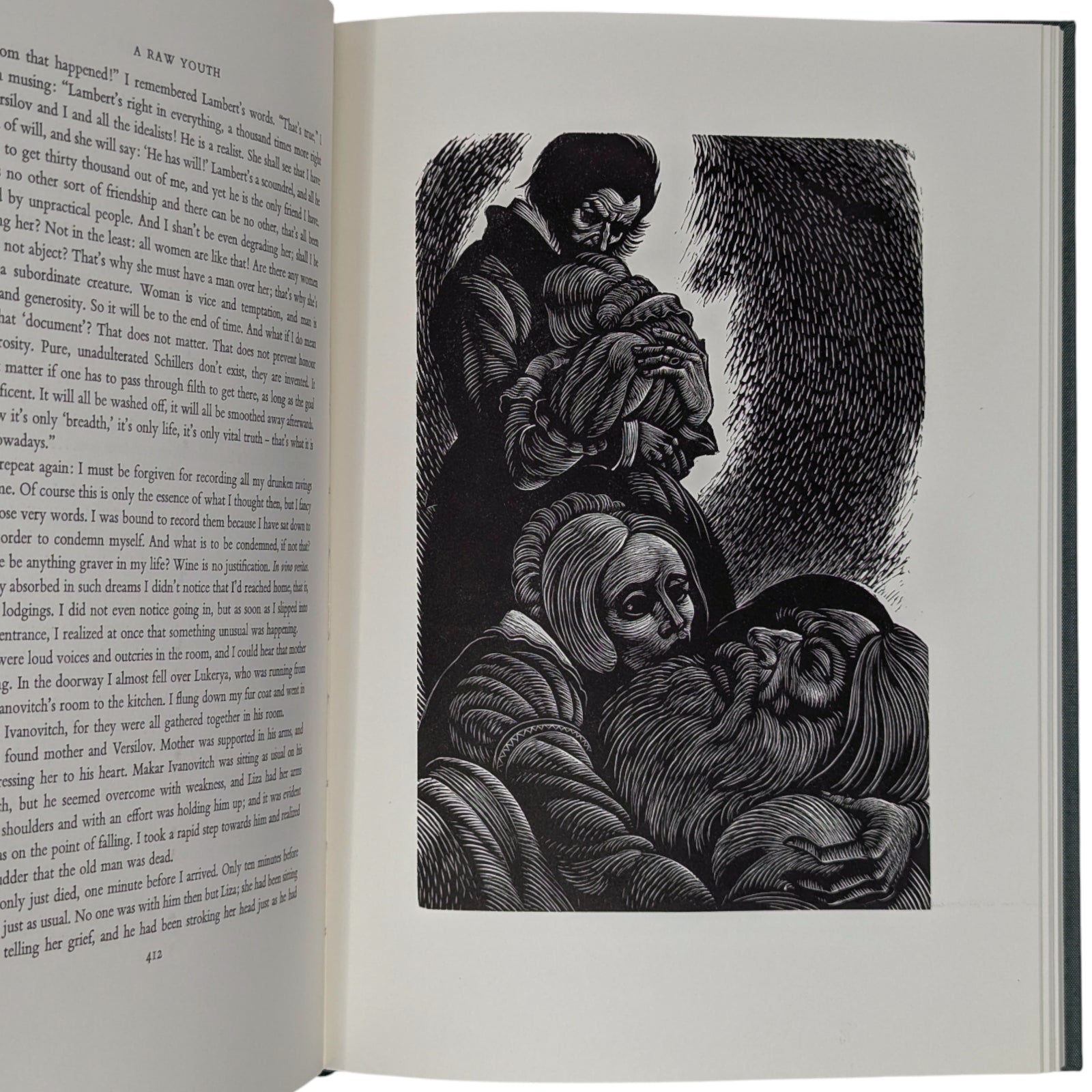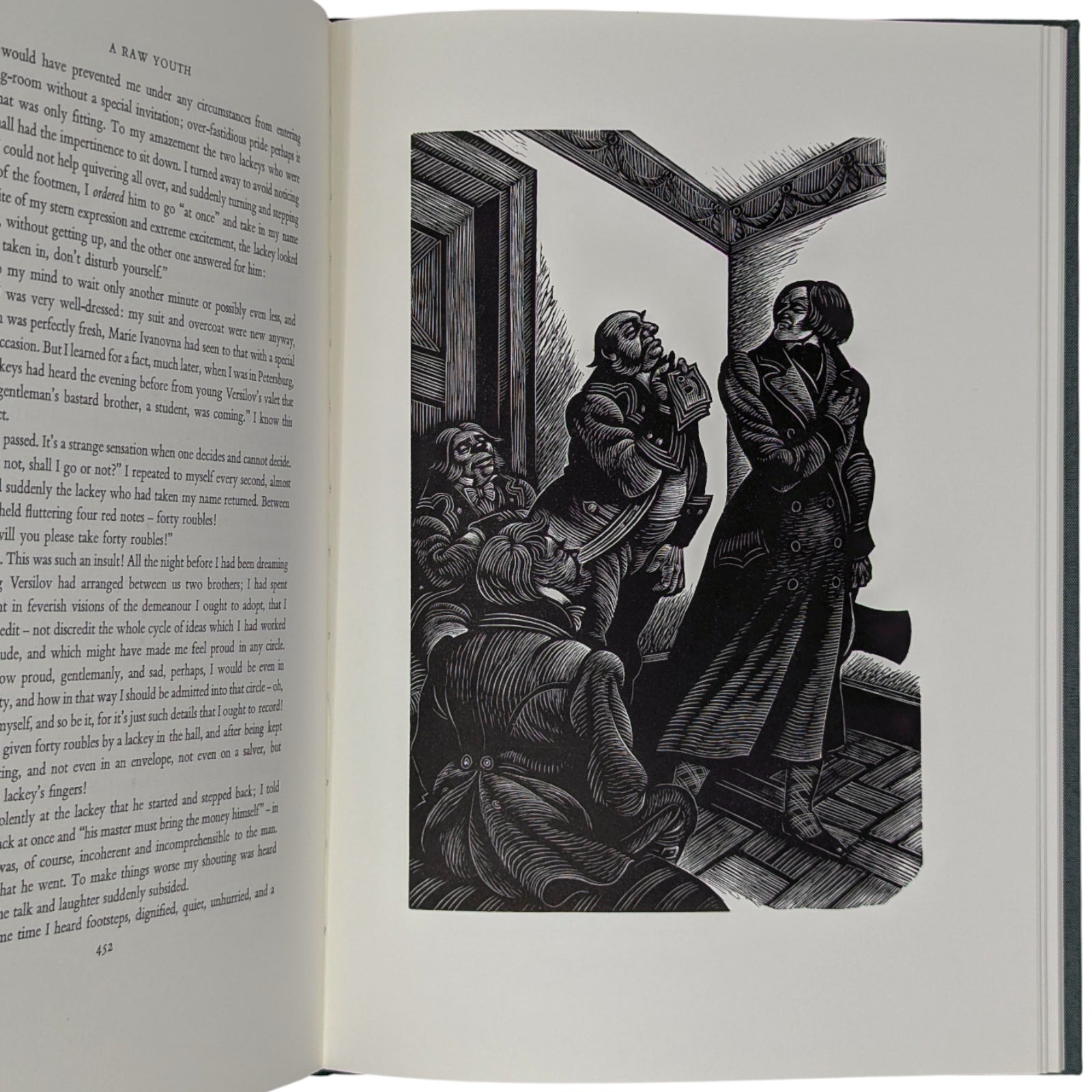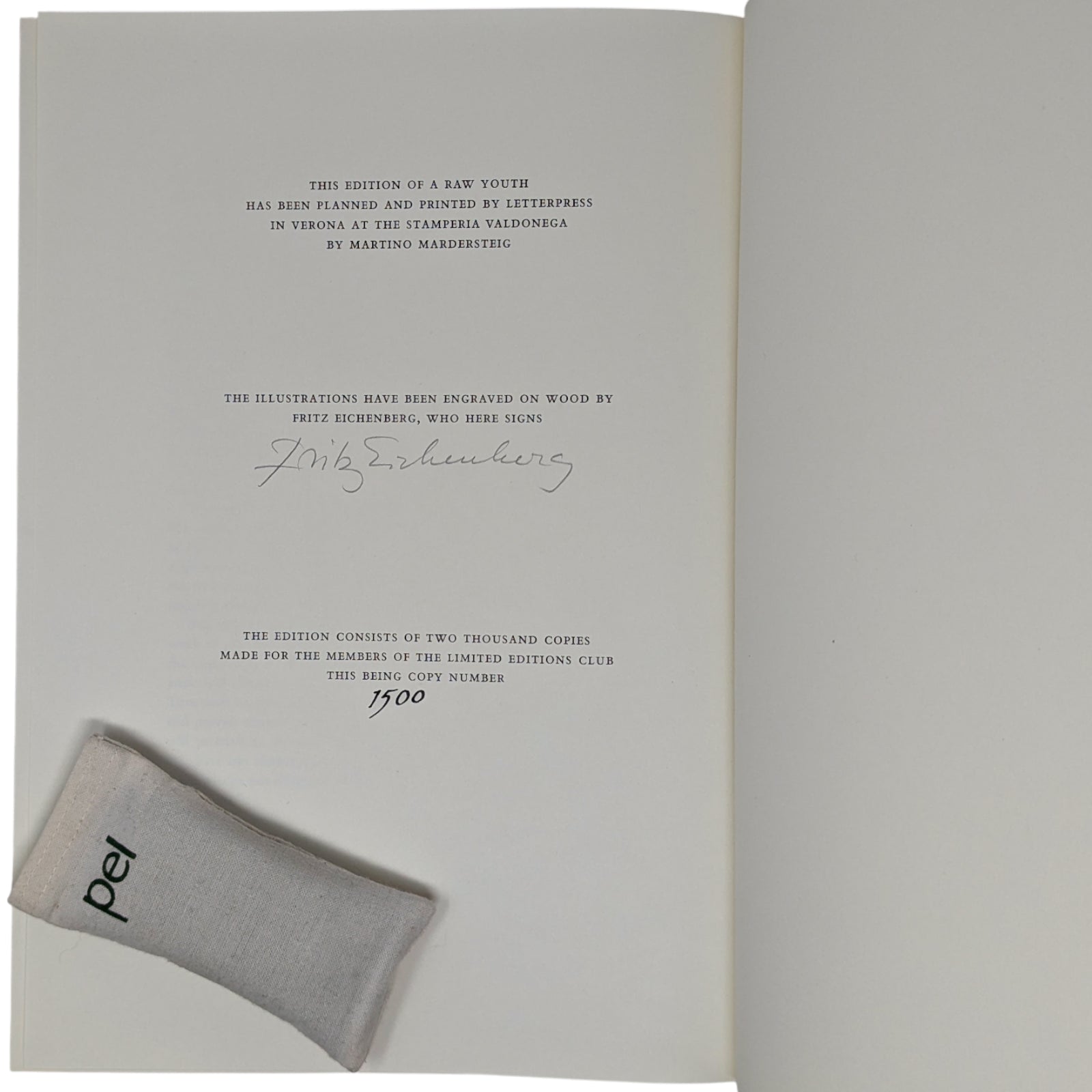 A Raw Youth (The Adolescent) by Fyodor Dostoevsky. New York: The Limited Editions Club, [1974]. (2v.). With 18 full-page wood engravings by Fritz Eichenberg who signed the book. Translated by Constance Garnett. Introduction by Konstantin Mochulsky who is widely considered to have written the best one-volume study of Dostoevsky in any language (Dostoevsky, His Life and Works, published in Russia in 1947 and in English in 1971). Designed by Martino Mardersteig. Printed at the Stamperia Valdonega in Verona, and bound in fine-textured gray-green cloth with a silk finish, spines stamped in pure gold leaf on dark-green panels. Printed on paper that was specially made for this edition by the mill of Cartiere Enrico Magnani in Pescia, Italy. Green slipcase with cream paper title label on edge. 576pp. 28.5x20.5cm. Limited to 2000 copies, out of which this is copy number 1500.