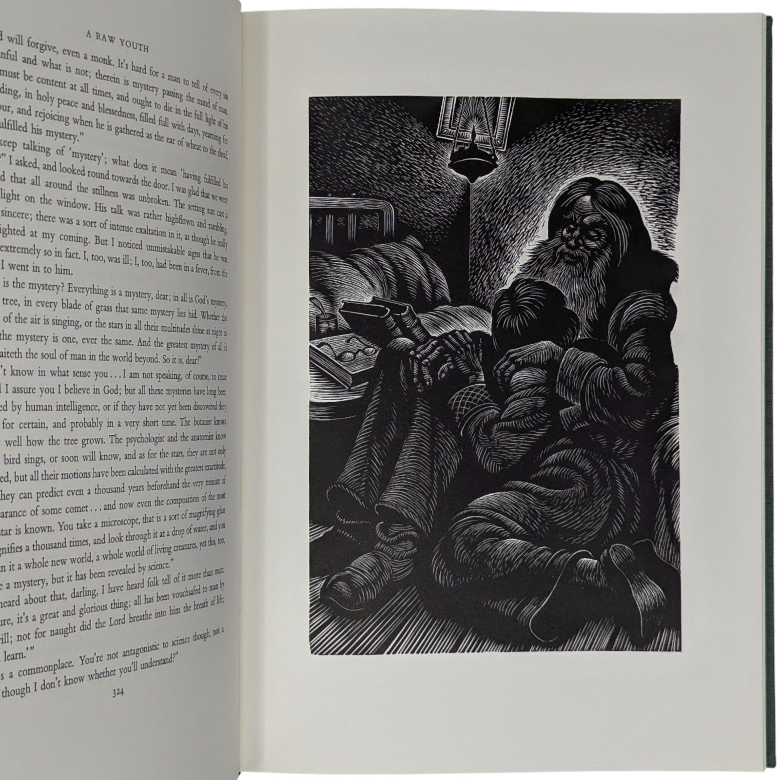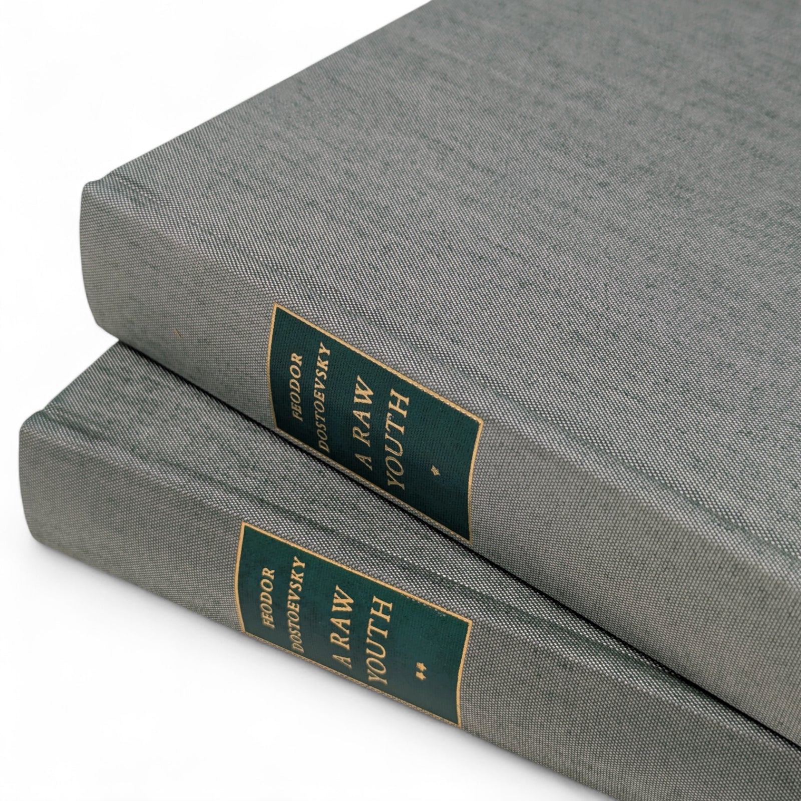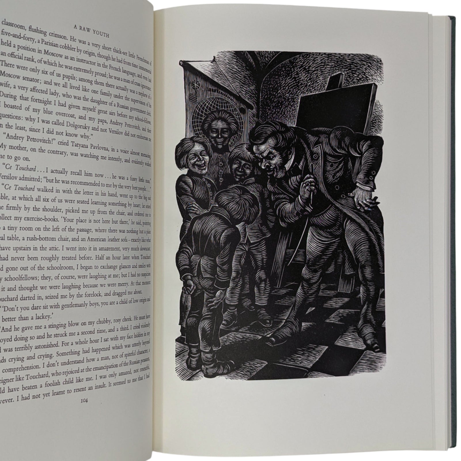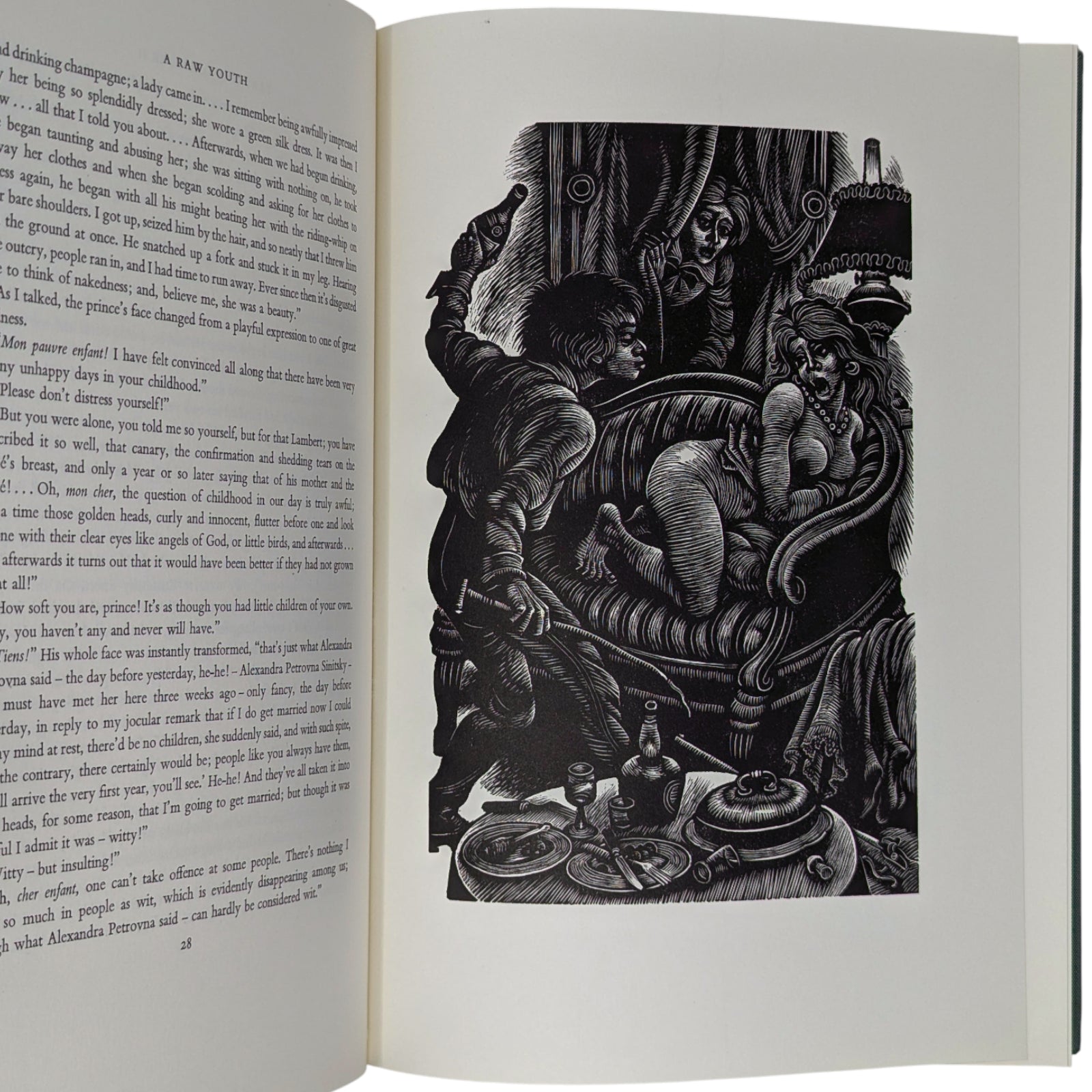 A Raw Youth (The Adolescent) by Fyodor Dostoevsky. New York: The Limited Editions Club, [1974]. (2v.). With 18 full-page wood engravings by Fritz Eichenberg who signed the book. Translated by Constance Garnett. Introduction by Konstantin Mochulsky who is widely considered to have written the best one-volume study of Dostoevsky in any language (Dostoevsky, His Life and Works, published in Russia in 1947 and in English in 1971). Designed by Martino Mardersteig. Printed at the Stamperia Valdonega in Verona, and bound in fine-textured gray-green cloth with a silk finish, spines stamped in pure gold leaf on dark-green panels. Printed on paper that was specially made for this edition by the mill of Cartiere Enrico Magnani in Pescia, Italy. Green slipcase with cream paper title label on edge. 576pp. 28.5x20.5cm. Limited to 2000 copies, out of which this is copy number 1500.