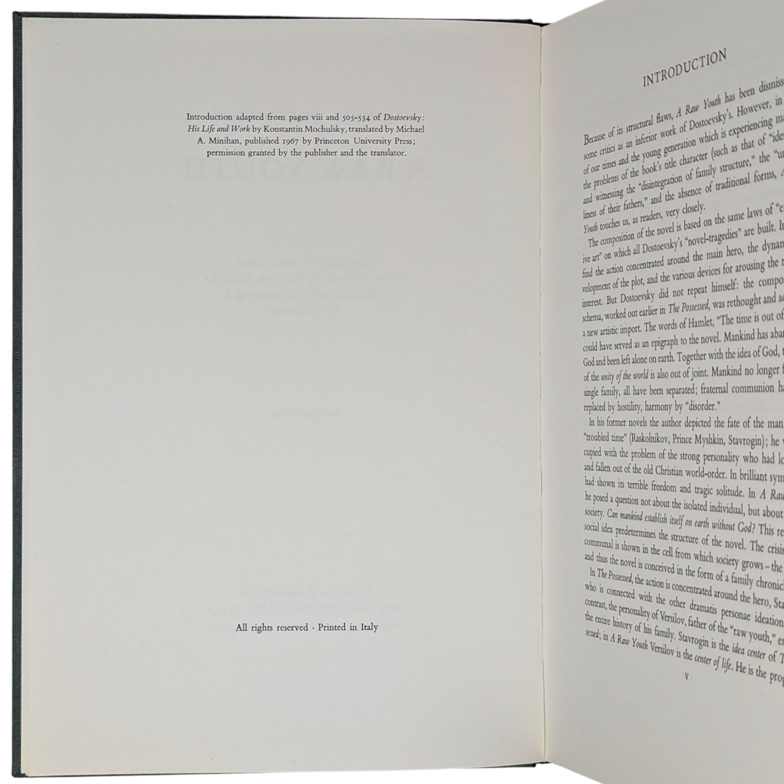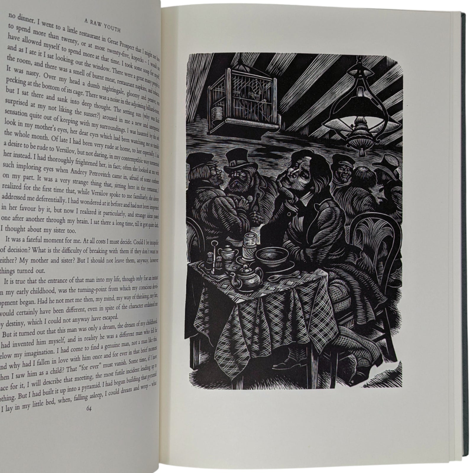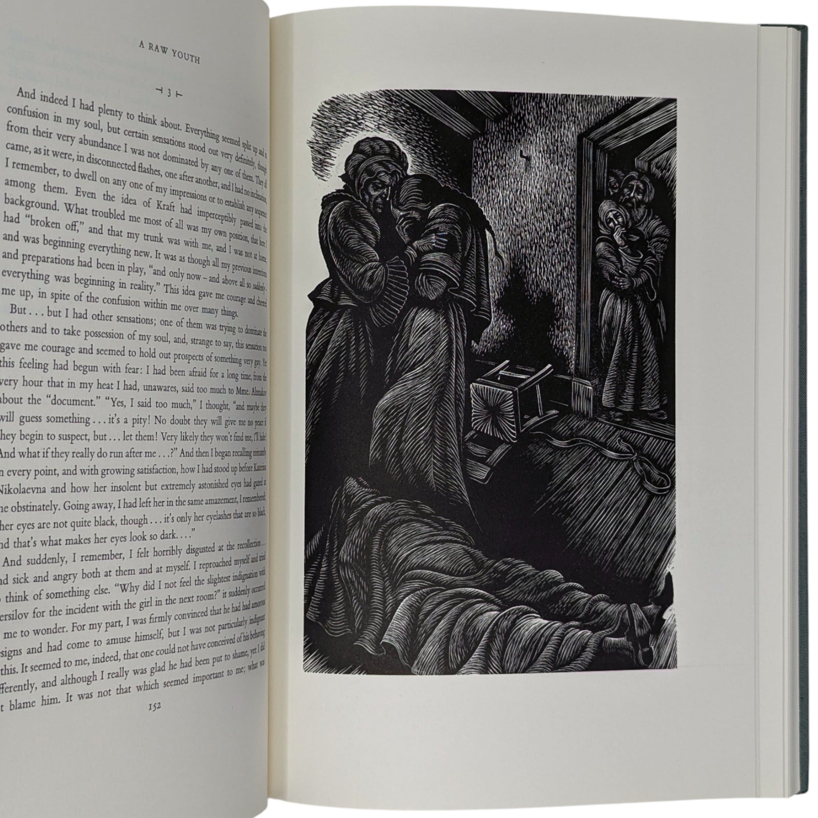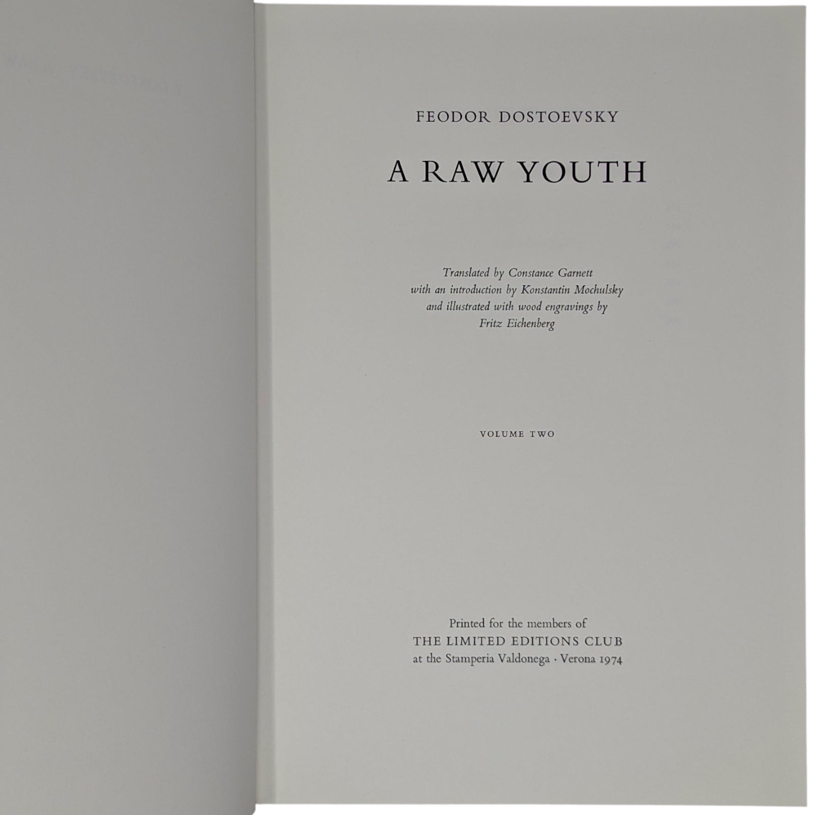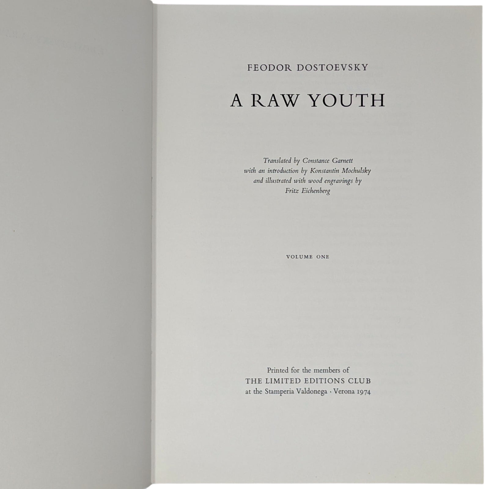 One of Dostoevsky's most underestimated works, the Directors of the Limited Editions Club said in their letter to members dated 1974 that "A Raw Youth [has a] strong contemporary import" and "is worthy of Stamperia Valdonega realization in these two imposing volumes" which, together with "the vital art of Fritz Eichenberg make this a notable addition to the collection of The Limited Editions Club". This is the story of young and conflicted Arkady Dolgoruky who struggles with his ideals and ambitions as he seeks wealth, power, and identity in a society rife with moral ambiguity and personal turmoil.