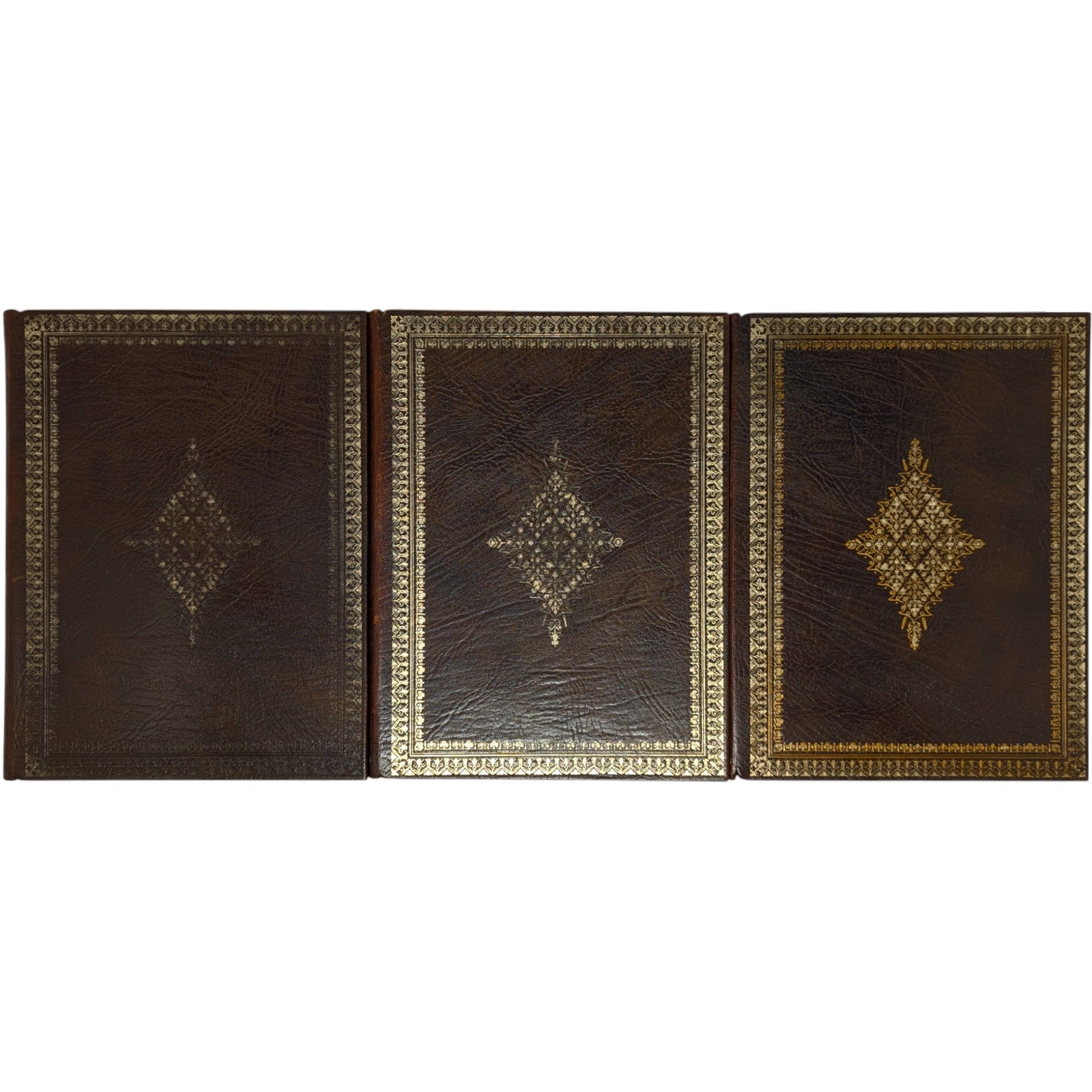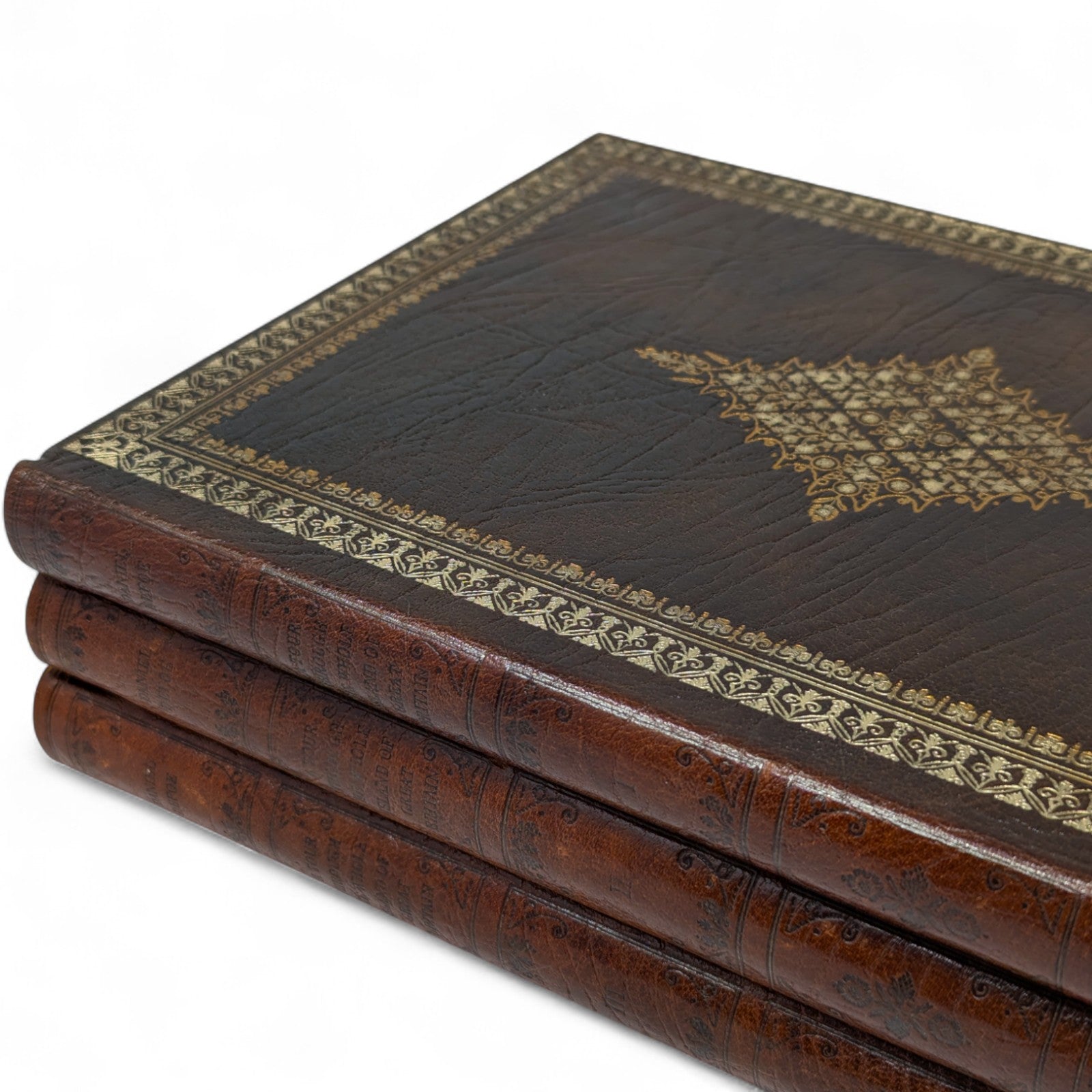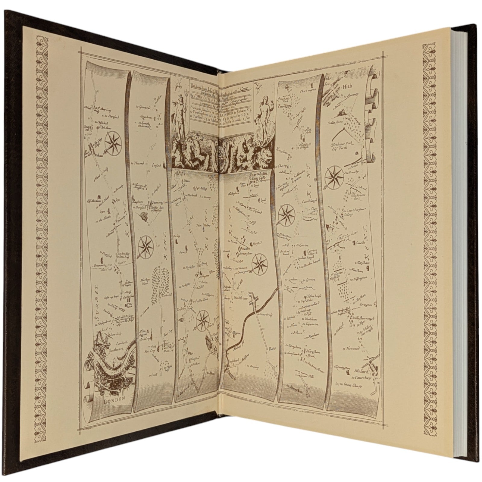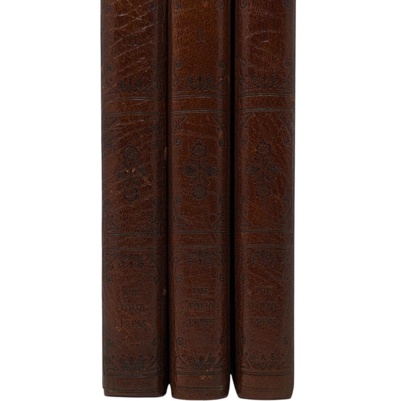 Defoe’s great topographical work was first published in three volumes in 1724, 1725 and 1726. The text is arranged county-by-county, with volume I containing East Anglia, the South-Eastern counties and Land’s End to London, volume II the City of London, West Wales and the Midlands, and volume III the North Midlands, Yorkshire, North-East England and Scotland. In the present edition the text is illustrated with contemporary prints, drawings and paintings (there are 37 in volume I, 33 in volume II and 32 in volume III); the endleaves reproduce some of John Ogilby’s etched road maps. Unlike the standard edition where the slipcase has another etching printed on it, the slipcase of this edition is fully bound in plain cloth. As the work was printed on ‘art’ paper, the set is remarkably heavy for its size. The binding is based on a design of 1721 attributed to Christopher Chapman. Although the title-page imprint is ‘London: The Folio Society’, the spine of the binding of each volume has ‘The Folio Press’ imprint. A very small number of copies (unnumbered and with no known limitation) was offered in a special binding of full dark brown morocco, in a dark brown cloth-covered slip case, of which this is one.