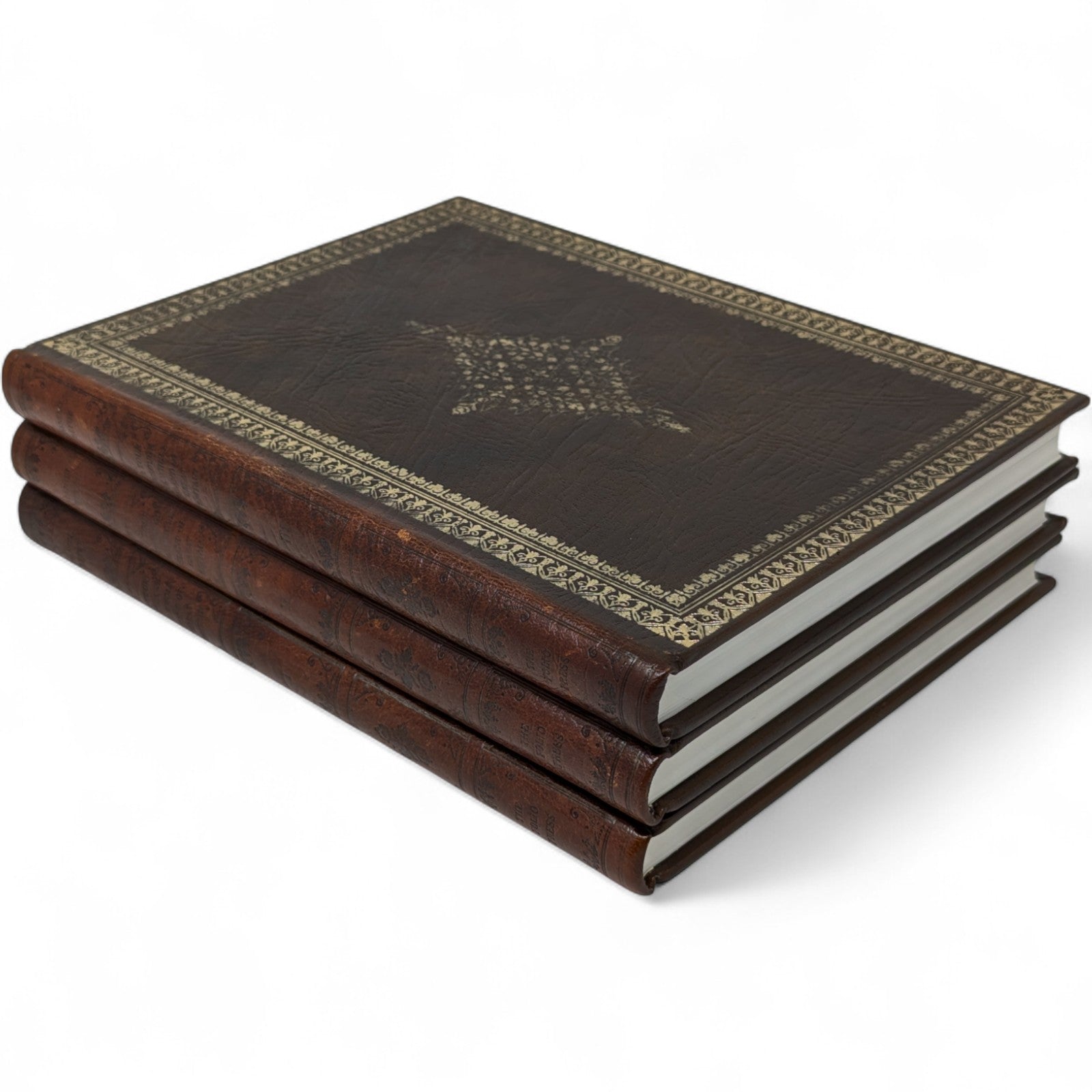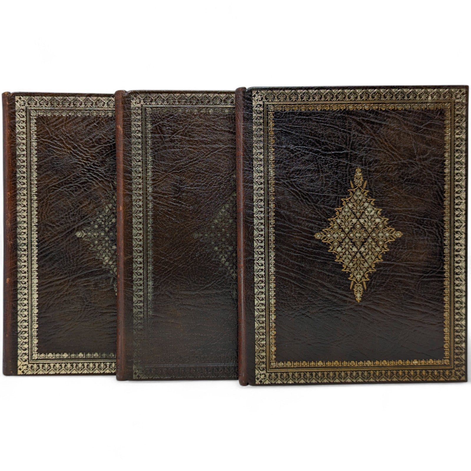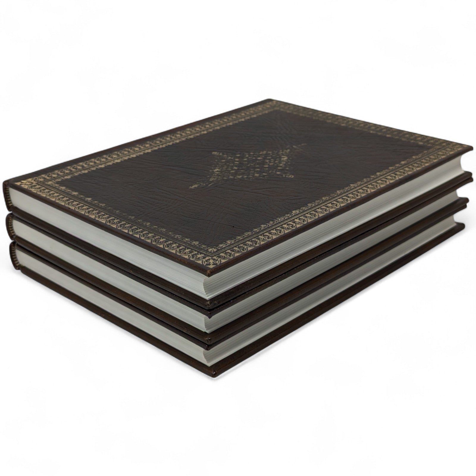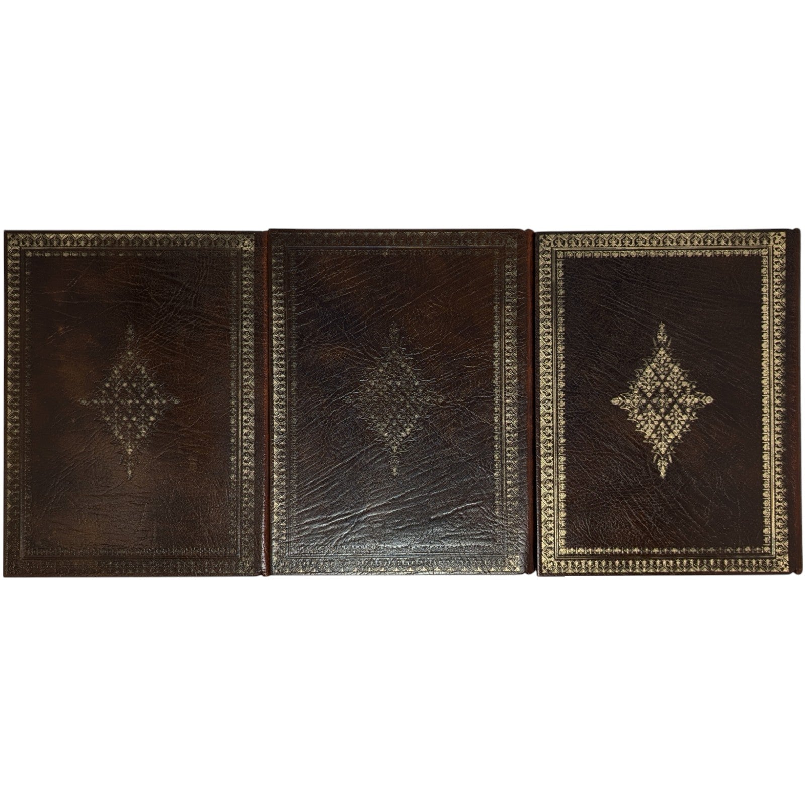 Defoe’s great topographical work was first published in three volumes in 1724, 1725 and 1726. The text is arranged county-by-county, with volume I containing East Anglia, the South-Eastern counties and Land’s End to London, volume II the City of London, West Wales and the Midlands, and volume III the North Midlands, Yorkshire, North-East England and Scotland. In the present edition the text is illustrated with contemporary prints, drawings and paintings (there are 37 in volume I, 33 in volume II and 32 in volume III); the endleaves reproduce some of John Ogilby’s etched road maps. Unlike the standard edition where the slipcase has another etching printed on it, the slipcase of this edition is fully bound in plain cloth. As the work was printed on ‘art’ paper, the set is remarkably heavy for its size. The binding is based on a design of 1721 attributed to Christopher Chapman. Although the title-page imprint is ‘London: The Folio Society’, the spine of the binding of each volume has ‘The Folio Press’ imprint. A very small number of copies (unnumbered and with no known limitation) was offered in a special binding of full dark brown morocco, in a dark brown cloth-covered slip case, of which this is one.