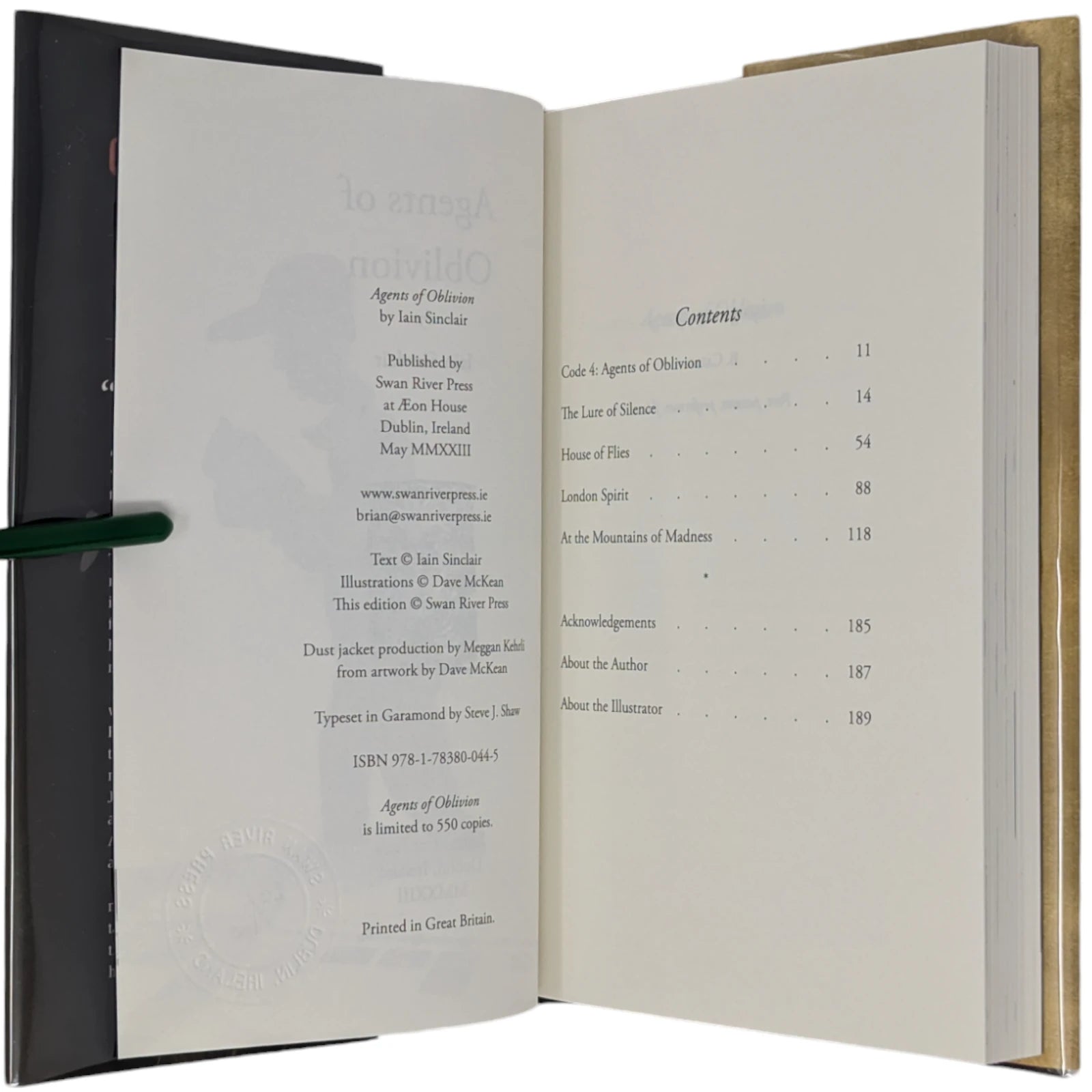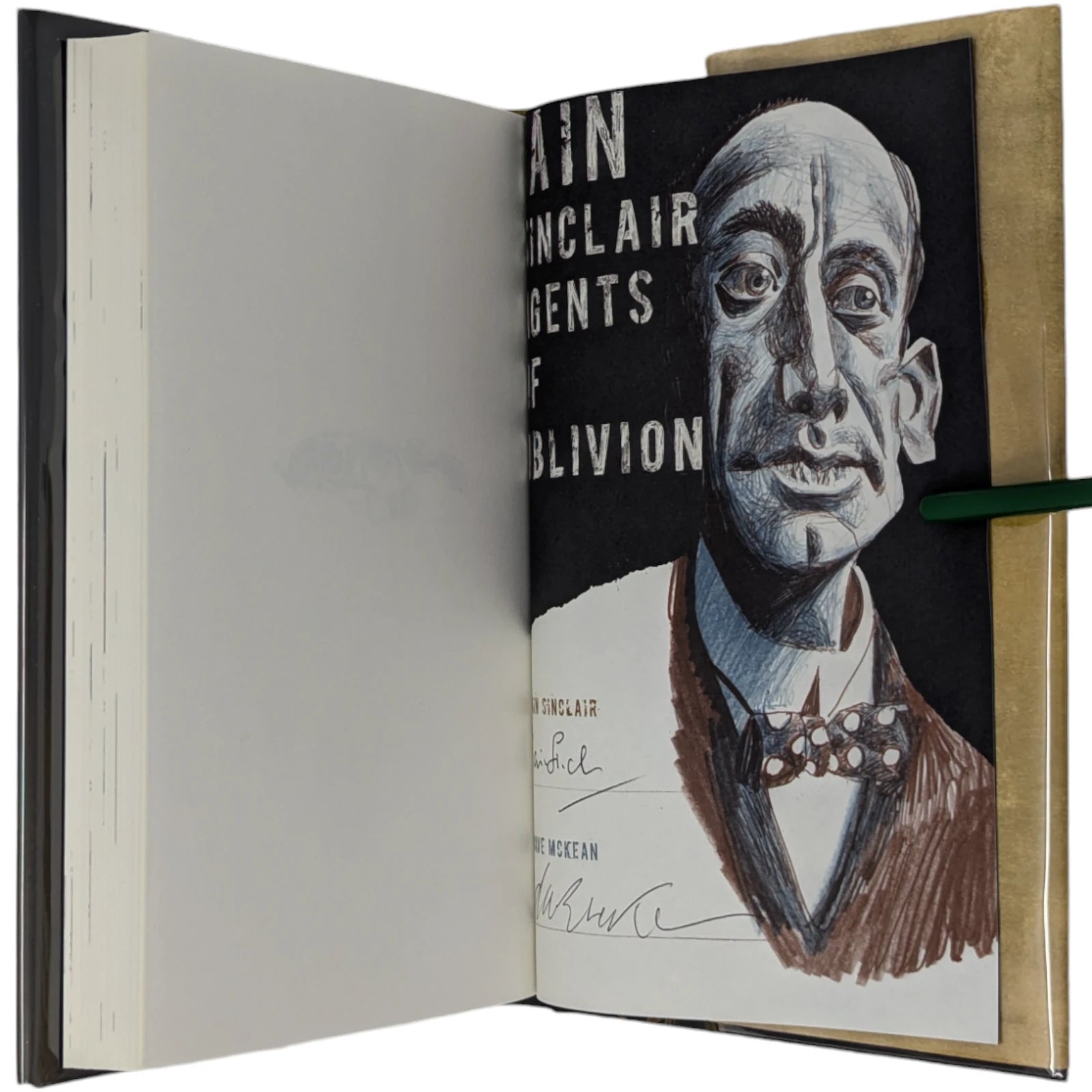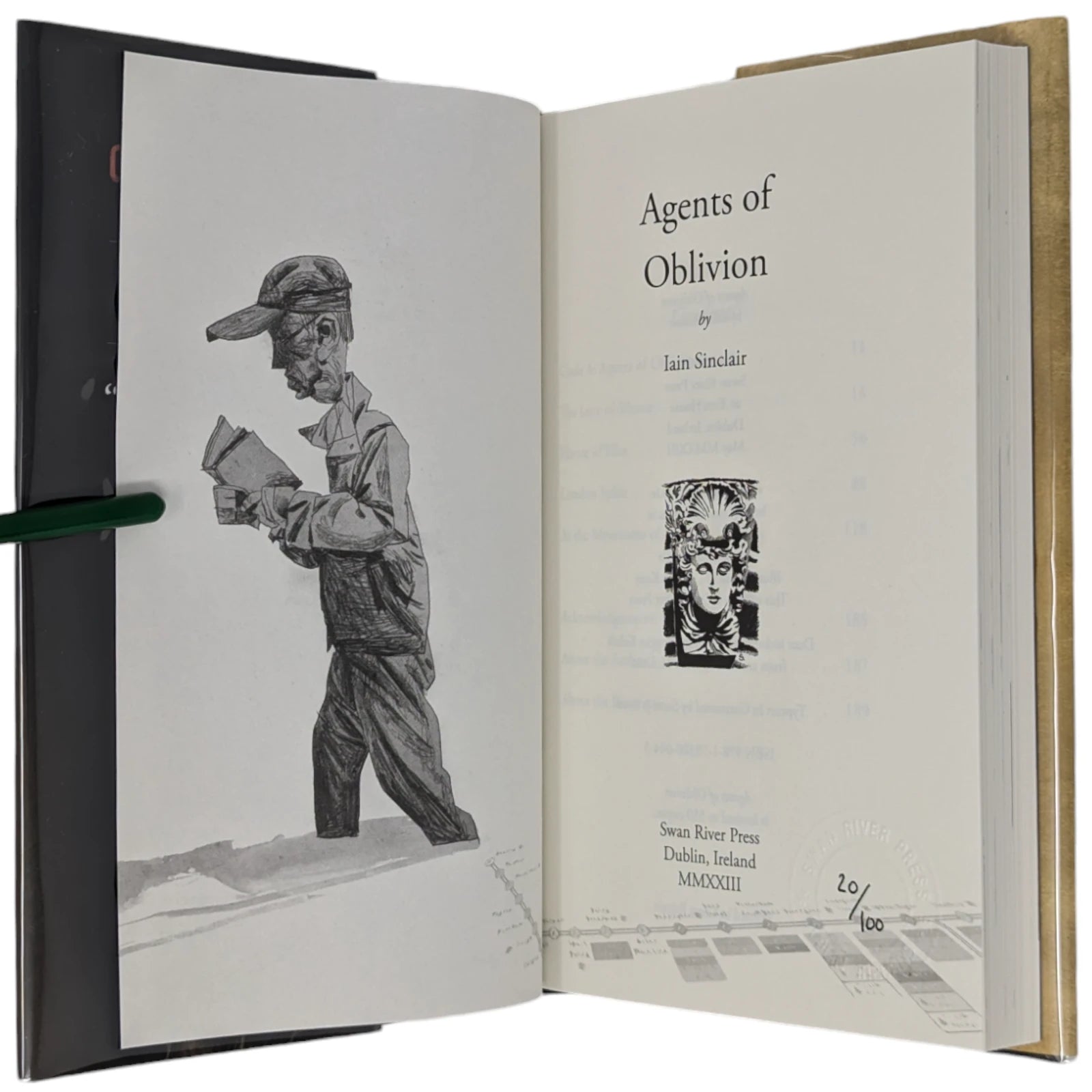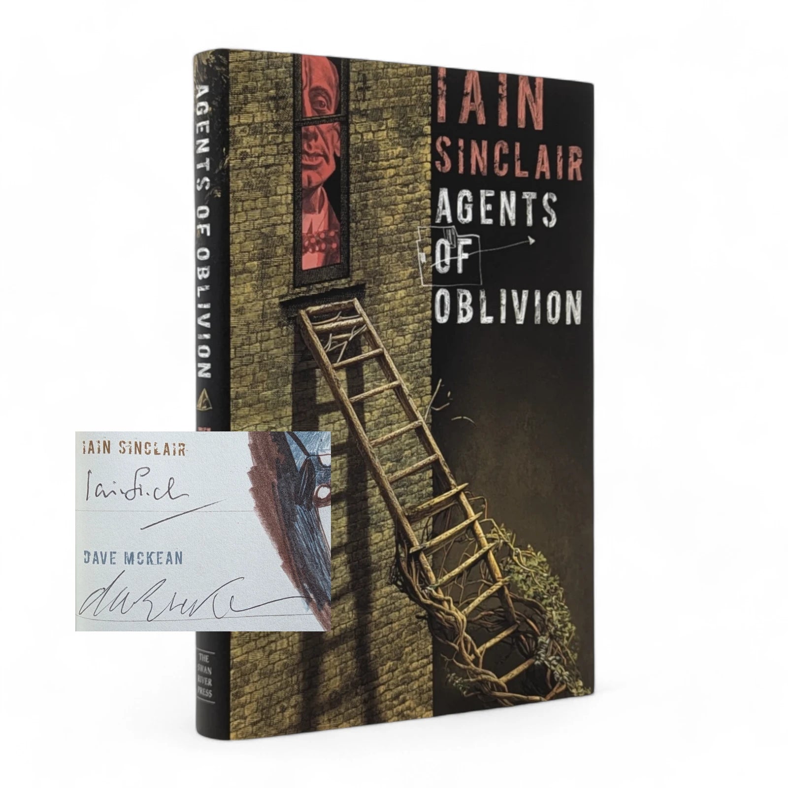 Agents of Oblivion by Iain Sinclair. Dublin: Swan River Press, 2023. Hardback edition limited to 550 copies out of which the first 100 were embossed and hand-numbered. This is number 20, embossed and hand-numbered to title page. Signed by both author Iain Sinclair and illustrator Dave McKean. Now out of print as a hardback. Rare to find one of the first 100.