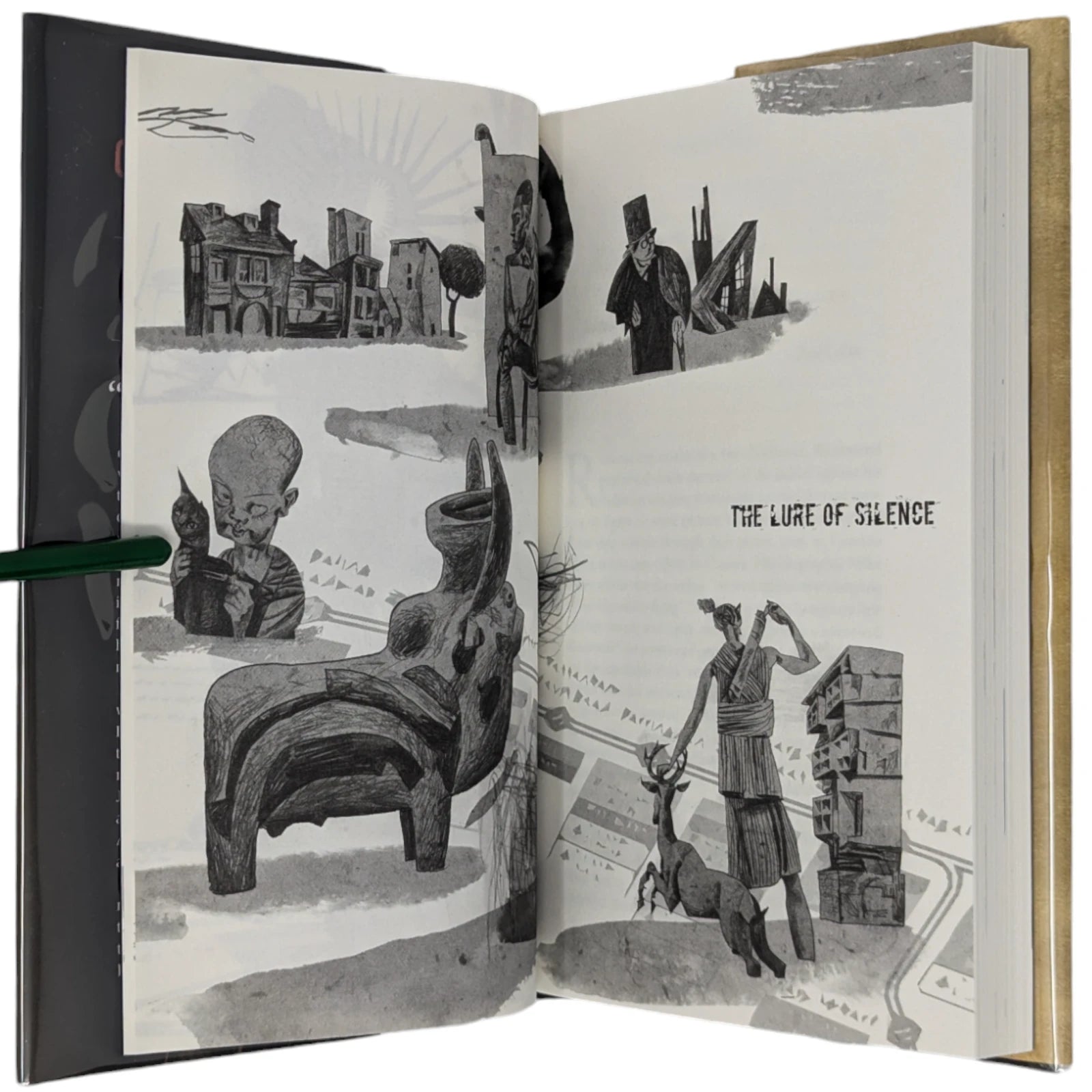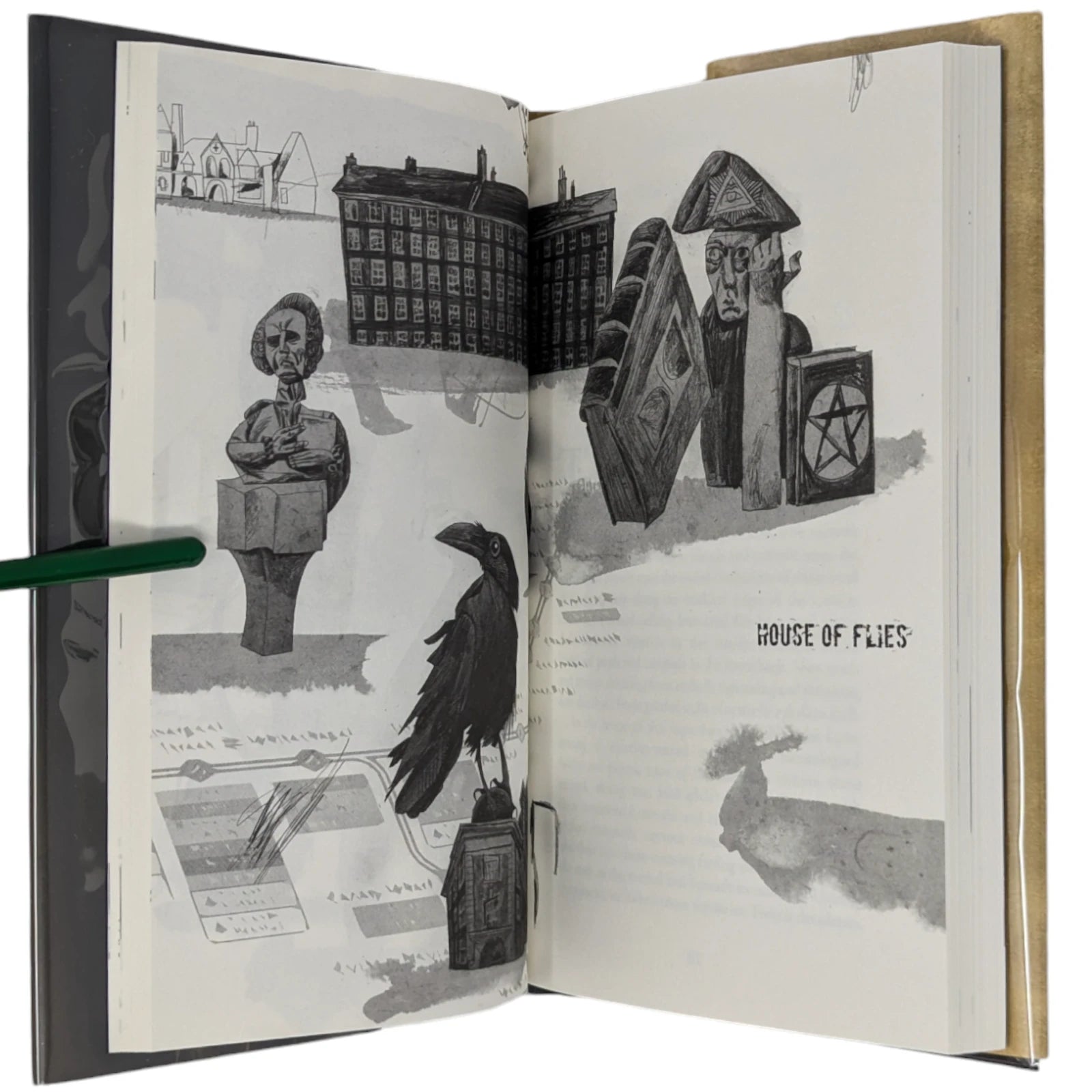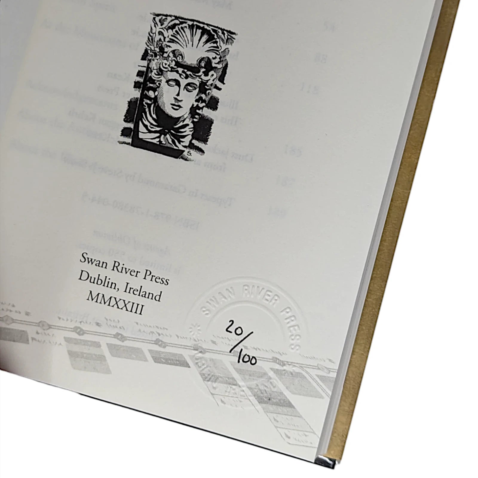 Cover art and interior illustrations by Dave McKean; jacket production by Meggan Kehrli; edited by Brian J. Showers and Timothy J. Jarvis; copyedited by Jim Rockhill; typeset by Steve J. Shaw; published by Swan River Press at Æon House. Published on 3 May 2023; signed by Iain Sinclair and Dave McKean; 191 pages; lithographically printed on 90 gsm paper; dust jacketed; illustrated Wibalin boards; sewn binding; head- and tail-bands; ISBN: 978-1-78380-044-5.