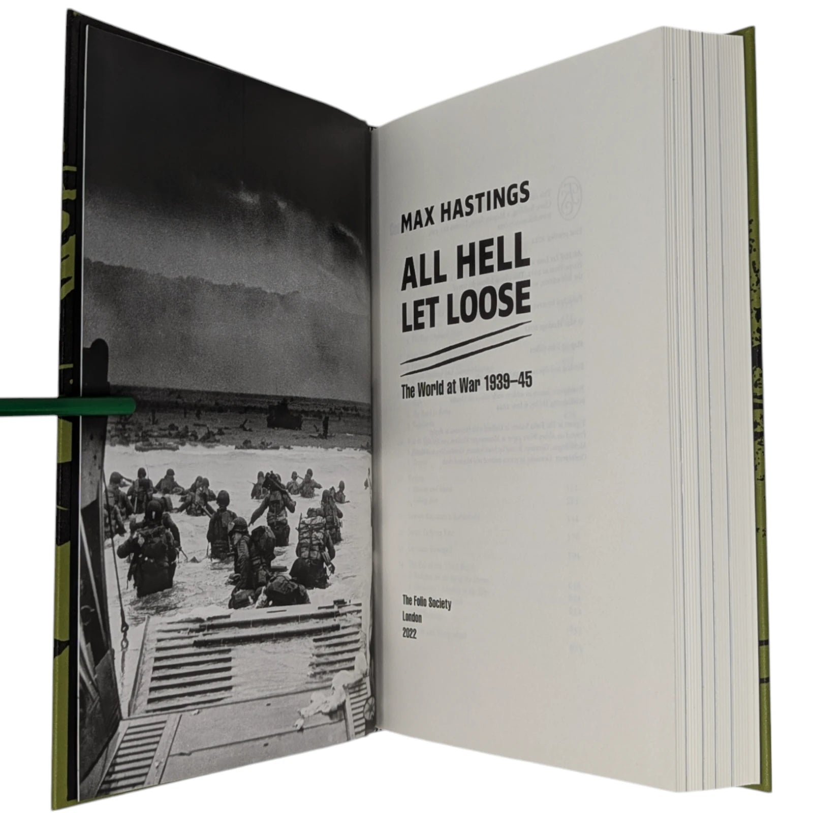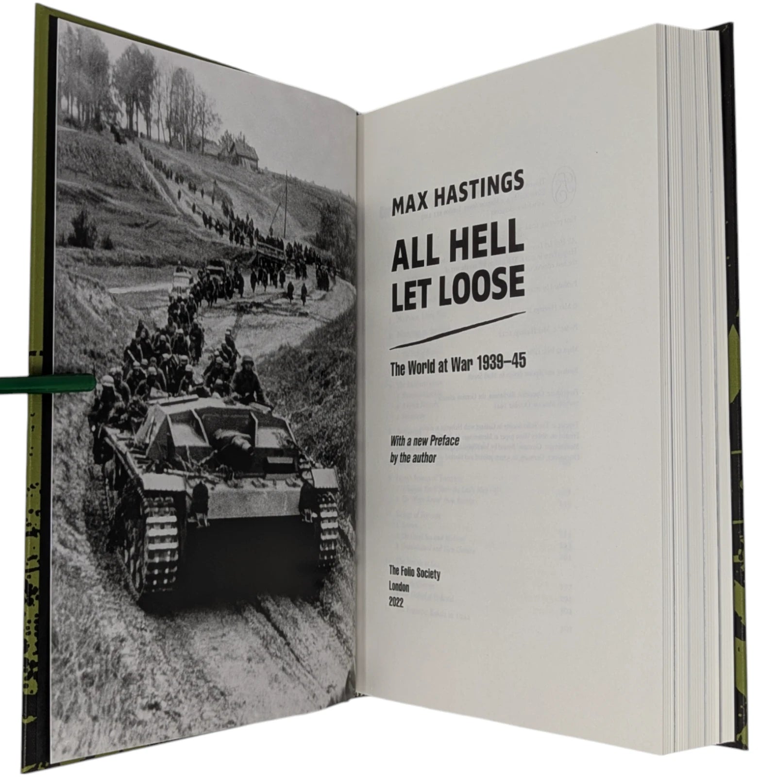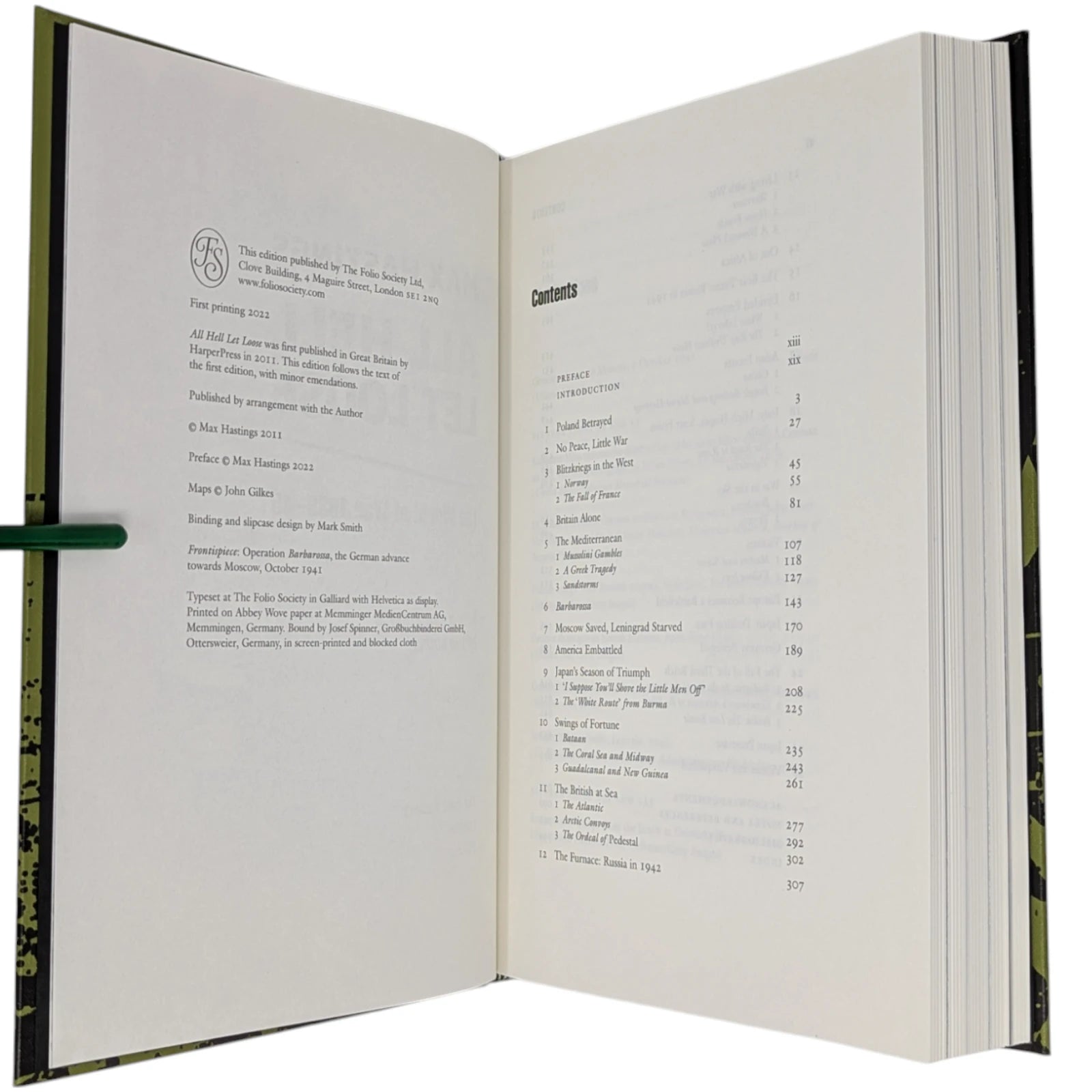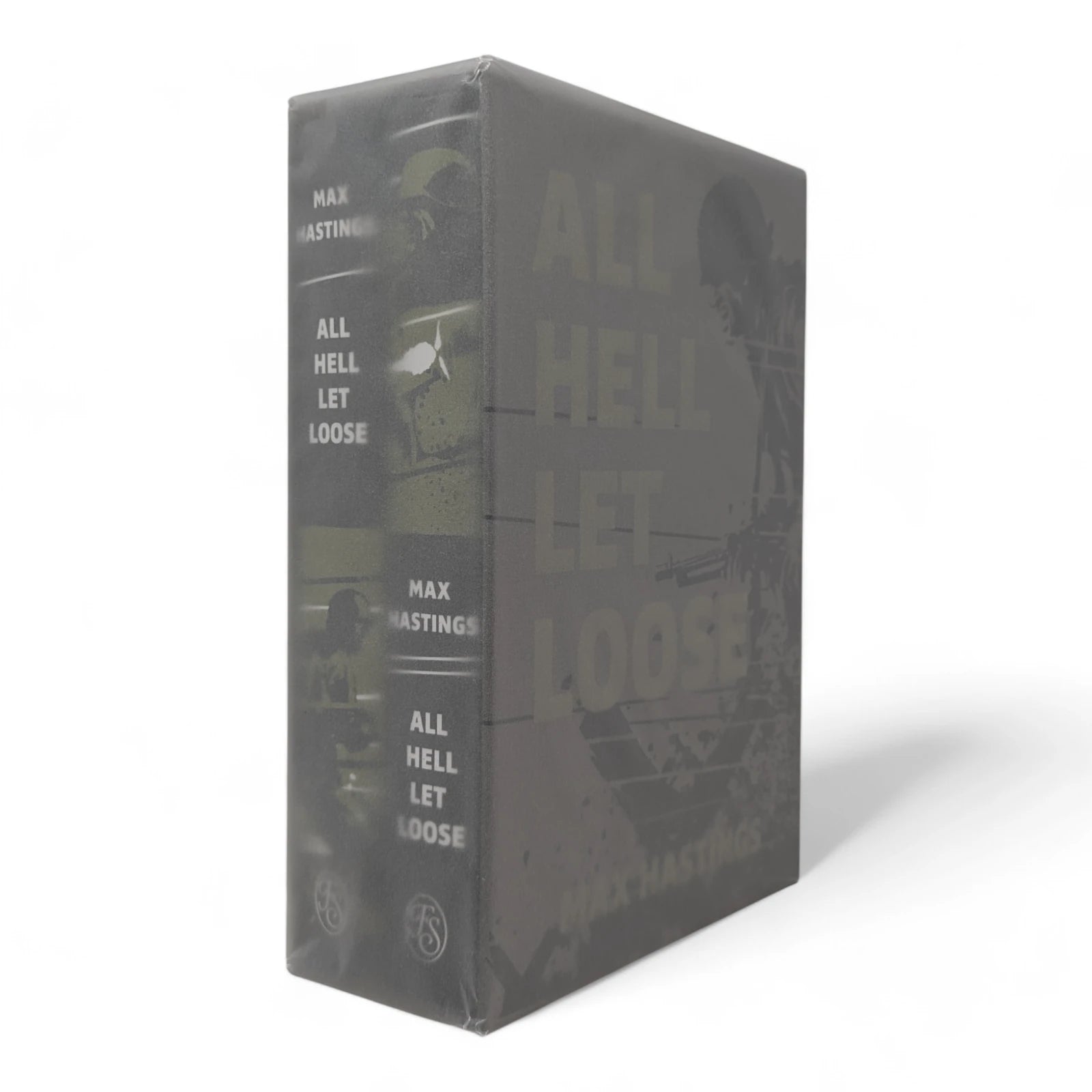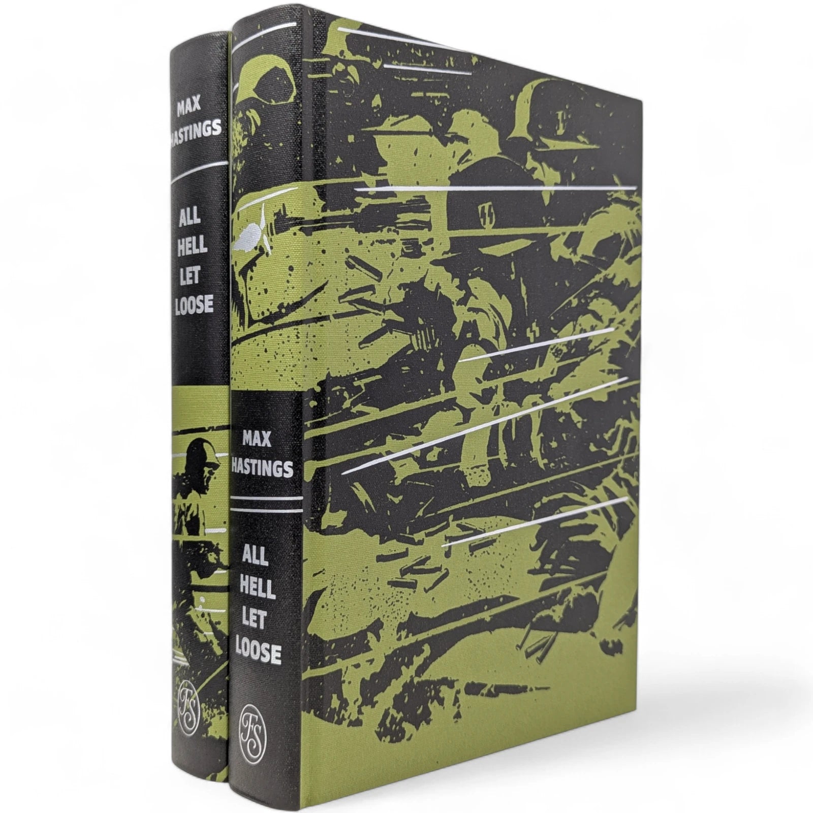 All Hell Let Loose, Max Hastings. London: The Folio Society, 2022. First printing thus. 250 × 178 × 35–36 mm. 2 vols (see below). Type: Galliard with Helvetica for display. Printed by Memminger MedienCentrum. Bound by Josef Spinner in full green cloth printed in black and blocked in silver (a different design by Mark Smith for each volume); black endleaves. Grey cloth two-volume slip case titled (as above) in pale green and illustration in black by Smith. Plates reproduce photographs from the period and ten maps by John Gilkes are in each volume. The two volumes are as follows: