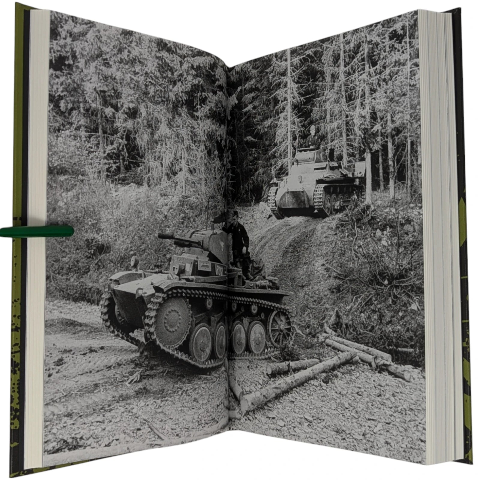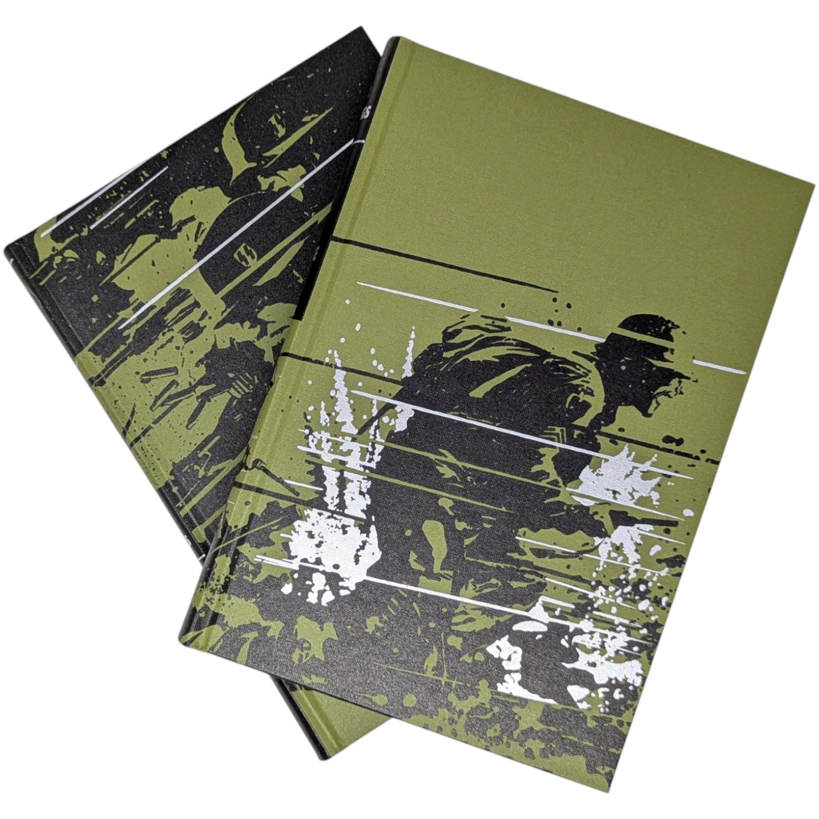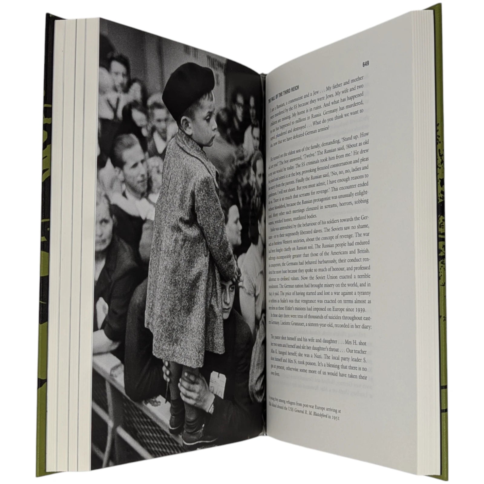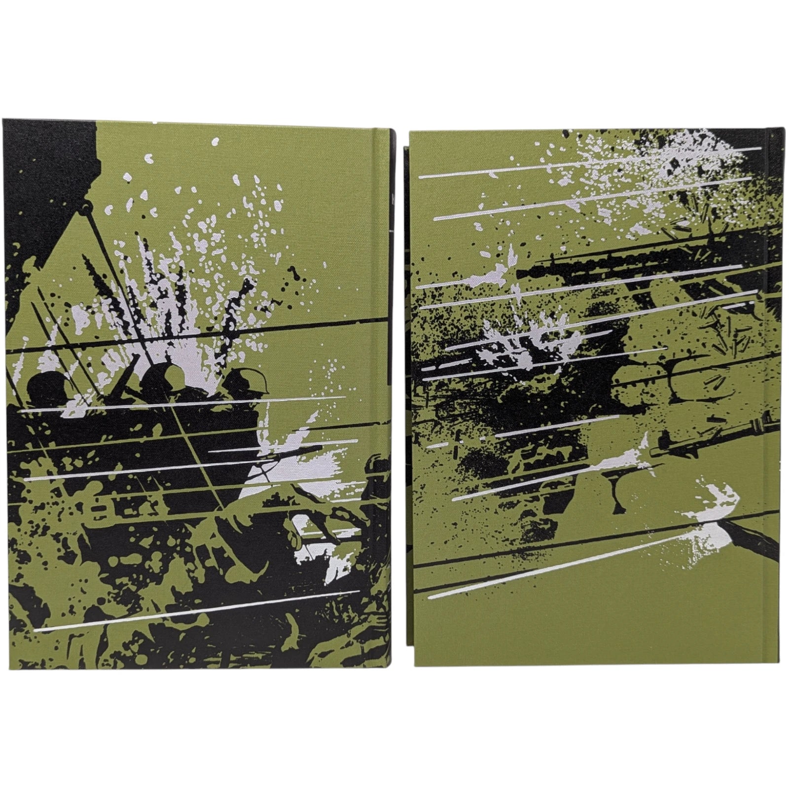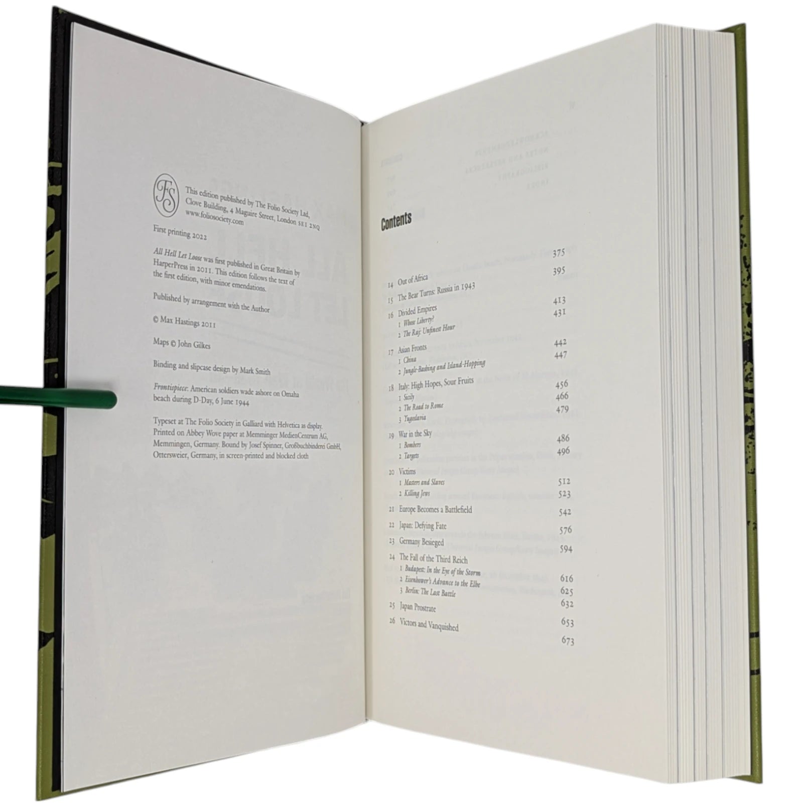All Hell Let Loose, Max Hastings. London: The Folio Society, 2022. First printing thus. 250 × 178 × 35–36 mm. 2 vols (see below). Type: Galliard with Helvetica for display. Printed by Memminger MedienCentrum. Bound by Josef Spinner in full green cloth printed in black and blocked in silver (a different design by Mark Smith for each volume); black endleaves. Grey cloth two-volume slip case titled (as above) in pale green and illustration in black by Smith. Plates reproduce photographs from the period and ten maps by John Gilkes are in each volume. The two volumes are as follows: