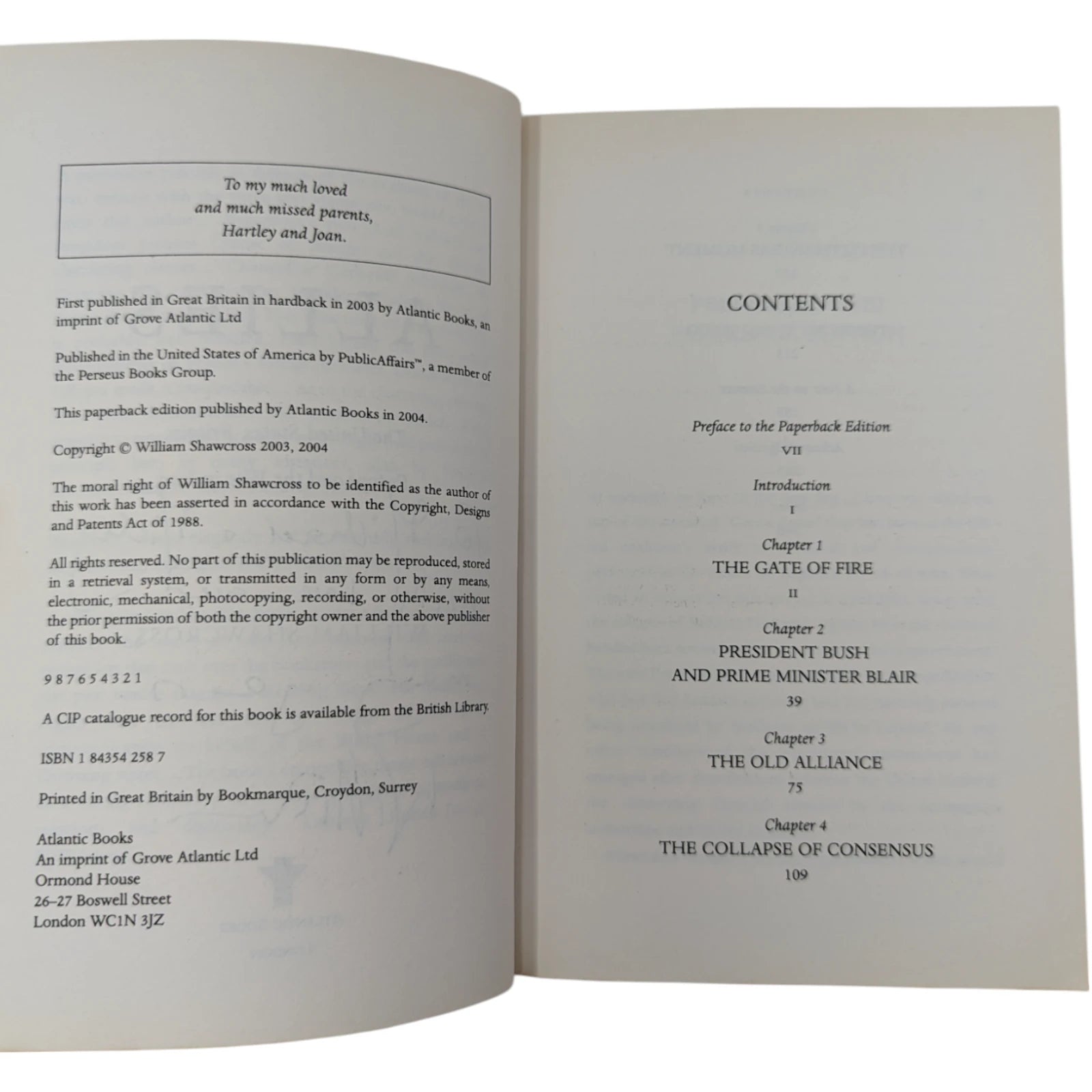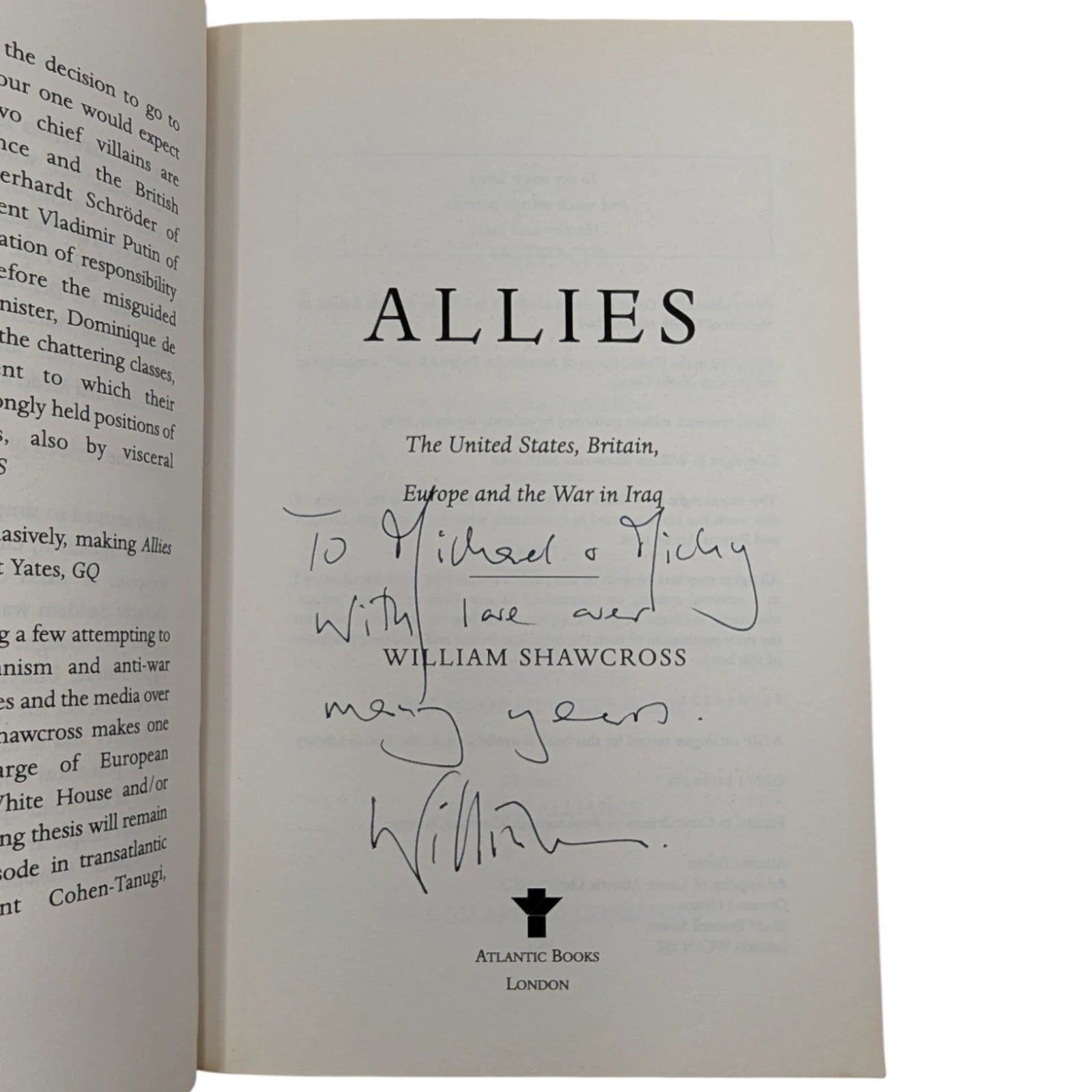 Allies: The United States, Britain, Europe and the War in Iraq, by William Shawcross. London: Atlantic Books, 2004. First printing of the paperback edition. Dedicated, signed and dated by the author to title page.