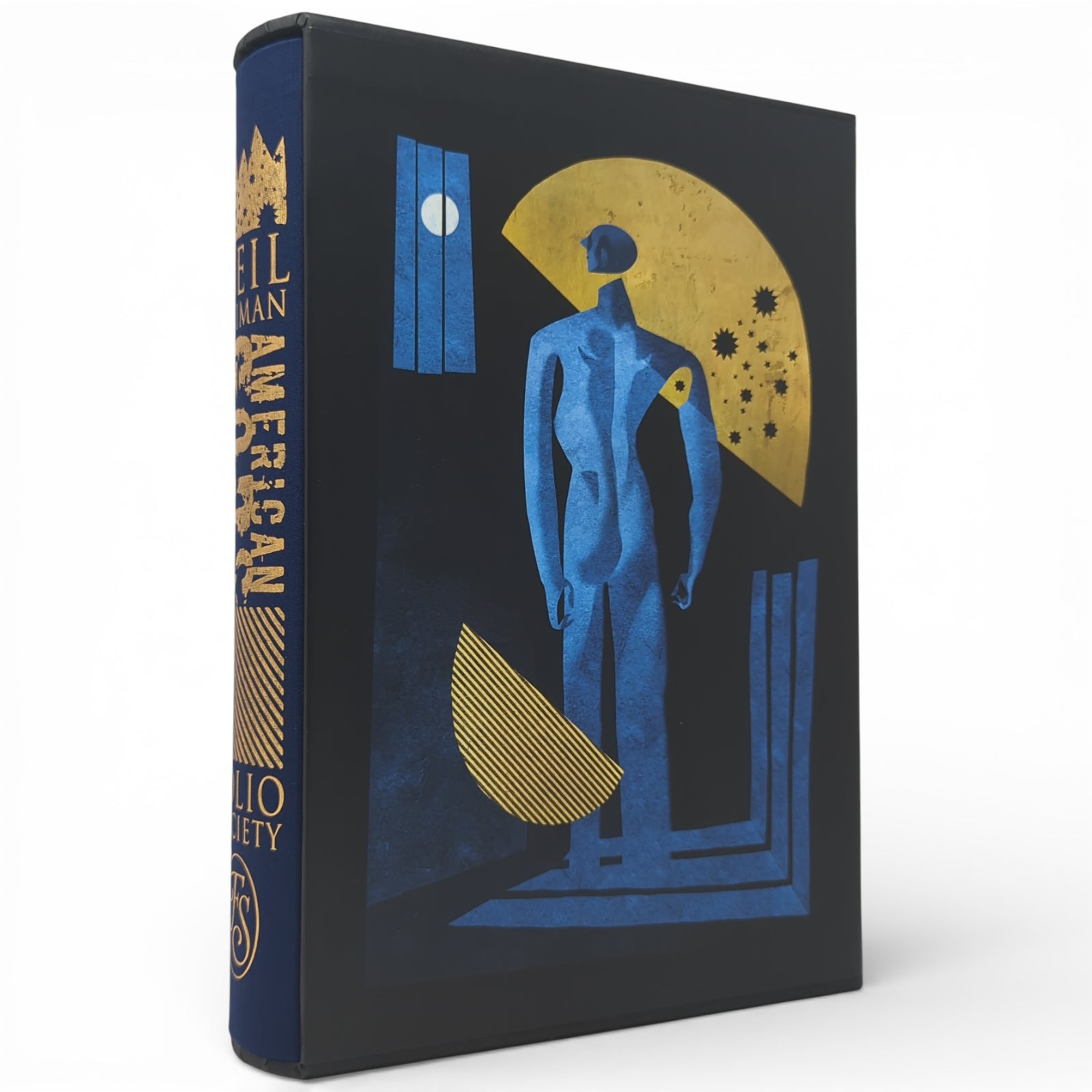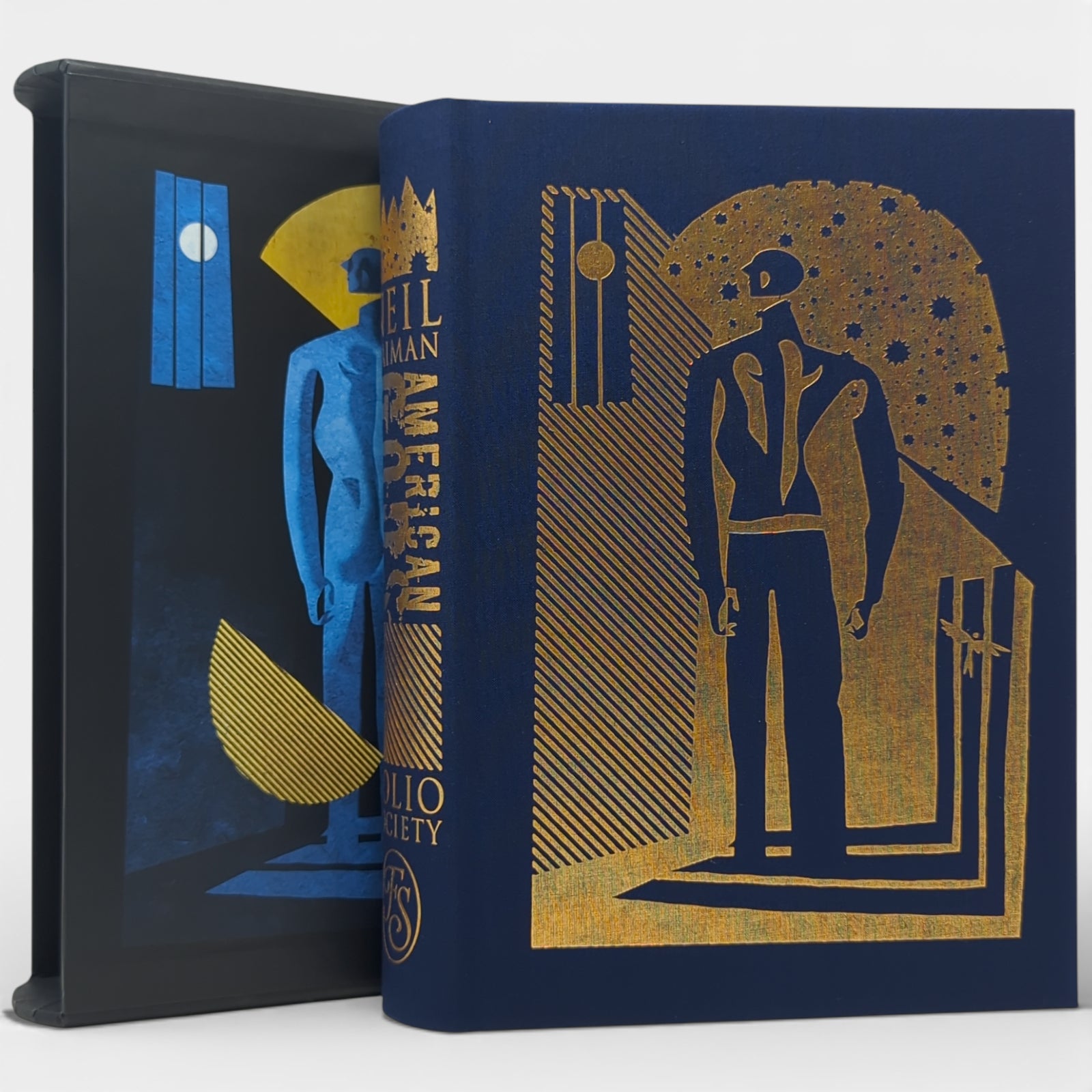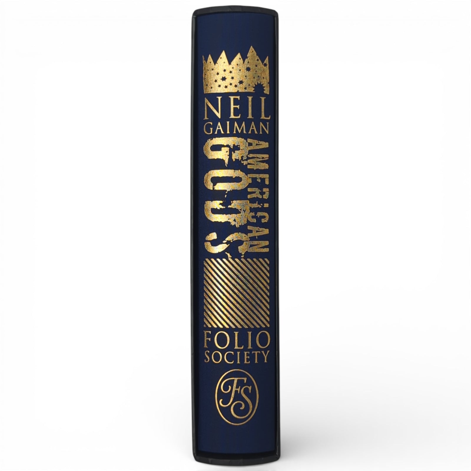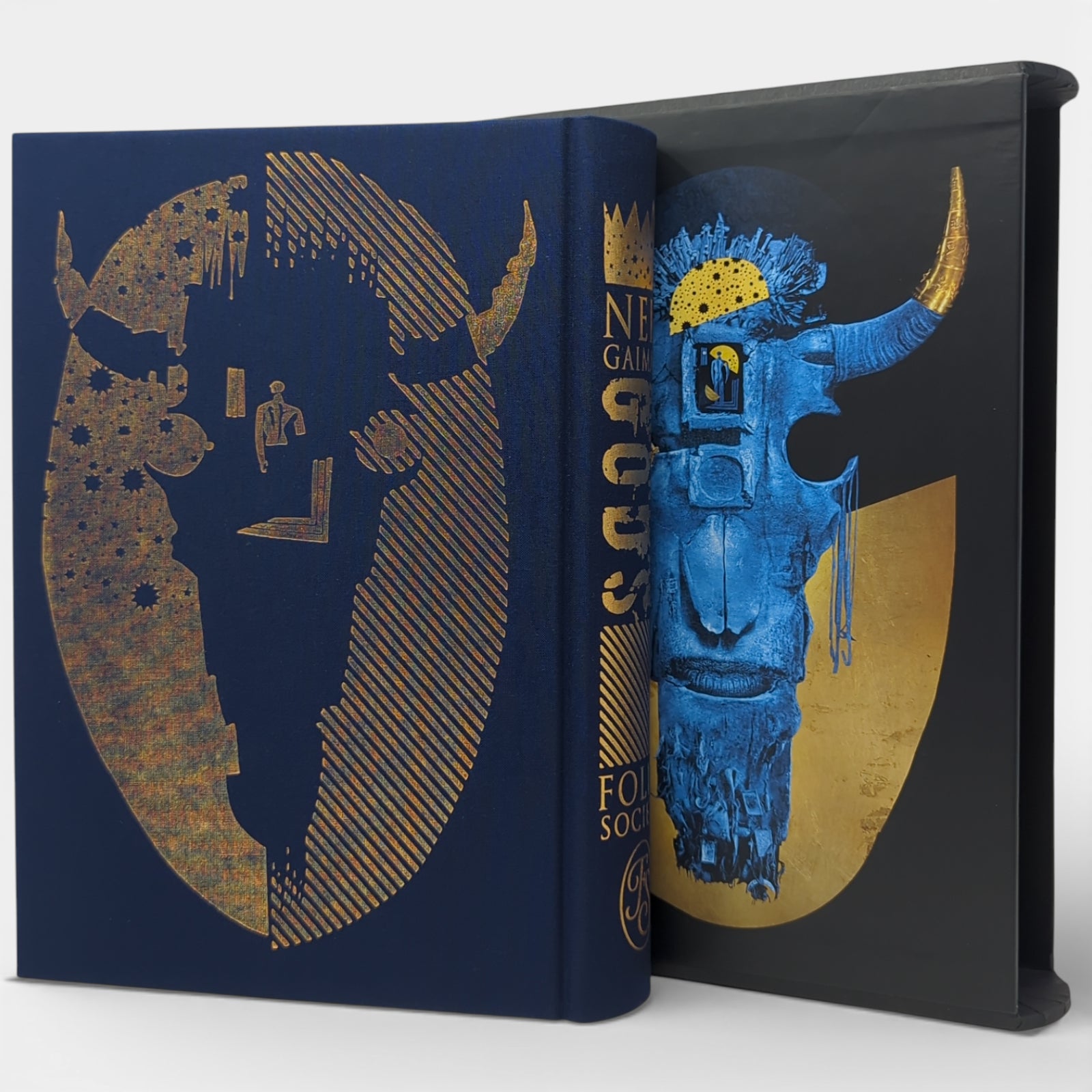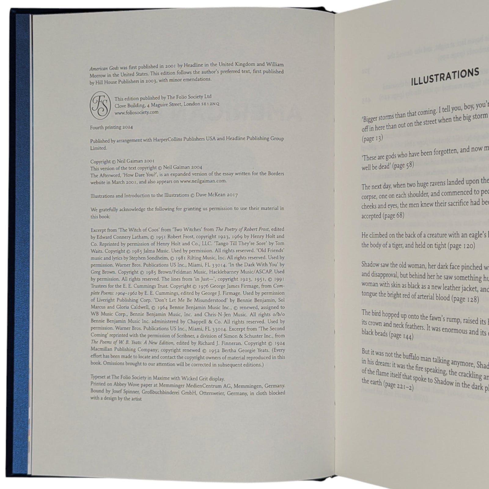 Neil Gaiman, American Gods, The Author’s Preferred Text. London: The Folio Society, 2017. Fourth printing thus. Illustrated by Dave McKean. 253 × 177 × 46 mm. Pp. [i–iv] v–xv [xvi–xviii], [1–6] 7–537 [538–542]: [15] leaves of colour plates. Type: Maxime with Wicked Grit for display. Printed and bound by Kösel in full blue cloth blocked in gold with design by McKean; metallic blue endleaves. Printed slip case. Three of the plates are double-page spreads.