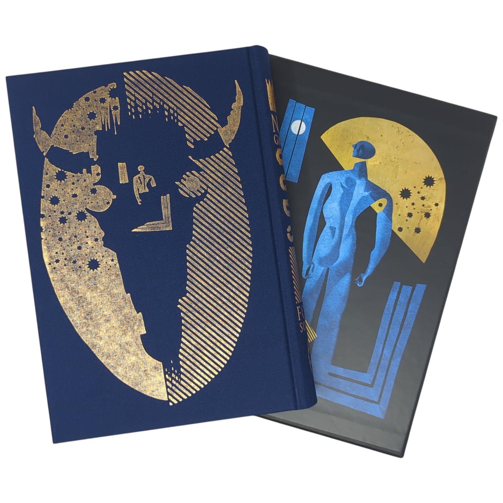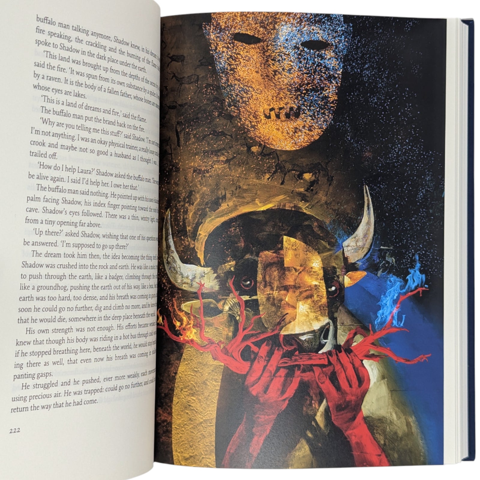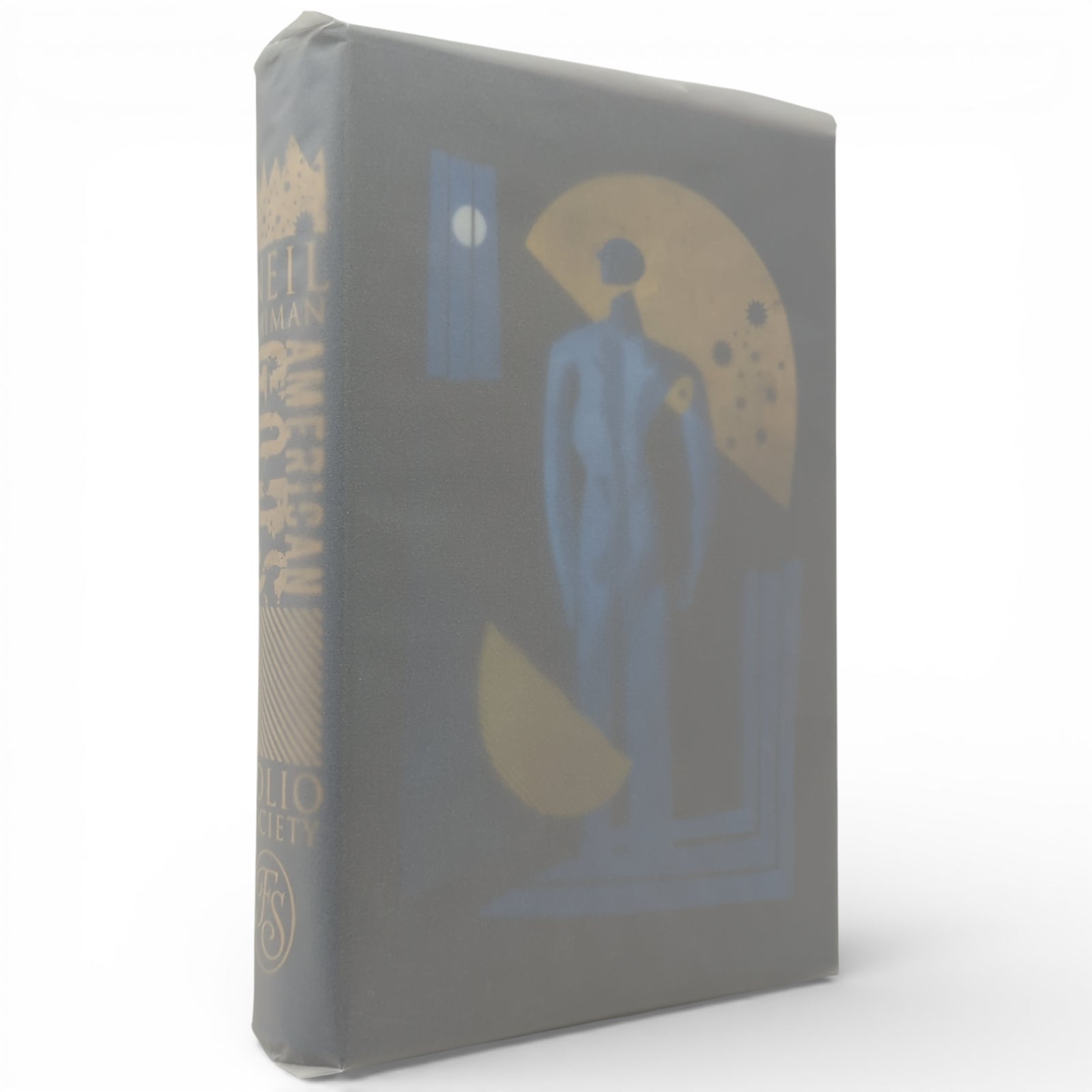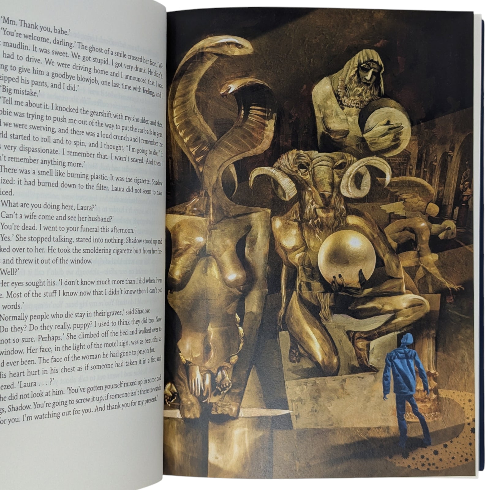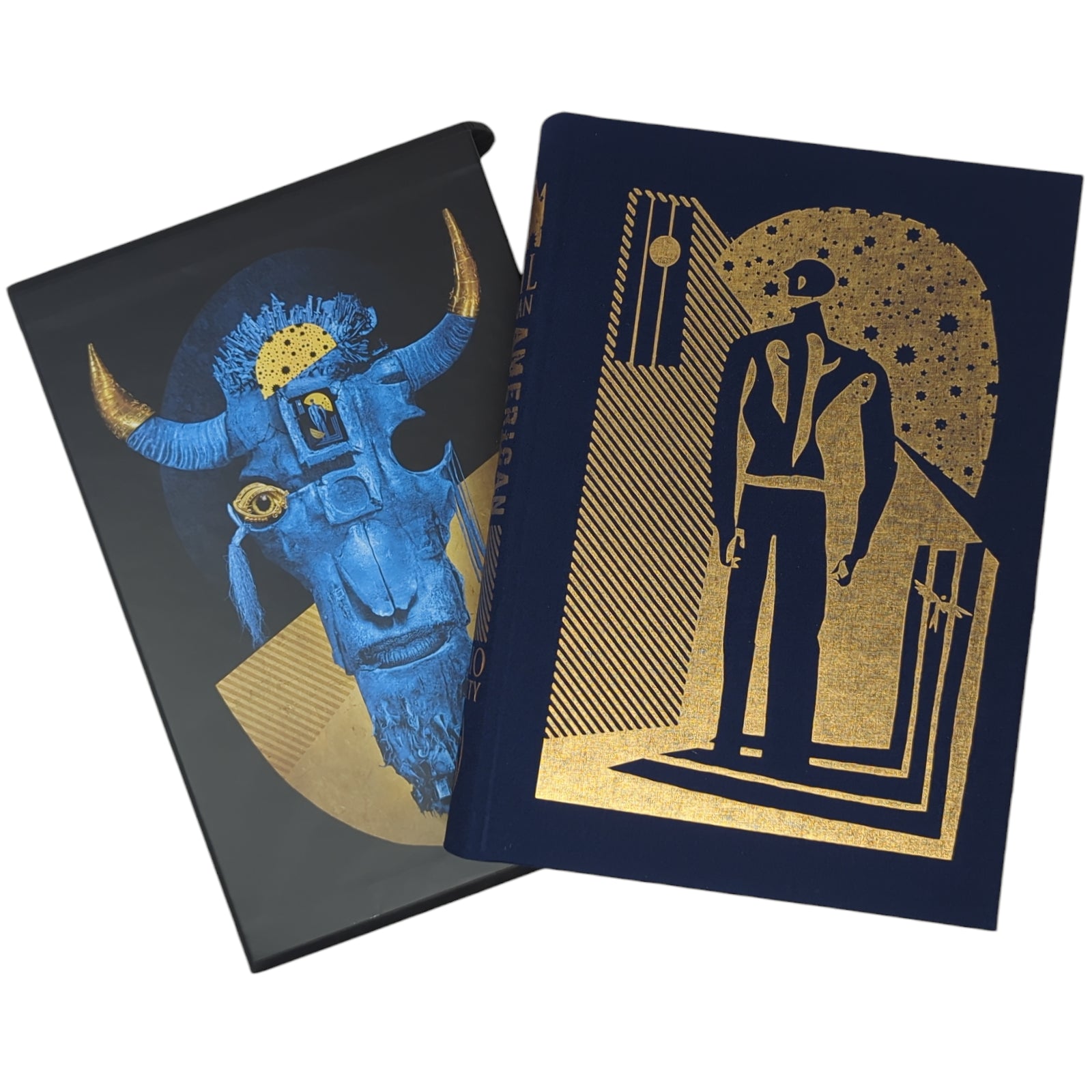 Neil Gaiman, American Gods, The Author’s Preferred Text. London: The Folio Society, 2017. Fourth printing thus. Illustrated by Dave McKean. 253 × 177 × 46 mm. Pp. [i–iv] v–xv [xvi–xviii], [1–6] 7–537 [538–542]: [15] leaves of colour plates. Type: Maxime with Wicked Grit for display. Printed and bound by Kösel in full blue cloth blocked in gold with design by McKean; metallic blue endleaves. Printed slip case. Three of the plates are double-page spreads.