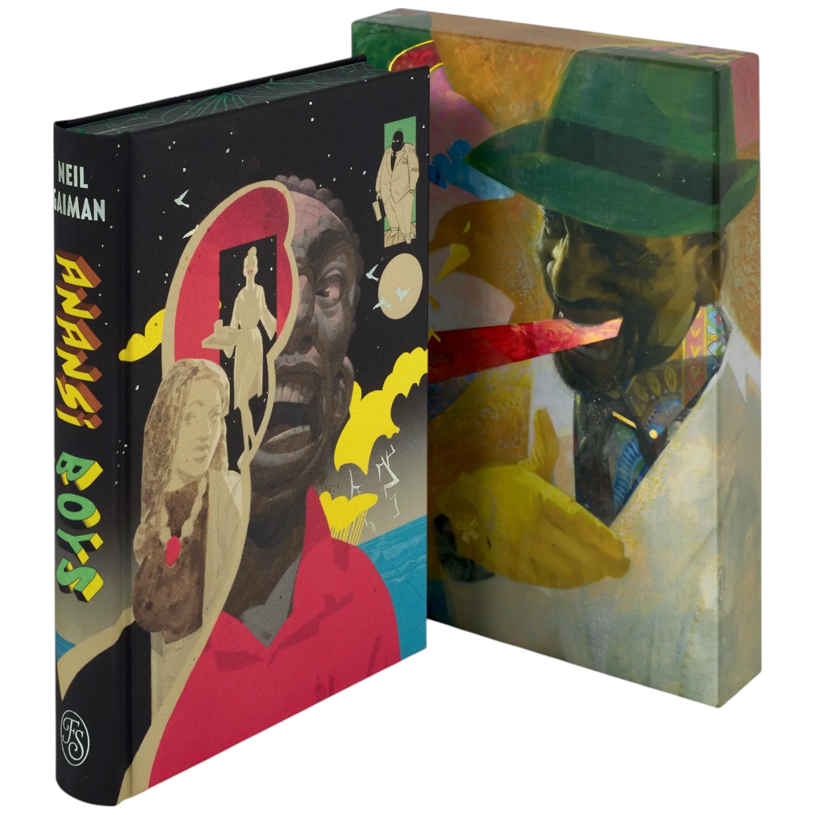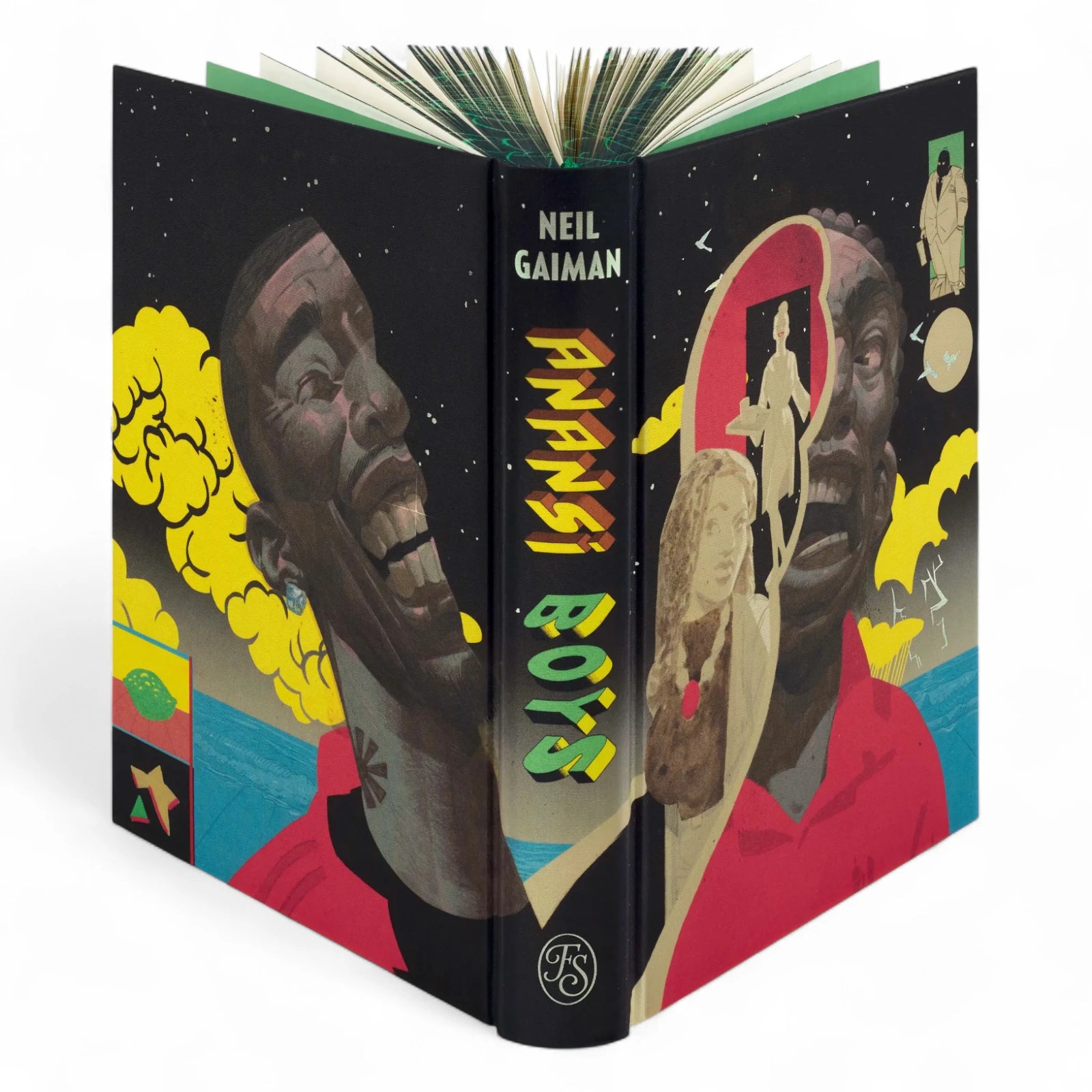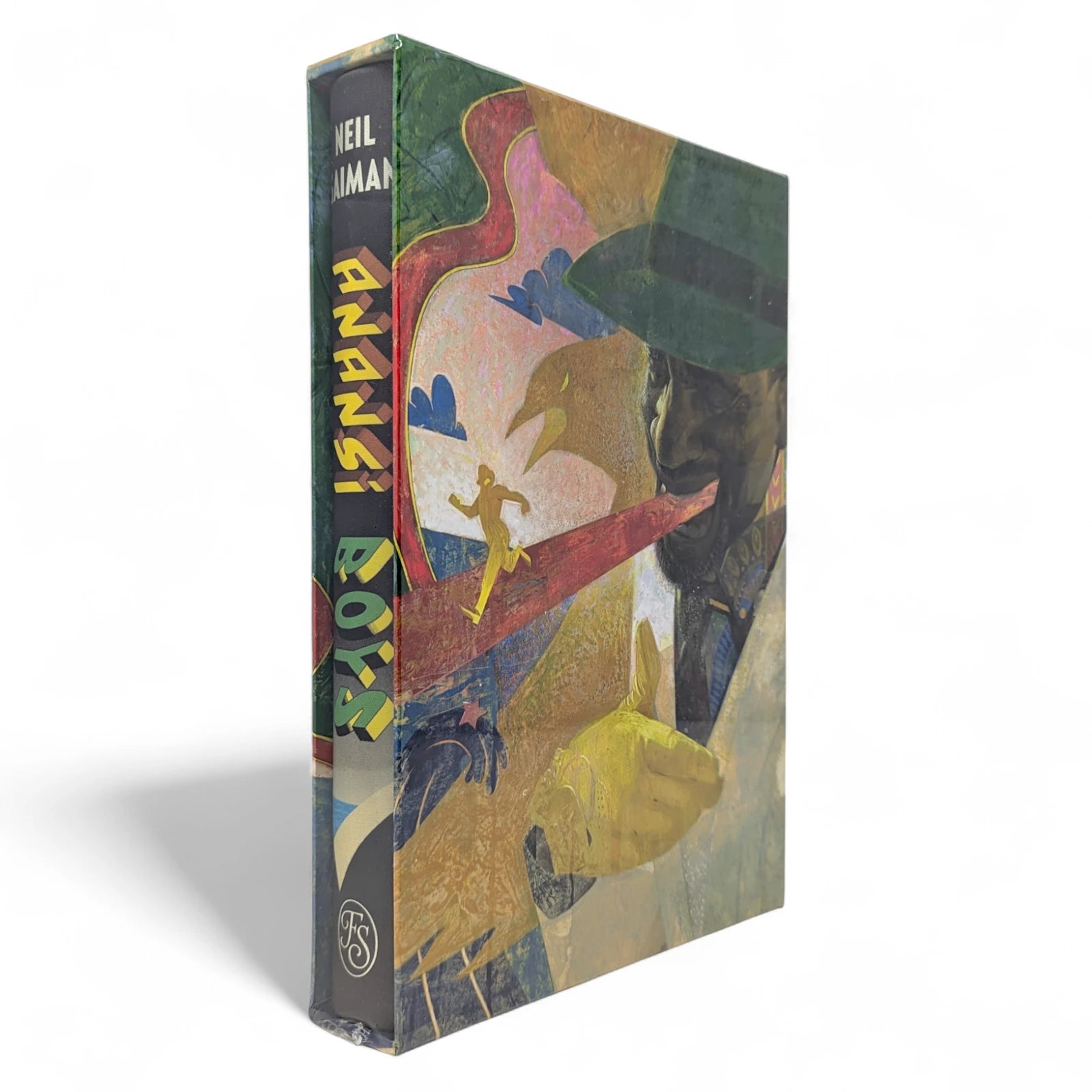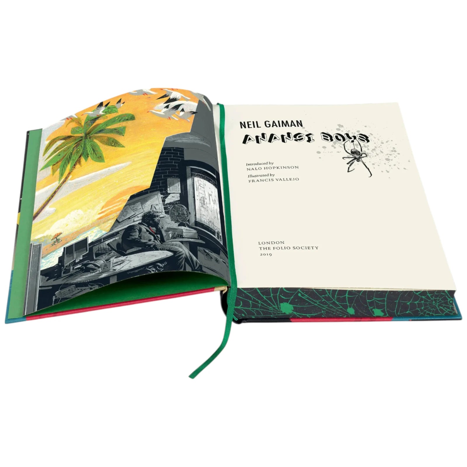 Neil Gaiman, Anansi Boys. London: The Folio Society, 2019. Introduced by Nalo Hopkinson, illustrated by Francis Vallejo. 251 × 177 × 33 mm. Pp. [i–vi] vii–xvii [xviii], [1–4] 5–356 [357–358]: [8] leaves of colour plates (facing pp. [iii], 14, 150, 262, and between pp. 118–119 and 342–343). Type: Octavian with Volume for display. Printed and bound by Kösel in full printed black cloth blocked in silver with design by Vallejo. Printed with spider web edges. Green endleaves. Printed and spot varnished slip case. Two of the plates are double-page spreads. Vallejo has also provided plentiful black and white spreads in the text and for chapter openings. Winner of the Gold Award in the book category at Spectrum 26, an annual showcase of the best in contemporary fantastic art.