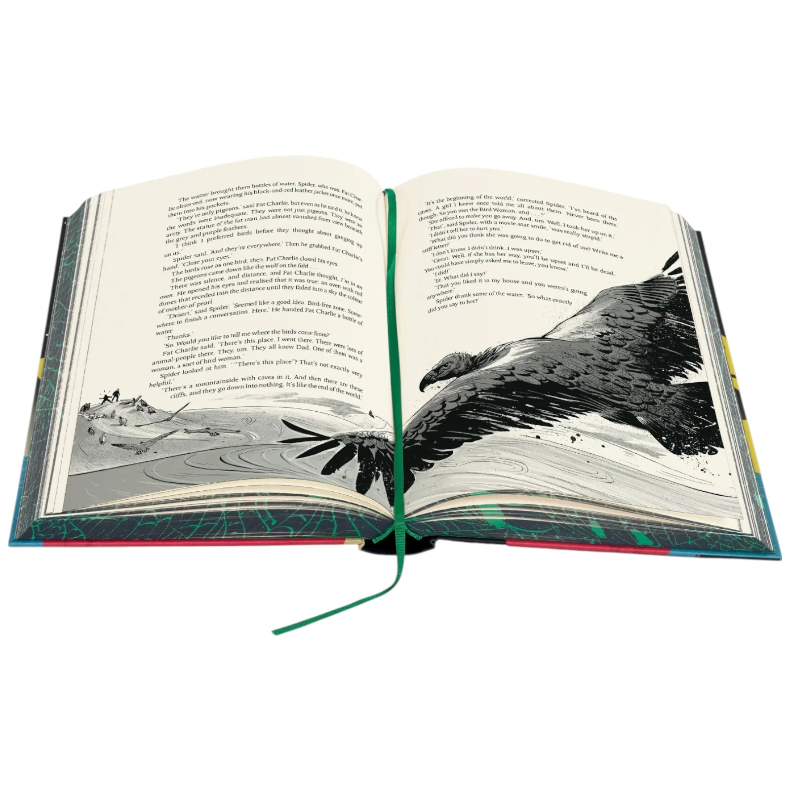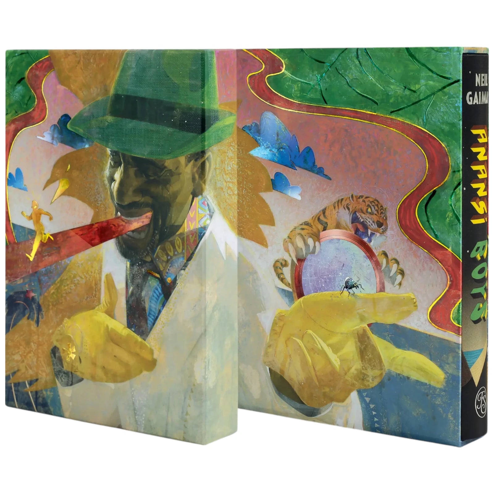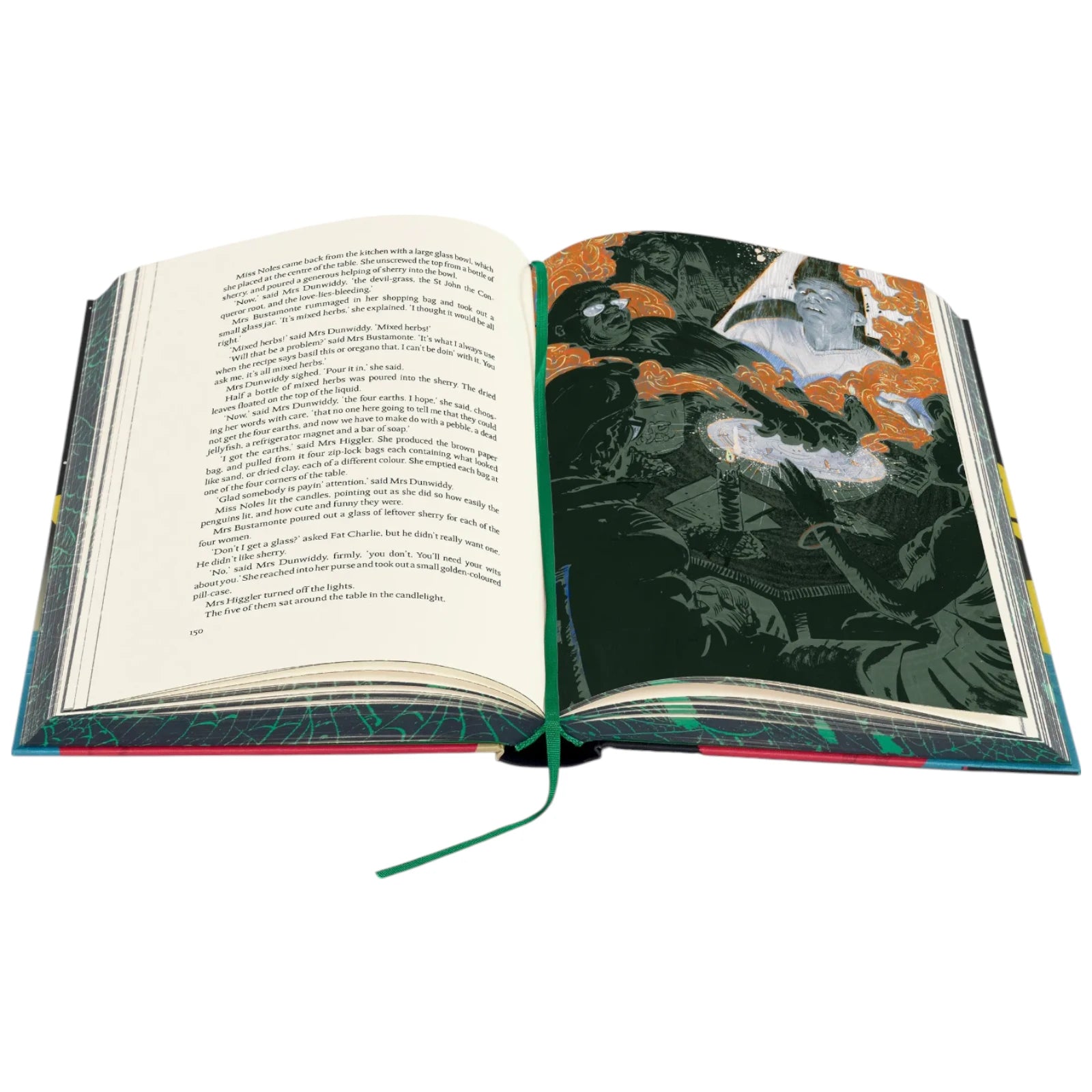 Neil Gaiman, Anansi Boys. London: The Folio Society, 2019. Introduced by Nalo Hopkinson, illustrated by Francis Vallejo. 251 × 177 × 33 mm. Pp. [i–vi] vii–xvii [xviii], [1–4] 5–356 [357–358]: [8] leaves of colour plates (facing pp. [iii], 14, 150, 262, and between pp. 118–119 and 342–343). Type: Octavian with Volume for display. Printed and bound by Kösel in full printed black cloth blocked in silver with design by Vallejo. Printed with spider web edges. Green endleaves. Printed and spot varnished slip case. Two of the plates are double-page spreads. Vallejo has also provided plentiful black and white spreads in the text and for chapter openings. Winner of the Gold Award in the book category at Spectrum 26, an annual showcase of the best in contemporary fantastic art.