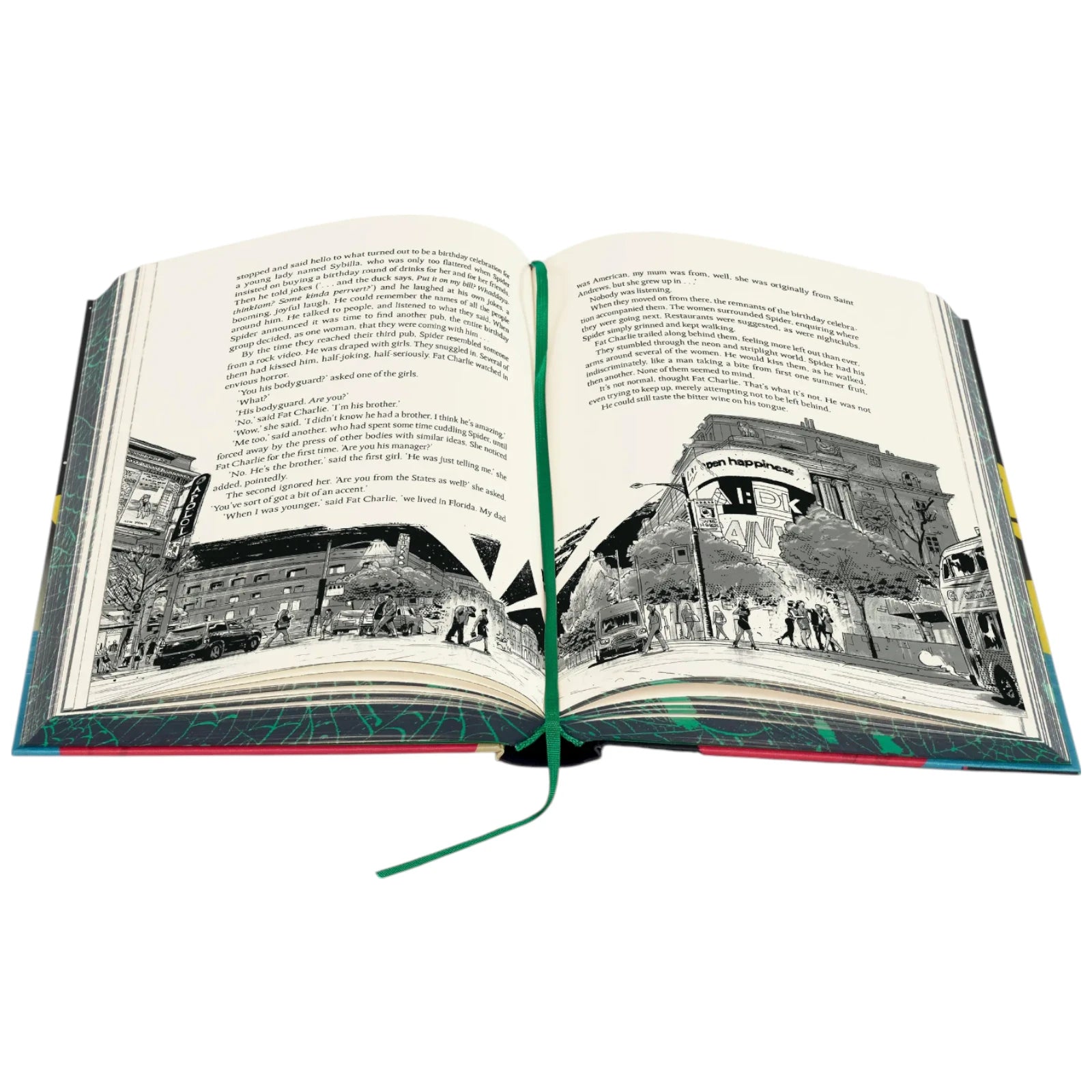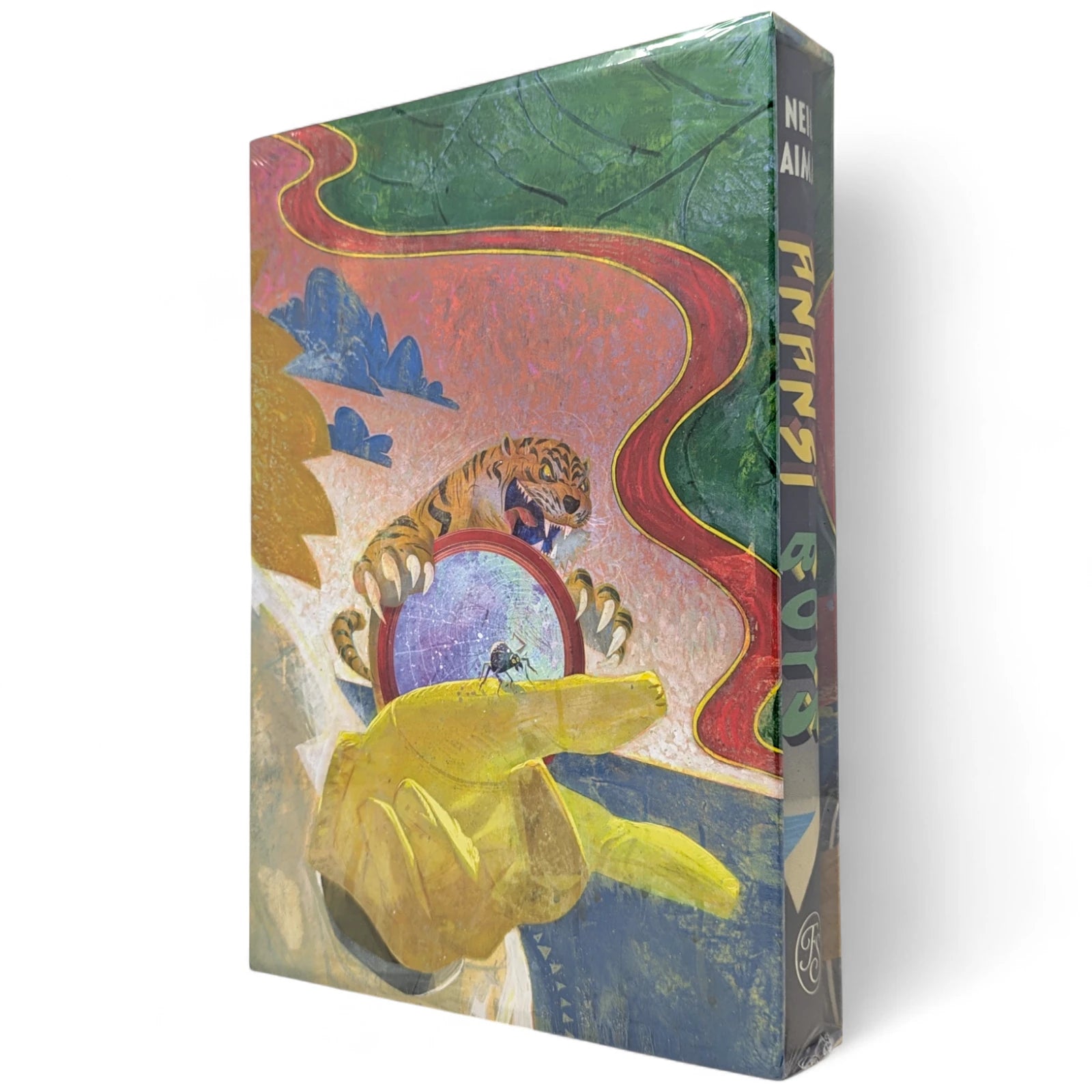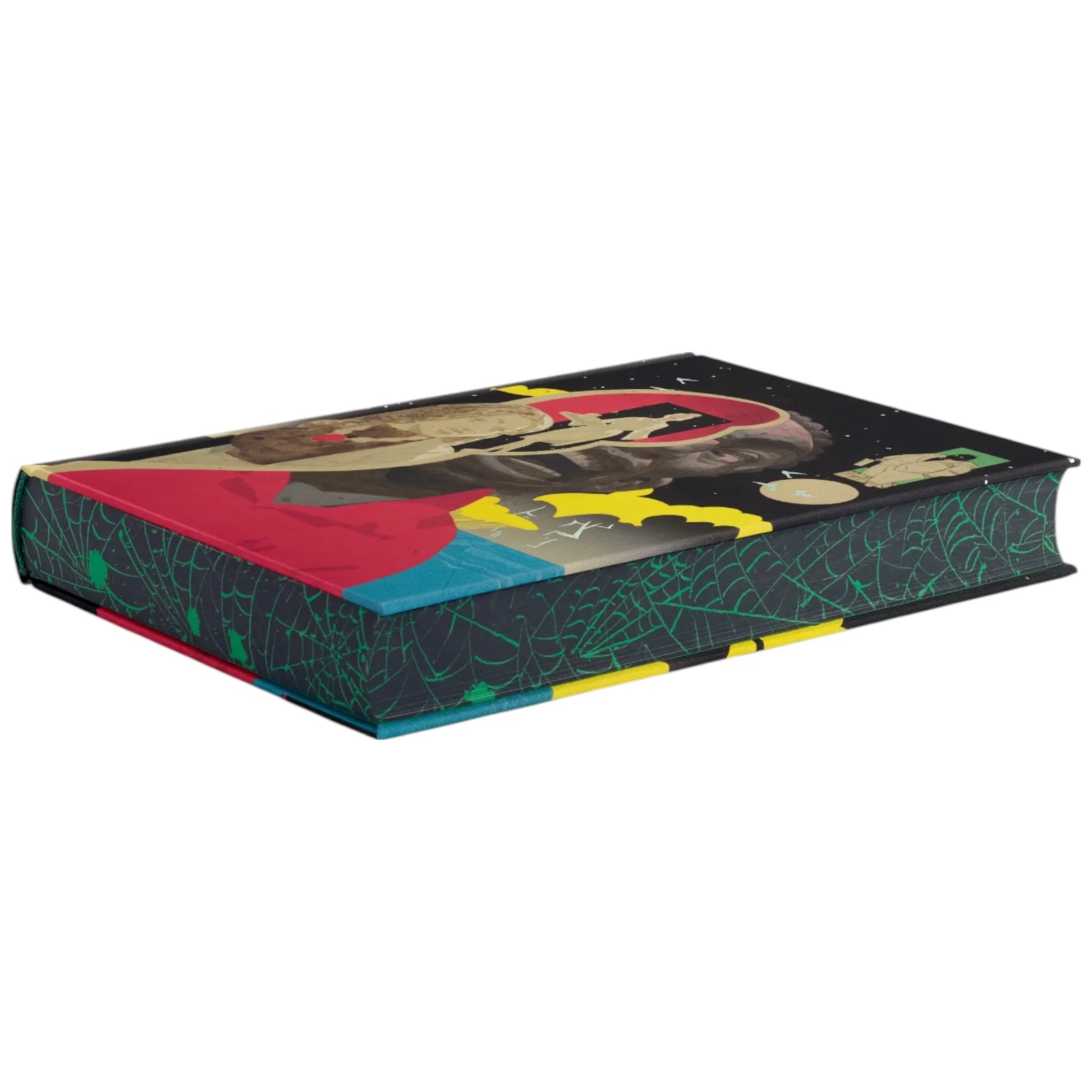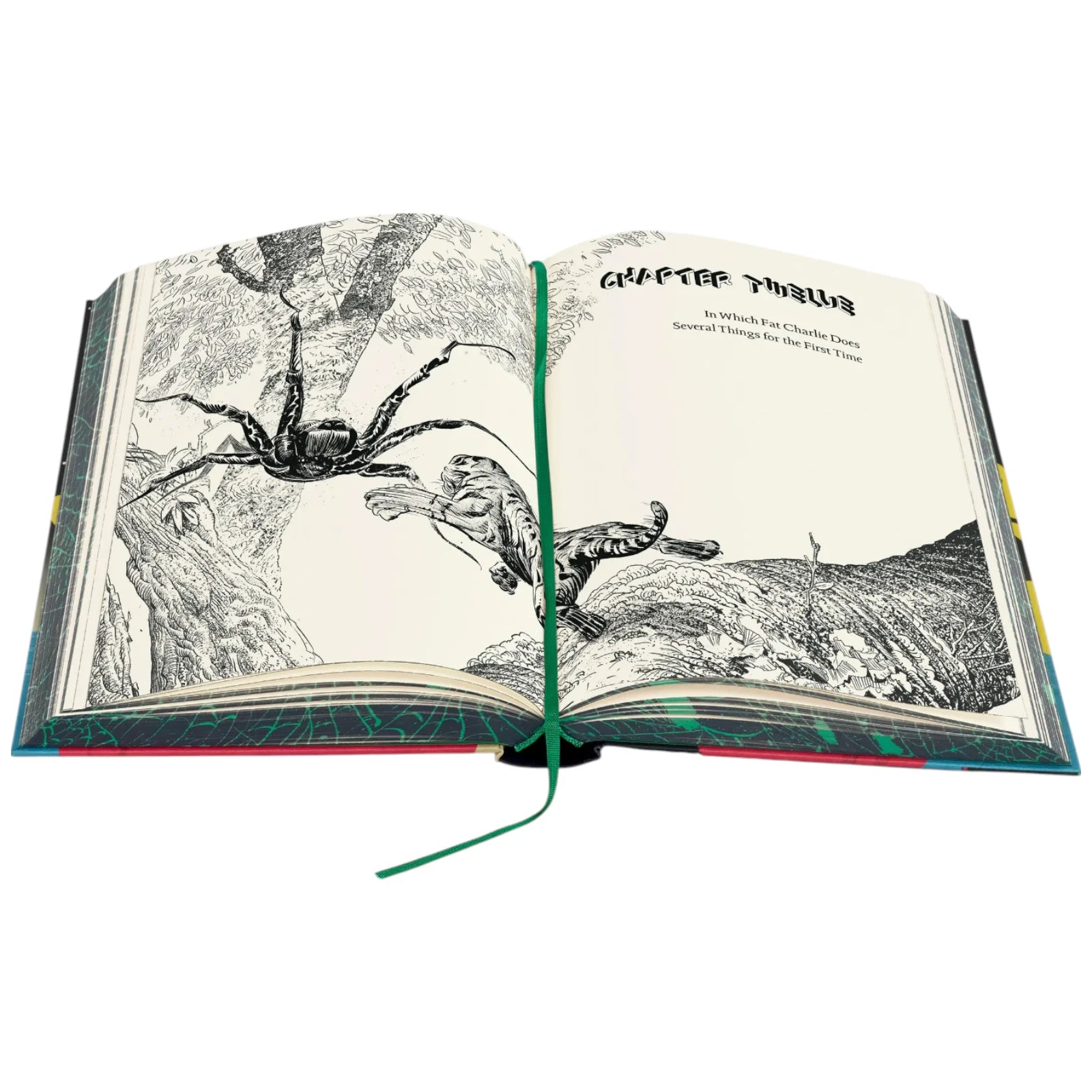 Neil Gaiman, Anansi Boys. London: The Folio Society, 2019. Introduced by Nalo Hopkinson, illustrated by Francis Vallejo. 251 × 177 × 33 mm. Pp. [i–vi] vii–xvii [xviii], [1–4] 5–356 [357–358]: [8] leaves of colour plates (facing pp. [iii], 14, 150, 262, and between pp. 118–119 and 342–343). Type: Octavian with Volume for display. Printed and bound by Kösel in full printed black cloth blocked in silver with design by Vallejo. Printed with spider web edges. Green endleaves. Printed and spot varnished slip case. Two of the plates are double-page spreads. Vallejo has also provided plentiful black and white spreads in the text and for chapter openings. Winner of the Gold Award in the book category at Spectrum 26, an annual showcase of the best in contemporary fantastic art.