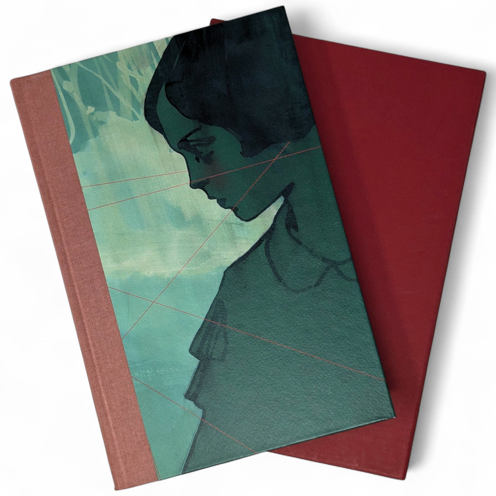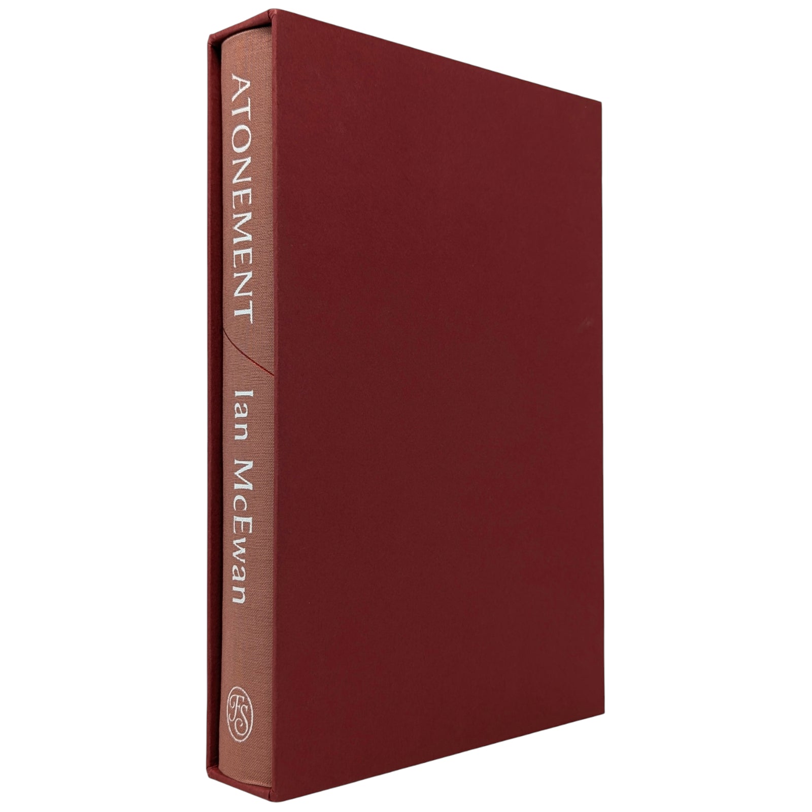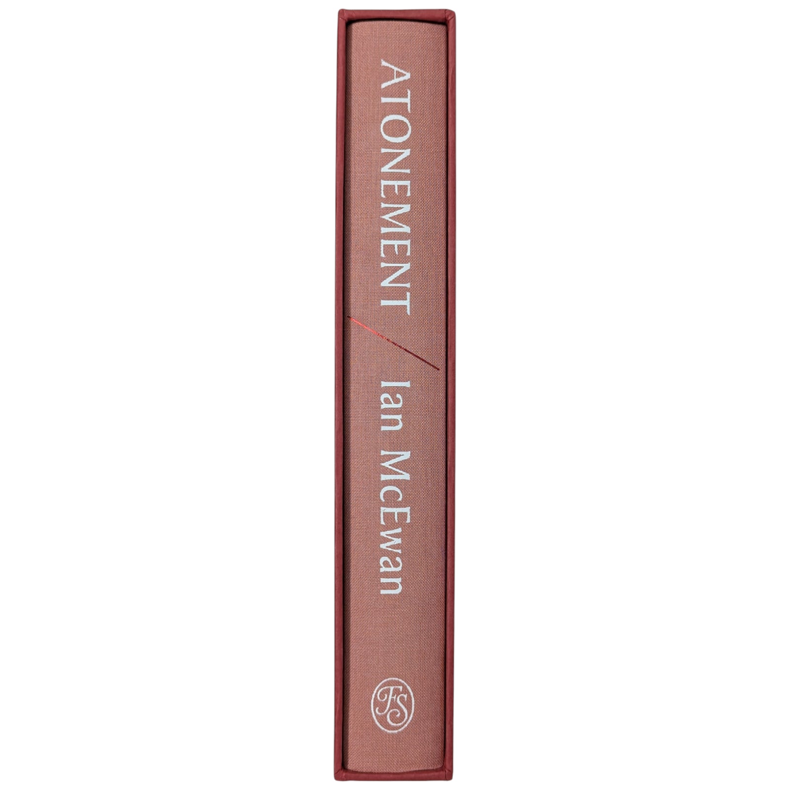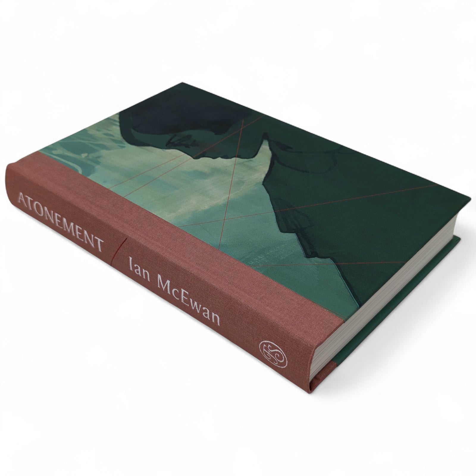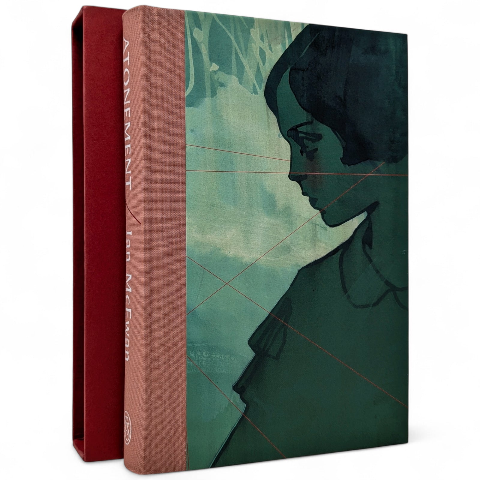 Ian McEwan, Atonement. London: The Folio Society, 2017. First printing thus. Introduced by Adam Begley, illustrated by Tina Berning. 241 × 163 × 33 mm. Pp. [i–vi] vii–xv [xvi–xviii], [1–6] 7–355 [356–358]: [9] leaves of colour plates (facing pp. [iii], 31, 94, 142, 174, 191, 238, 302 and 327). Type: Perpetua. Printed and bound by Neografia in quarter dark pink cloth with paper boards with a design by Berning; dark pink endleaves printed with dark red threads echoing the lines linking all the plates. Red slip case.