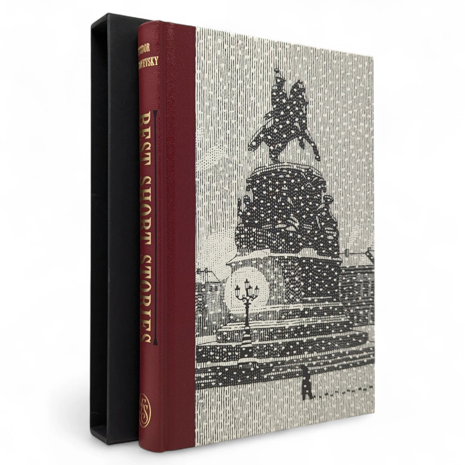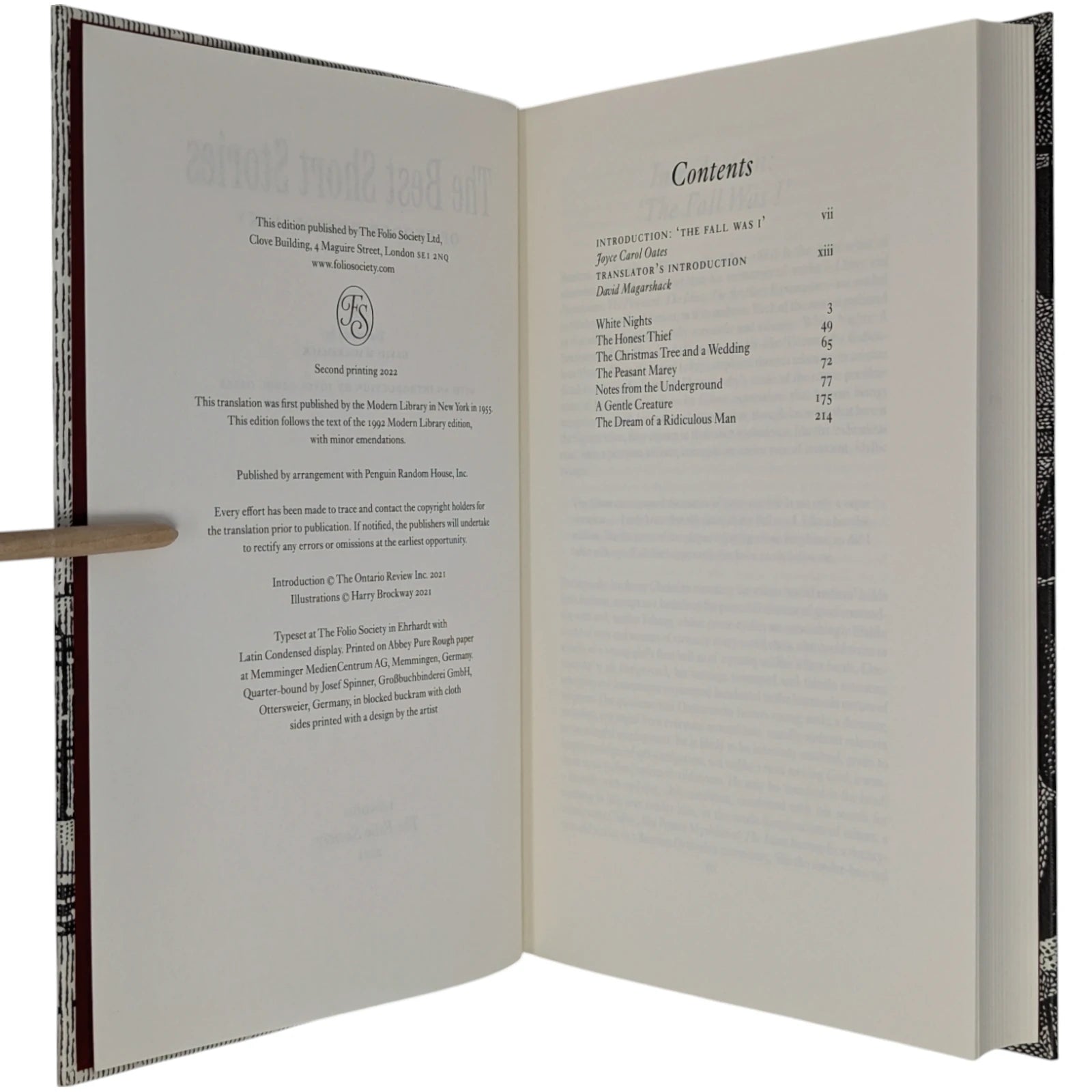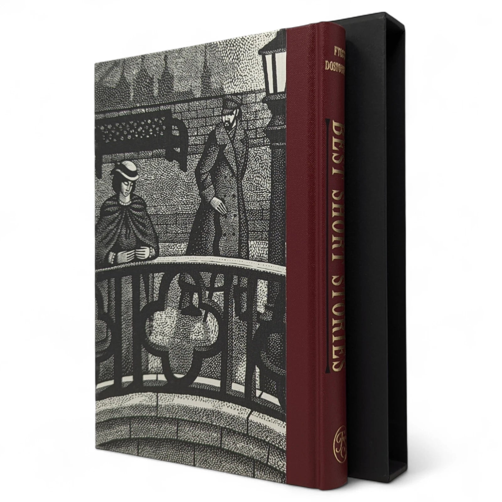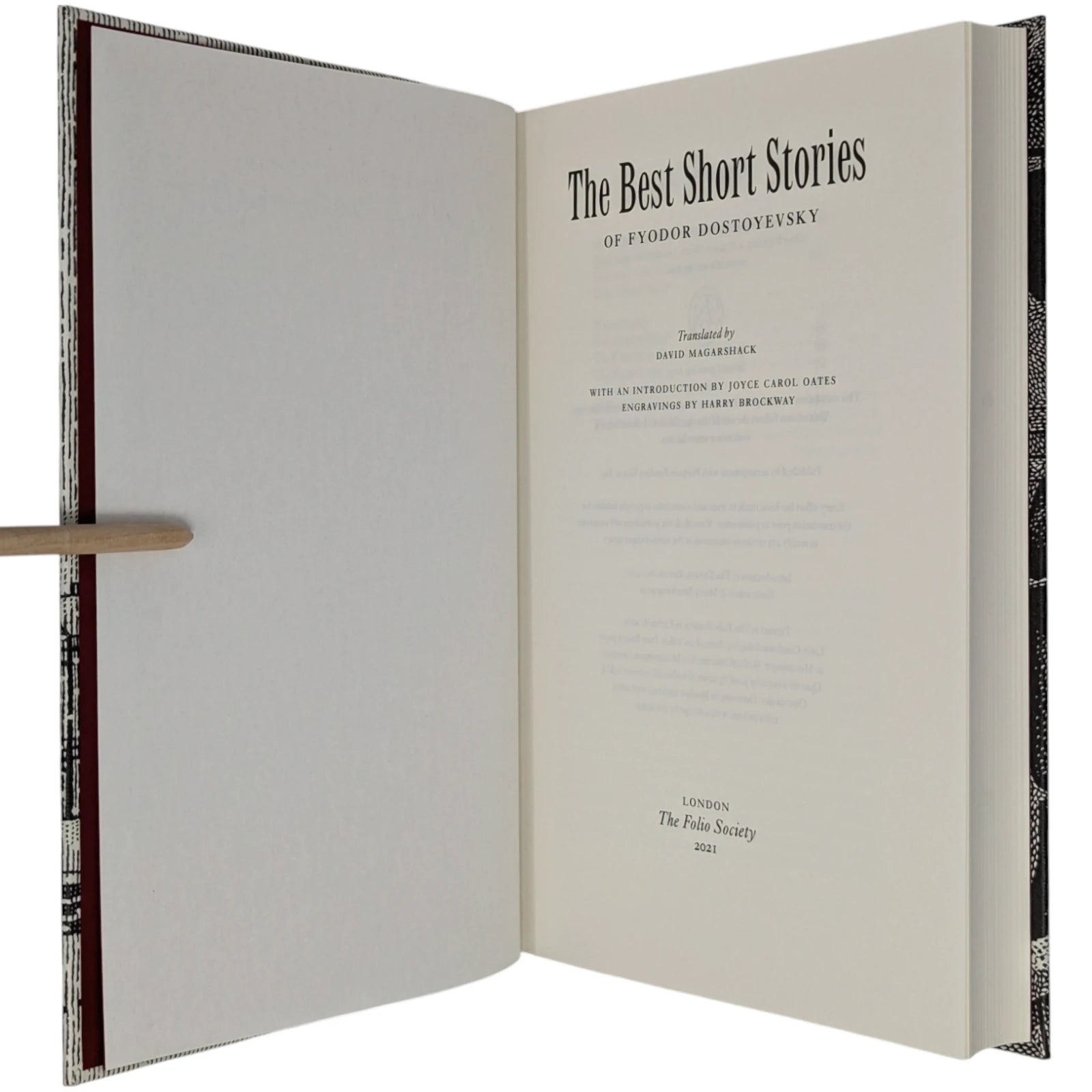 The Best Short Stories of Fyodor Dostoyevsky. London: The Folio Society, 2021. Second printing thus. Translated by David Magarshack, with an introduction by Joyce Carol Oates, engravings by Harry Brockway. 240 × 165 × 25 mm. Pp. [i–vi] vii–xxiv, [1–2] 3–232 [233–236]. Type: Ehrhardt with Latin Condensed for display. Printed by Memminger MedienCentrum. Bound by Josef Spin ner in blocked quarter dark red buckram and printed cloth boards with design by Brockway; dark red endleaves. Black slip case. Published to mark the 200th anniversary of Dostoyevsky’s birth, seven stories are included. Each is accompanied by a full-page wood-engraving by Brockway in the text.