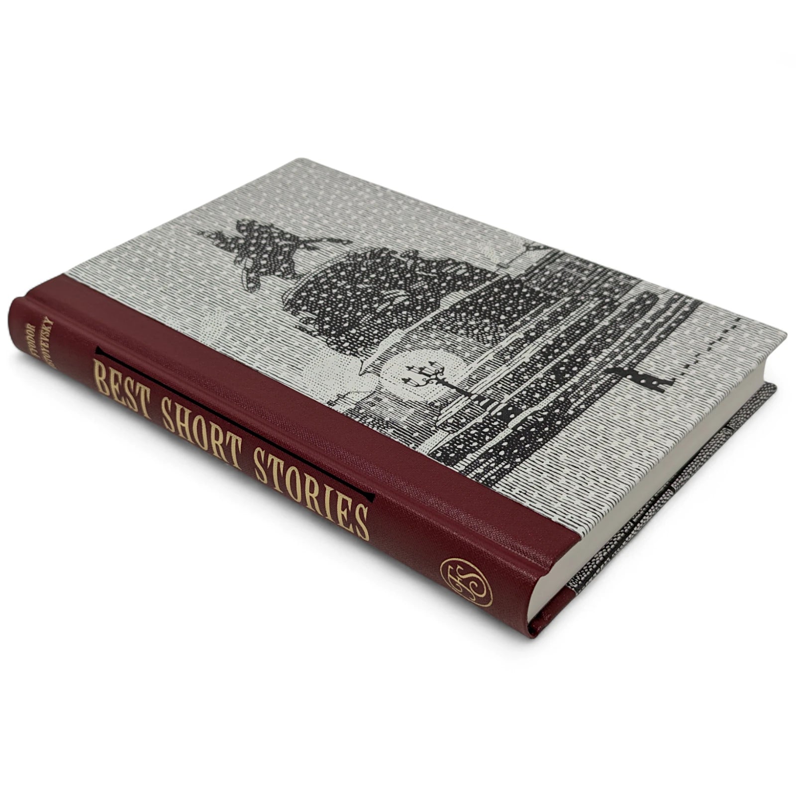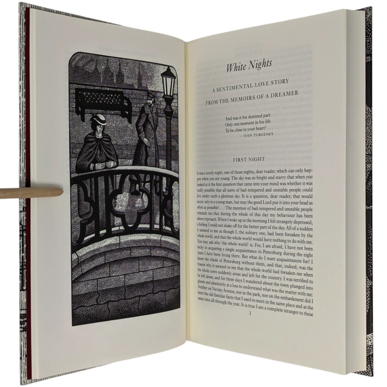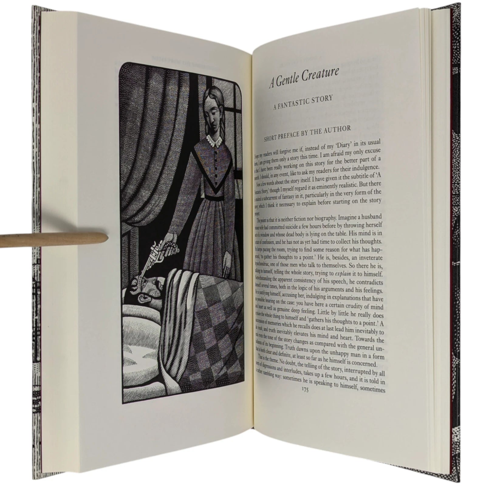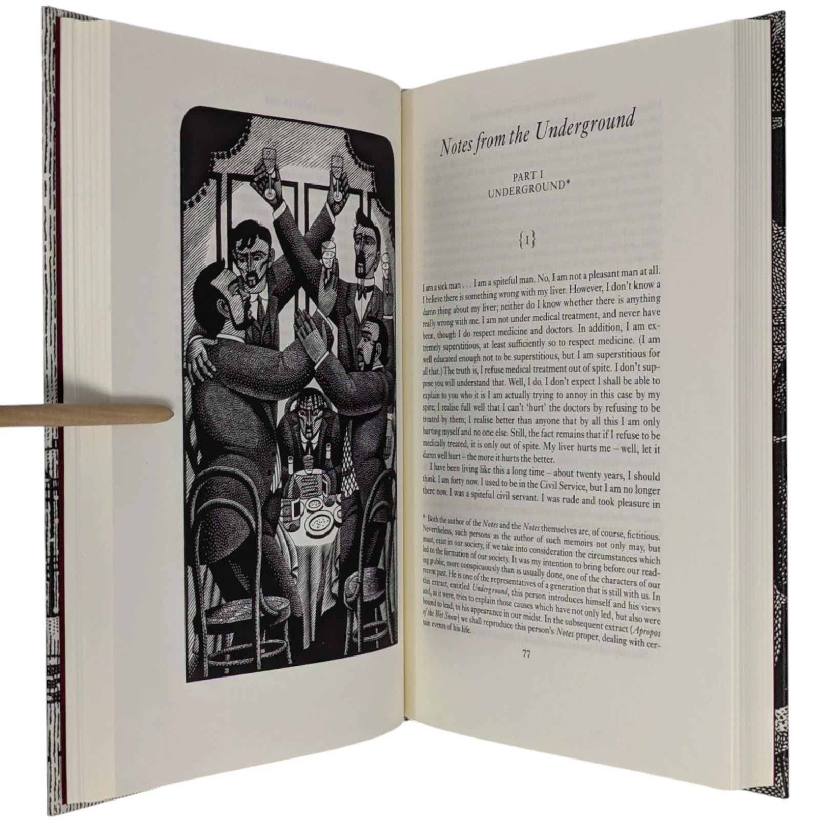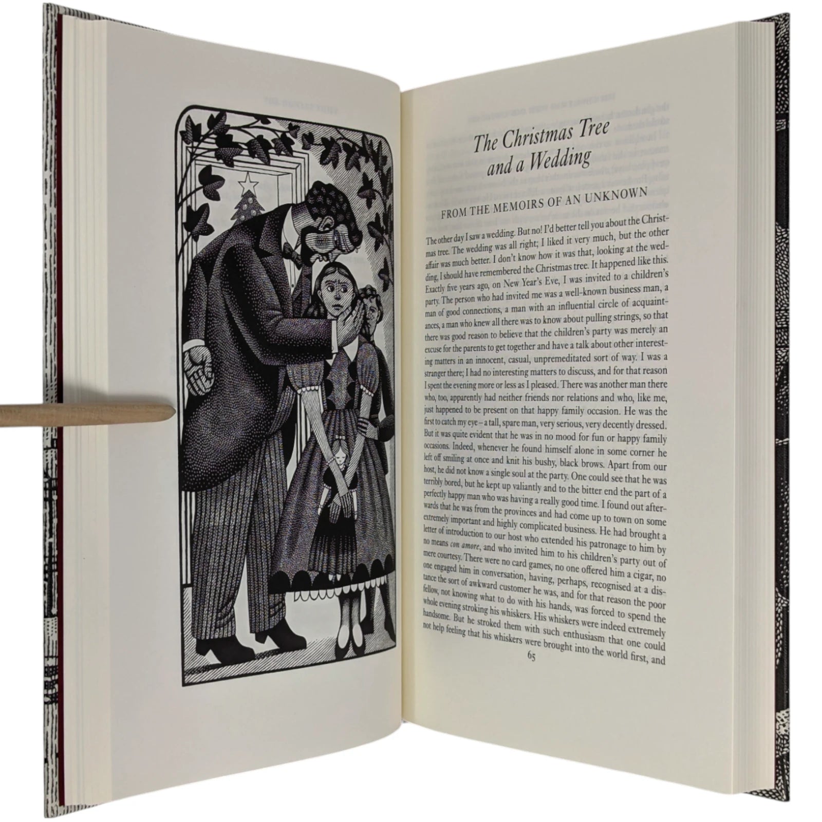 The Best Short Stories of Fyodor Dostoyevsky. London: The Folio Society, 2021. Second printing thus. Translated by David Magarshack, with an introduction by Joyce Carol Oates, engravings by Harry Brockway. 240 × 165 × 25 mm. Pp. [i–vi] vii–xxiv, [1–2] 3–232 [233–236]. Type: Ehrhardt with Latin Condensed for display. Printed by Memminger MedienCentrum. Bound by Josef Spin ner in blocked quarter dark red buckram and printed cloth boards with design by Brockway; dark red endleaves. Black slip case. Published to mark the 200th anniversary of Dostoyevsky’s birth, seven stories are included. Each is accompanied by a full-page wood-engraving by Brockway in the text.