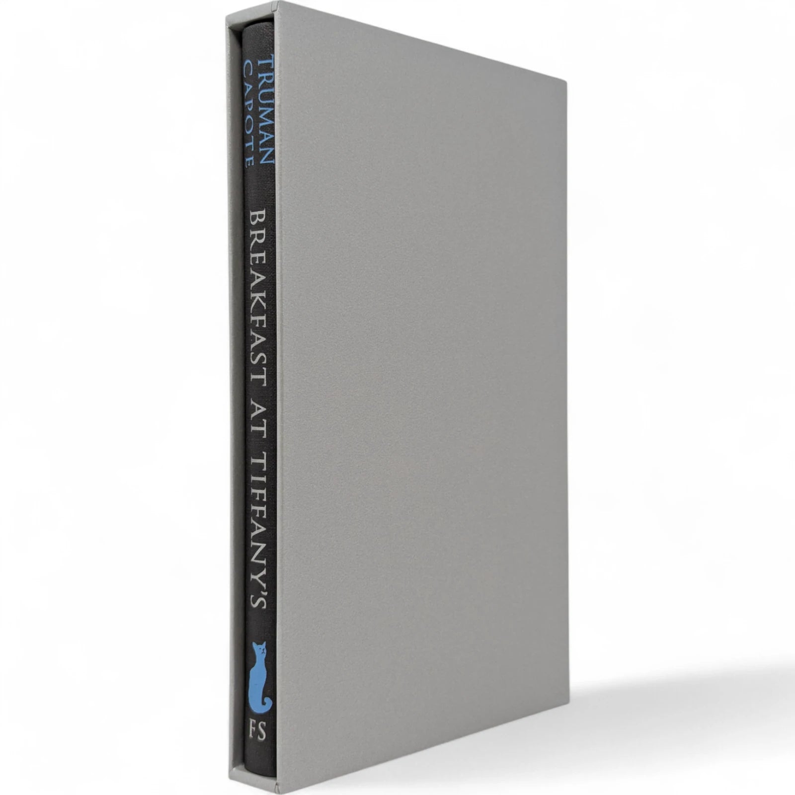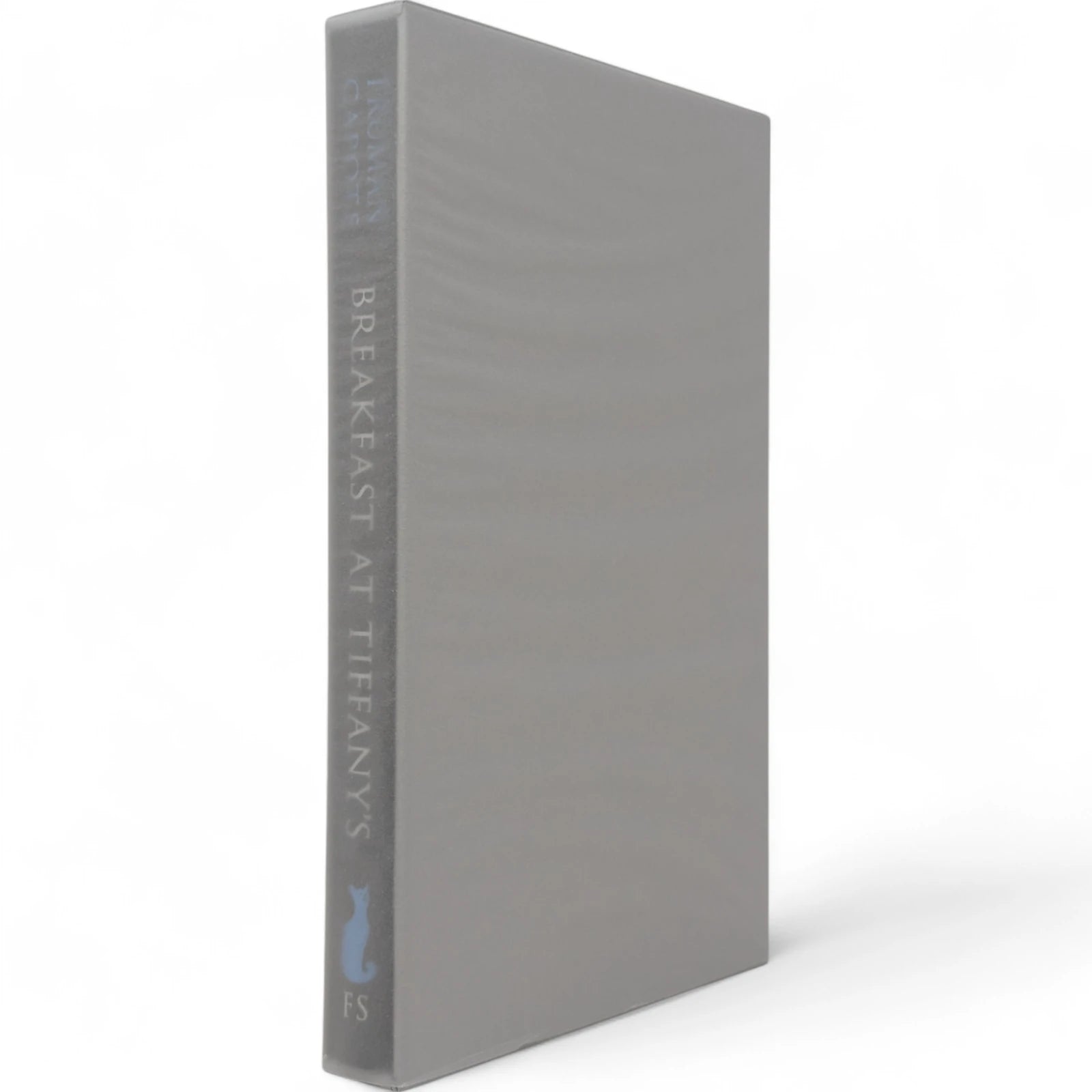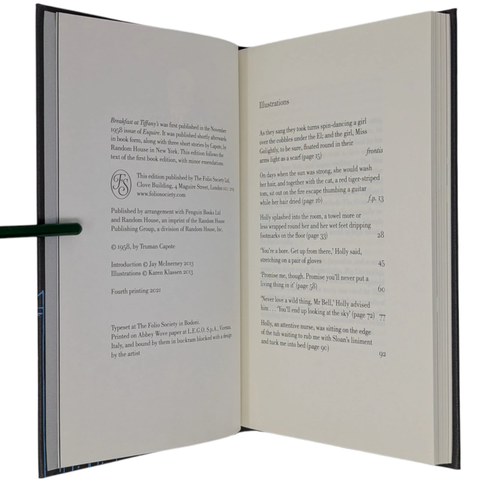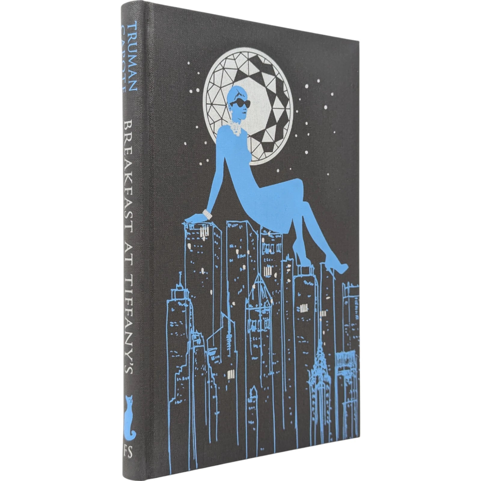 Truman Capote, Breakfast at Tiffany's. London: The Folio Society, 2013. Fourth printing, 2021. Introduced by Jay McInerney, illustrated by Karen Klassen. 229 × 150 × 19 mm. Pp. [i–viii] ix–xviii [xix–xx], [1–2] 3–107 [108]: [7] leaves of colour plates (facing pp. [iii], 13, 28, 45, 60, 77 and 92). Type: Bodoni. Printed and bound by L.E.G.O. in full dark grey buckram blocked in silver and blue with design by Klassen; silver endleaves. Dark silver slip case. The binding design was used to create notebooks, with ruled paper, for marketing campaigns and events. With the spine reading ‘A Folio Notebook’ in silver, the dimensions were reduced to 216 × 129 × 19 mm.