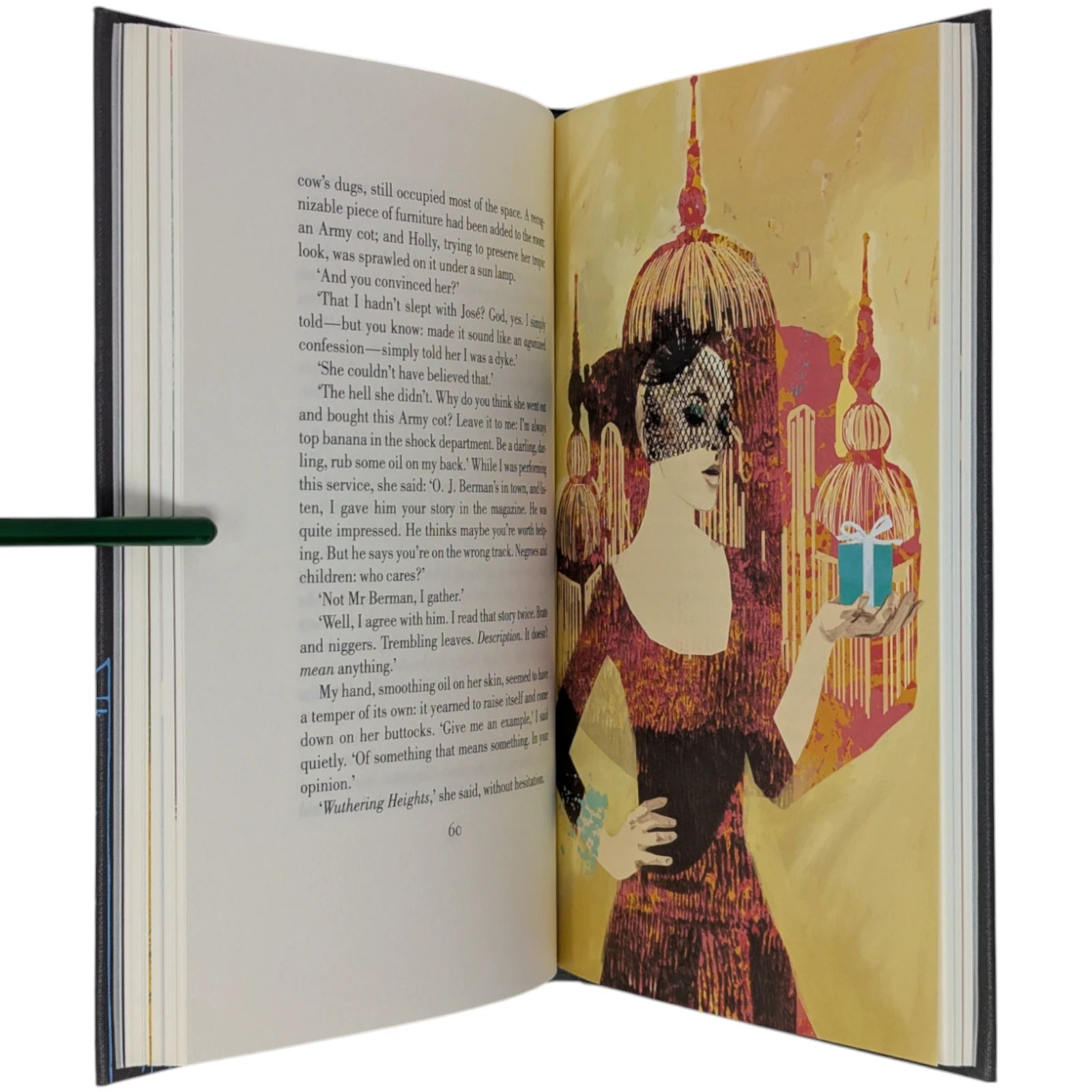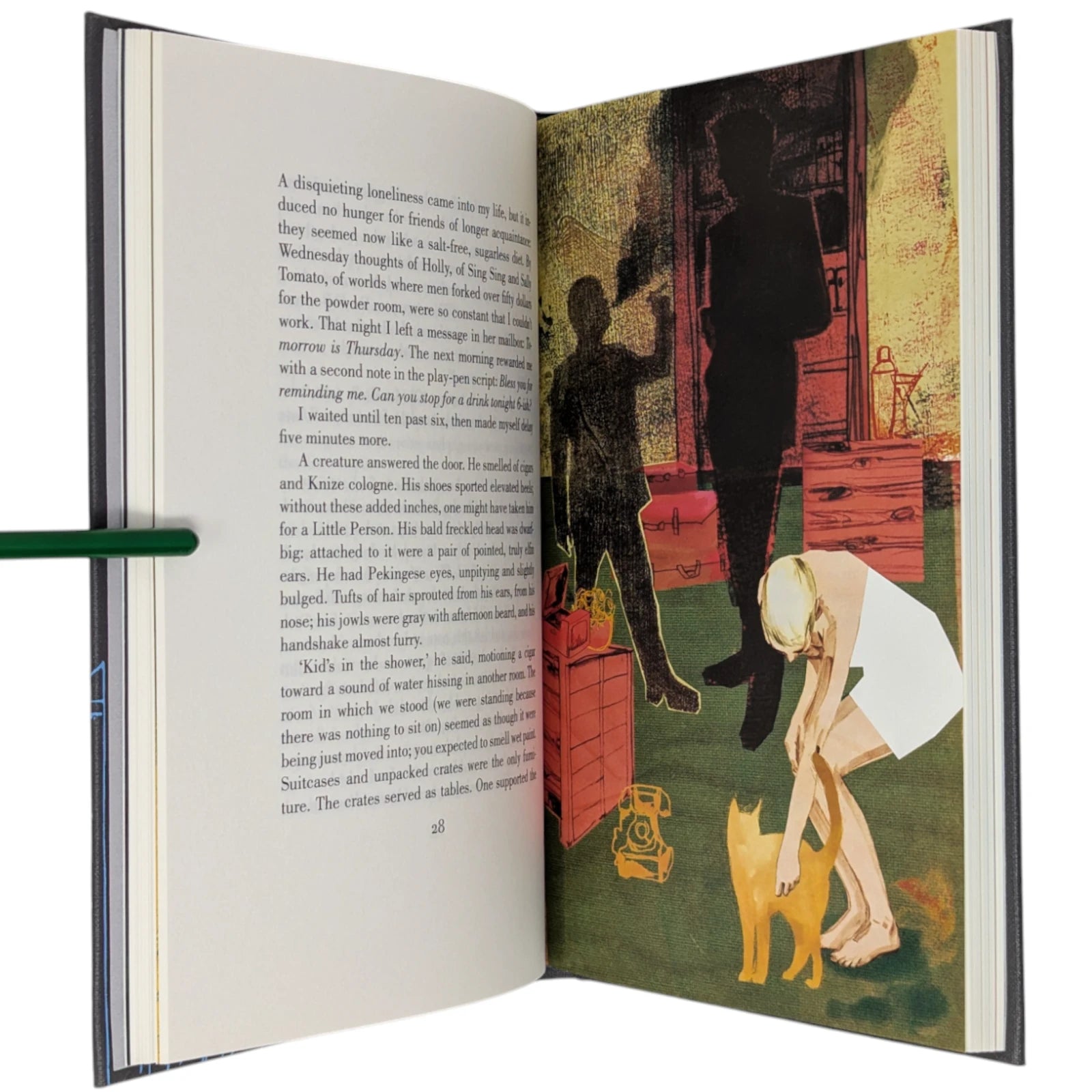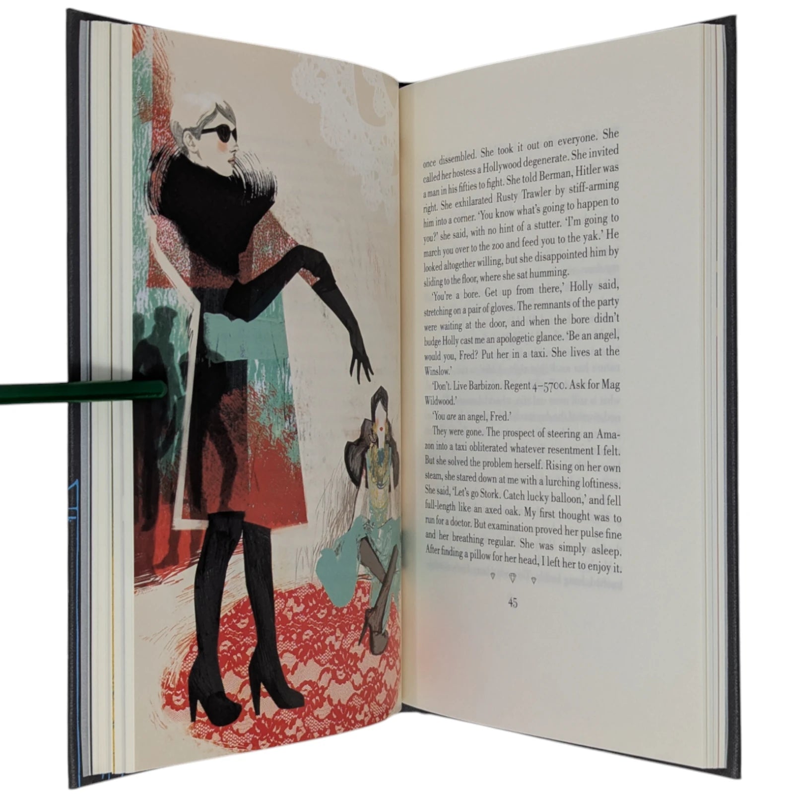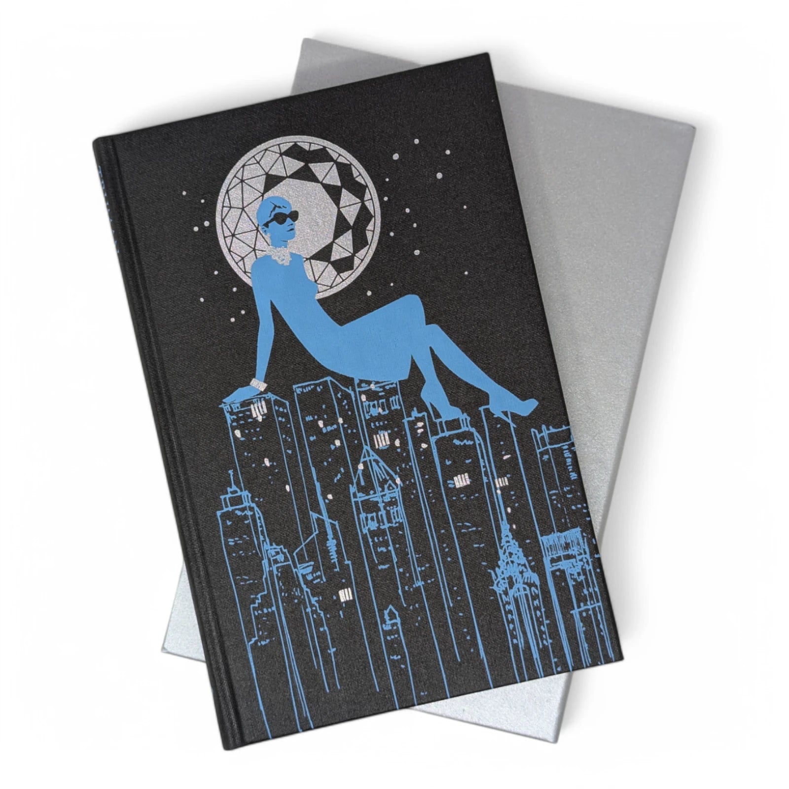 Truman Capote, Breakfast at Tiffany's. London: The Folio Society, 2013. Fourth printing, 2021. Introduced by Jay McInerney, illustrated by Karen Klassen. 229 × 150 × 19 mm. Pp. [i–viii] ix–xviii [xix–xx], [1–2] 3–107 [108]: [7] leaves of colour plates (facing pp. [iii], 13, 28, 45, 60, 77 and 92). Type: Bodoni. Printed and bound by L.E.G.O. in full dark grey buckram blocked in silver and blue with design by Klassen; silver endleaves. Dark silver slip case. The binding design was used to create notebooks, with ruled paper, for marketing campaigns and events. With the spine reading ‘A Folio Notebook’ in silver, the dimensions were reduced to 216 × 129 × 19 mm.