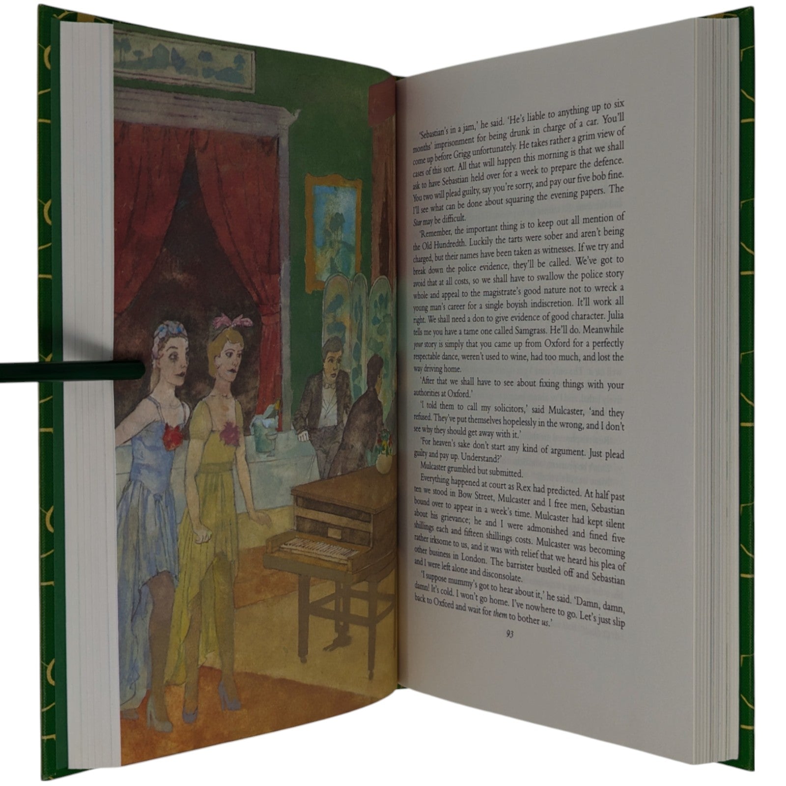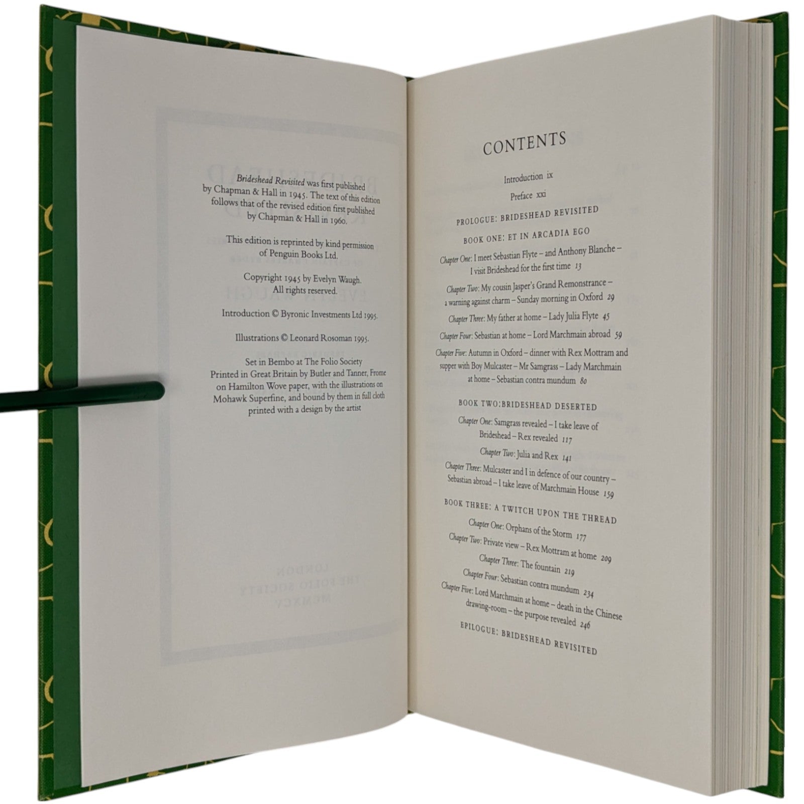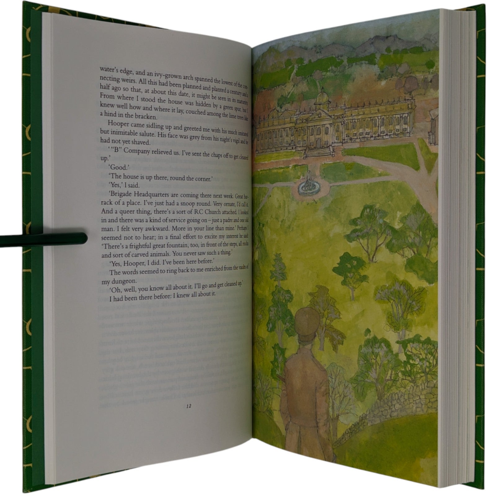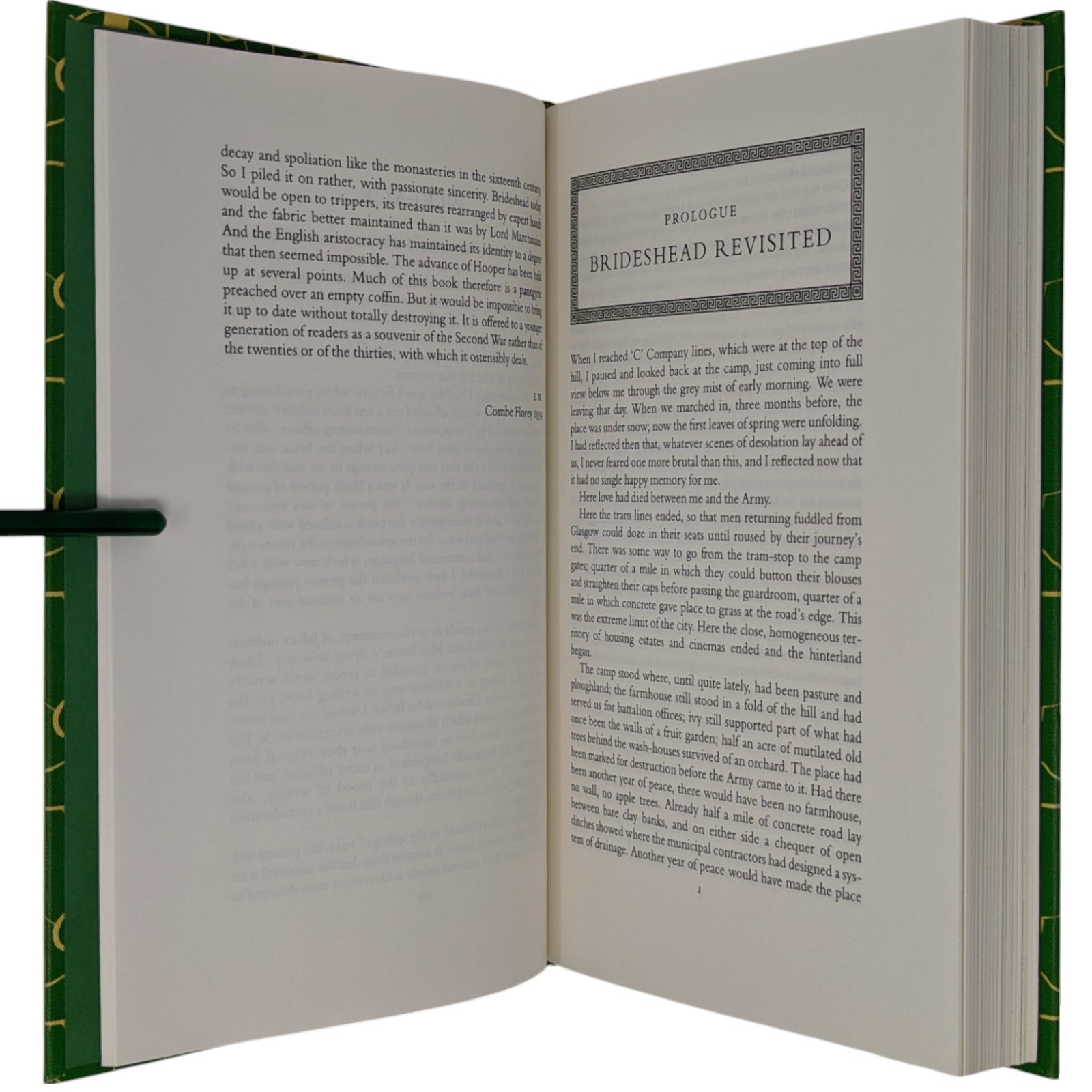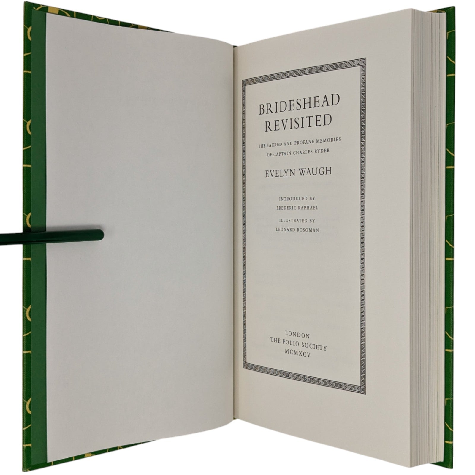 Evelyn Waugh, Brideshead Revisited: The Sacred and Profane Memories of Captain Charles Ryder. London: The Folio Society, 1995. Seventh printing thus, 2008. Introduced by Frederic Raphael, illustrated by Leonard Rosoman. 241 × 161 × 28 mm. Pp. [i–viii] ix–xix [xx], 1–275 [276]: [8] leaves of colour plates (facing pp. 76, 93, 172, 181, 205, 236, 245). Type: Bembo. Printed and bound by Cambridge University Press. Pale green cloth with a design in gold by Rosoman; dark green endleaves. Dark green slip case. Selected by Michael Howard, former Leader of the Conservative Party, as his ‘Castaway’s Choice’.