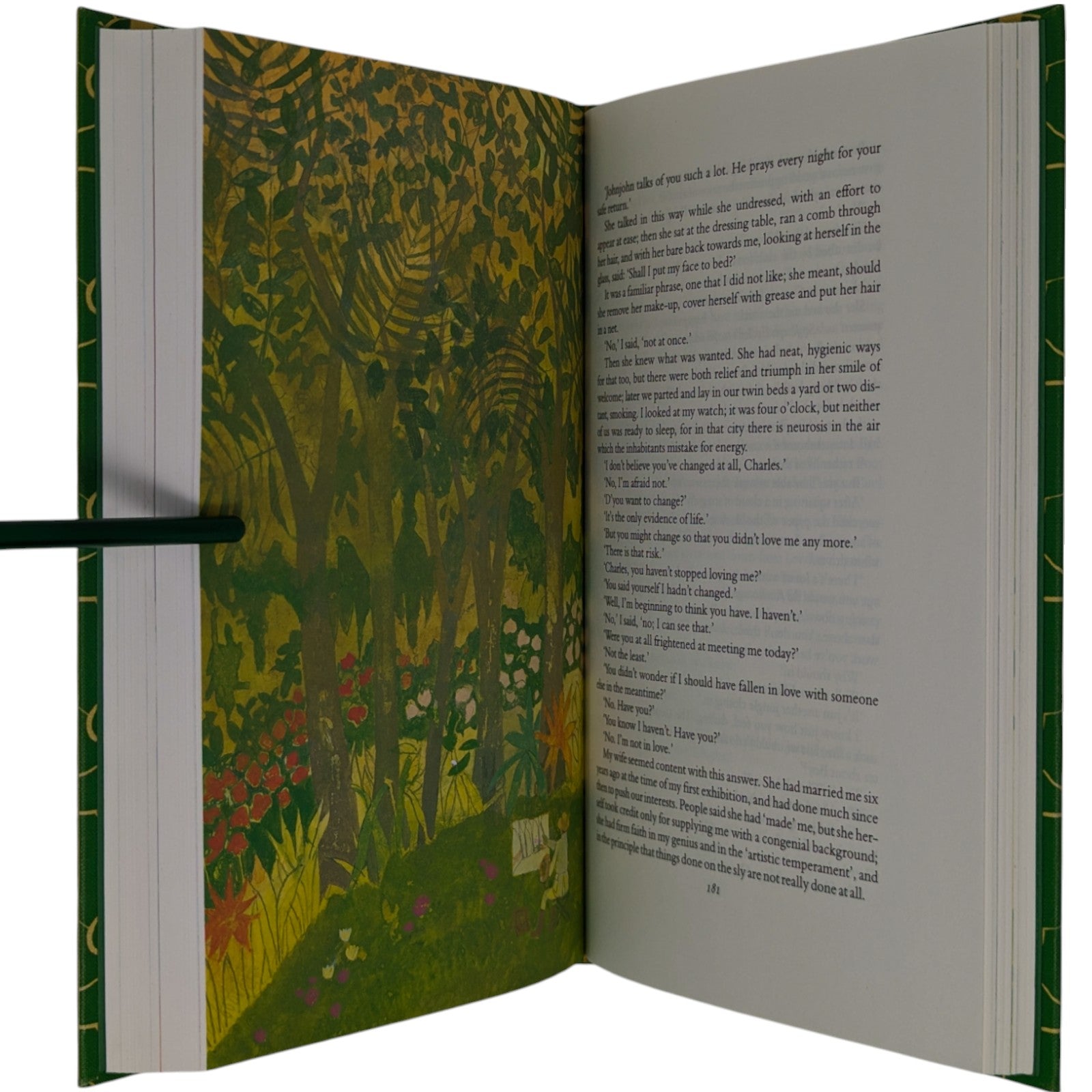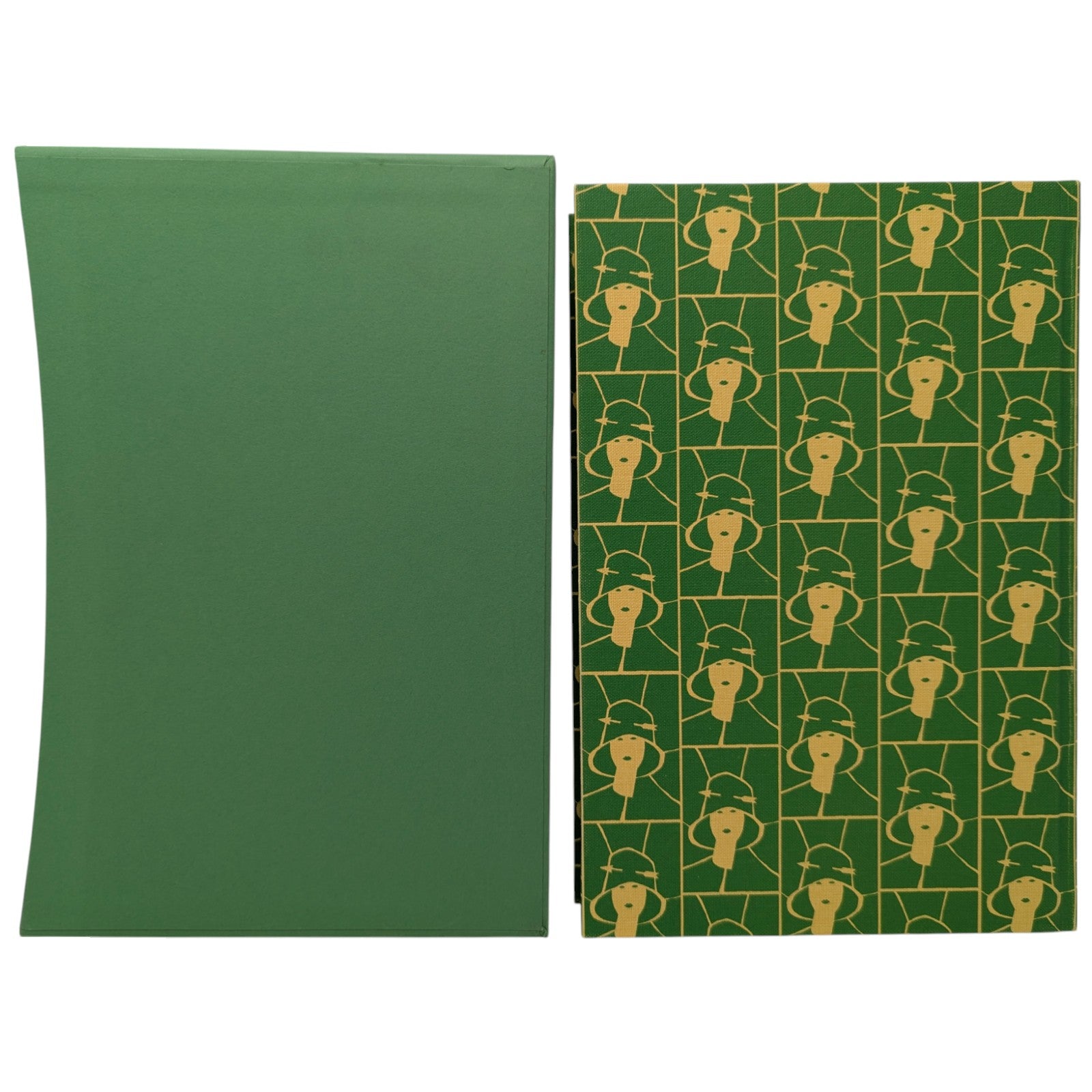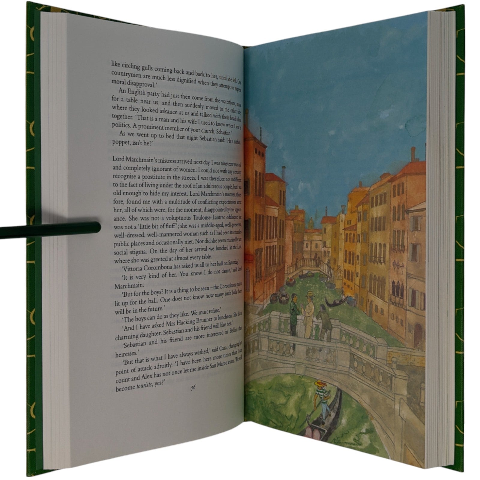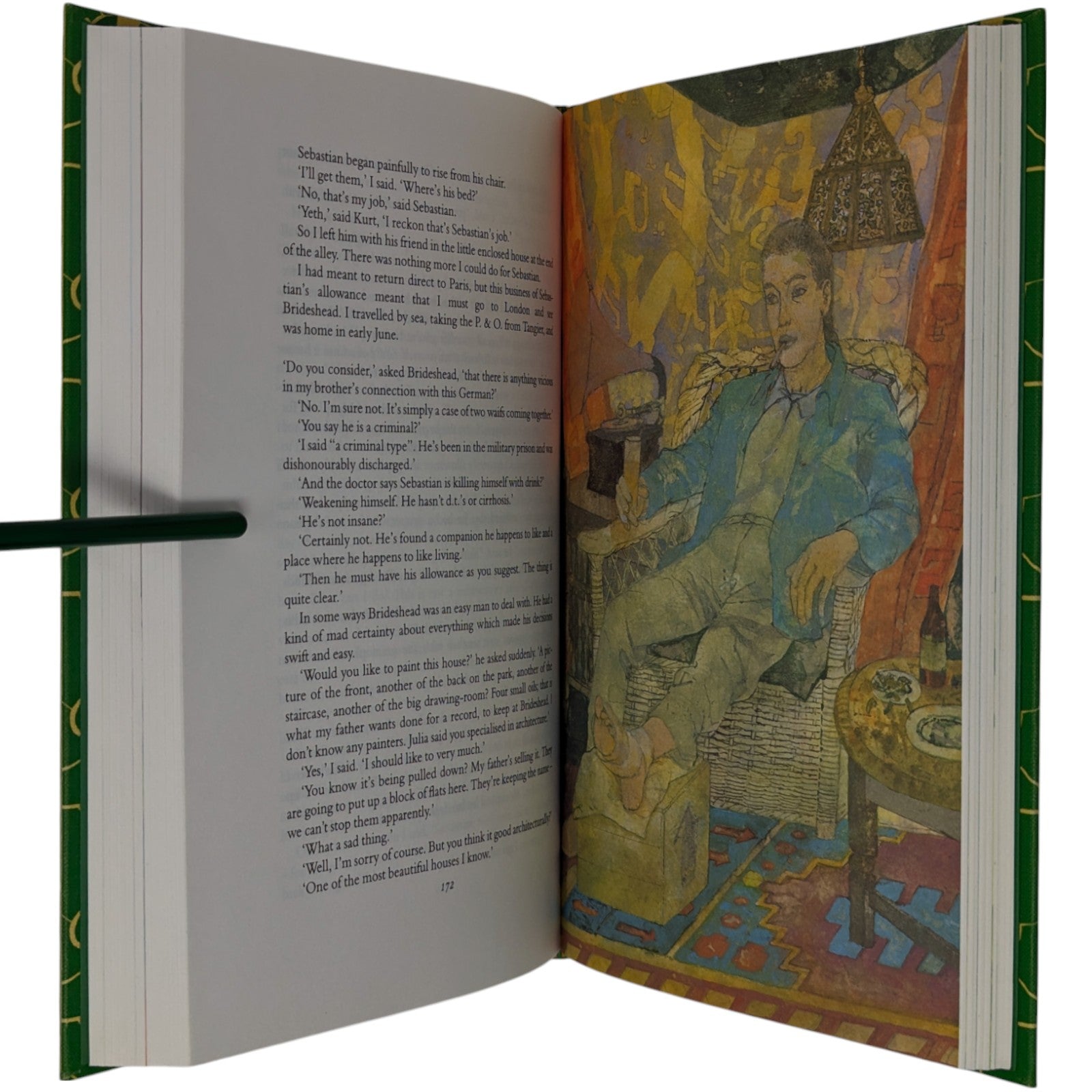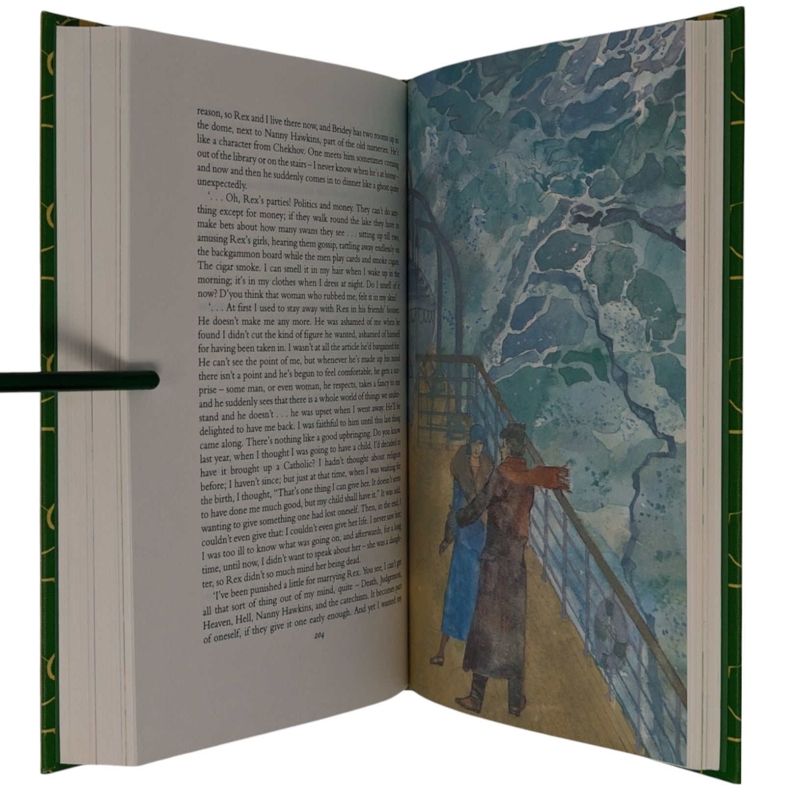 Evelyn Waugh, Brideshead Revisited: The Sacred and Profane Memories of Captain Charles Ryder. London: The Folio Society, 1995. Seventh printing thus, 2008. Introduced by Frederic Raphael, illustrated by Leonard Rosoman. 241 × 161 × 28 mm. Pp. [i–viii] ix–xix [xx], 1–275 [276]: [8] leaves of colour plates (facing pp. 76, 93, 172, 181, 205, 236, 245). Type: Bembo. Printed and bound by Cambridge University Press. Pale green cloth with a design in gold by Rosoman; dark green endleaves. Dark green slip case. Selected by Michael Howard, former Leader of the Conservative Party, as his ‘Castaway’s Choice’.