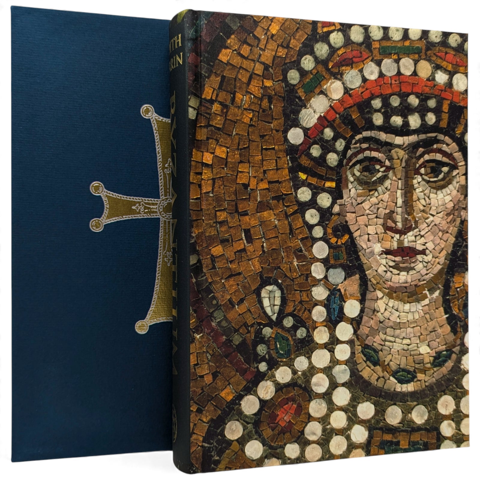 HERRIN, Judith. Byzantium, The Surprising Life of a Medieval Empire. London: The Folio Society, 2022. First printing thus. With a new preface by the author. 253 × 177 × 43 mm. Pp. [i–v] vi–xxv [xxvi], [1–3] 4–428 [429–430]: [14] leaves of colour plates. Type: Bembo Book with Baker Signet for display. Printed and bound by Neografia in full cloth printed with detail from mosaic and blocked in gold; dark blue-green endleaves. Dark blue-green slip case blocked with cross in silver and gold. The plates reproduce photographs ranging from mosaics and frescoes to manuscripts and metal work. Six maps are on pages [389–399] and further black and white illustrations are in the text.