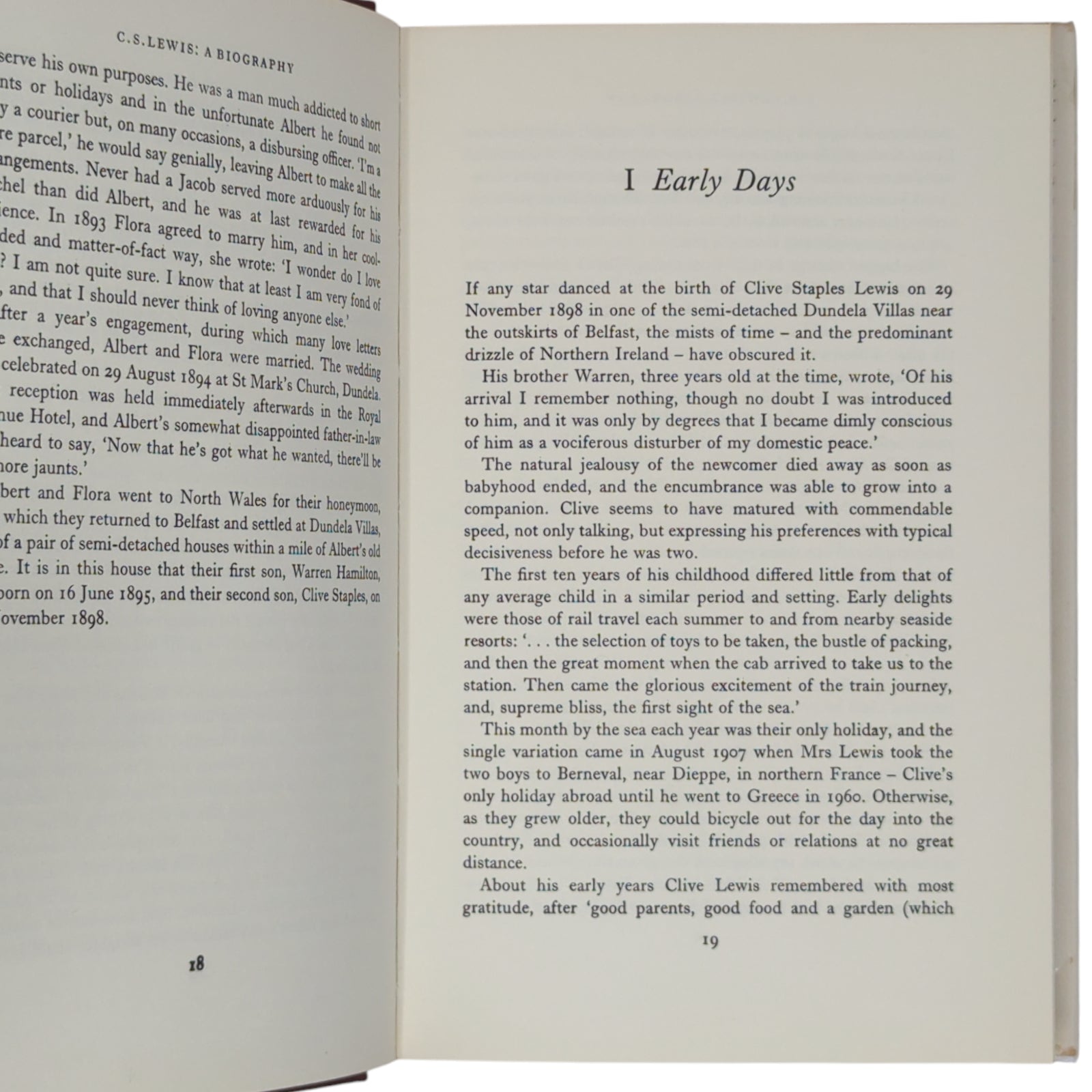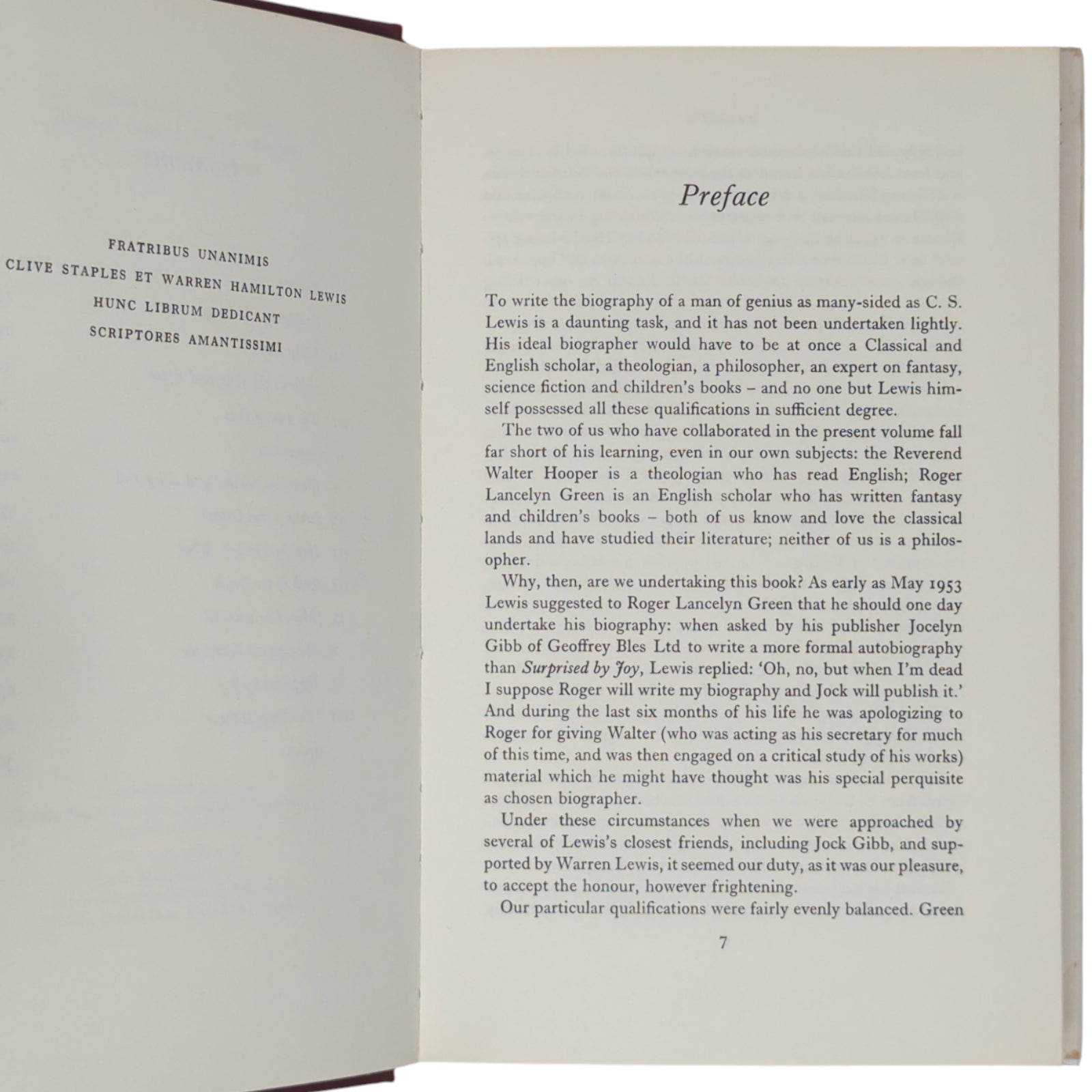 GREEN, Roger Lancelyn; HOOPER, Walter. C. S. Lewis: A Biography. London: Collins, 1974. First edition, second printing of this biography of C.S. Lewis written by two of C. S. Lewis's friends. Publisher's burgundy binding, gilt lettering to spine; with original, unclipped (£3.50) dustwrapper.