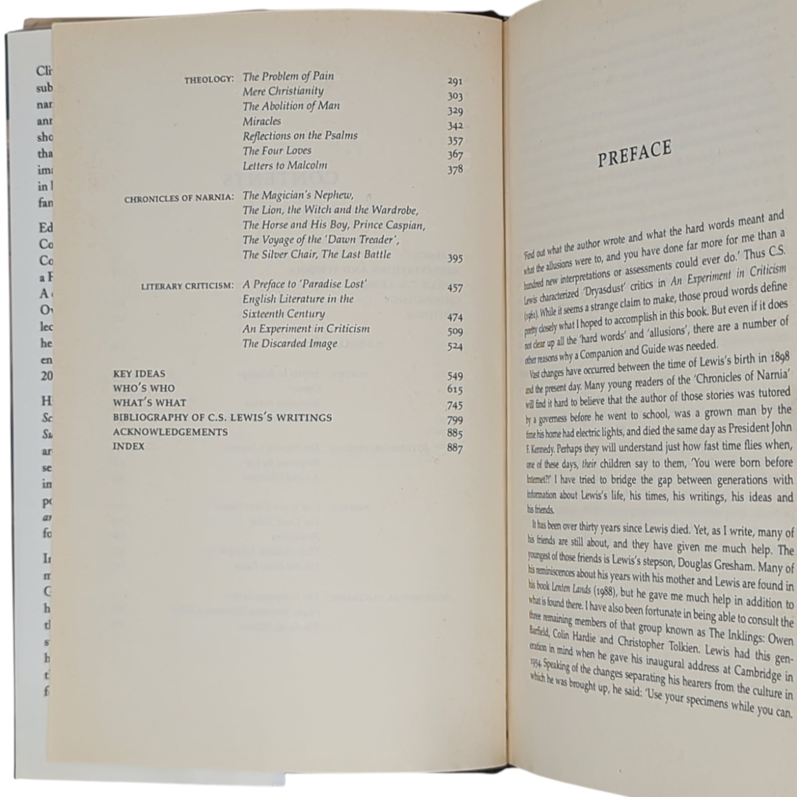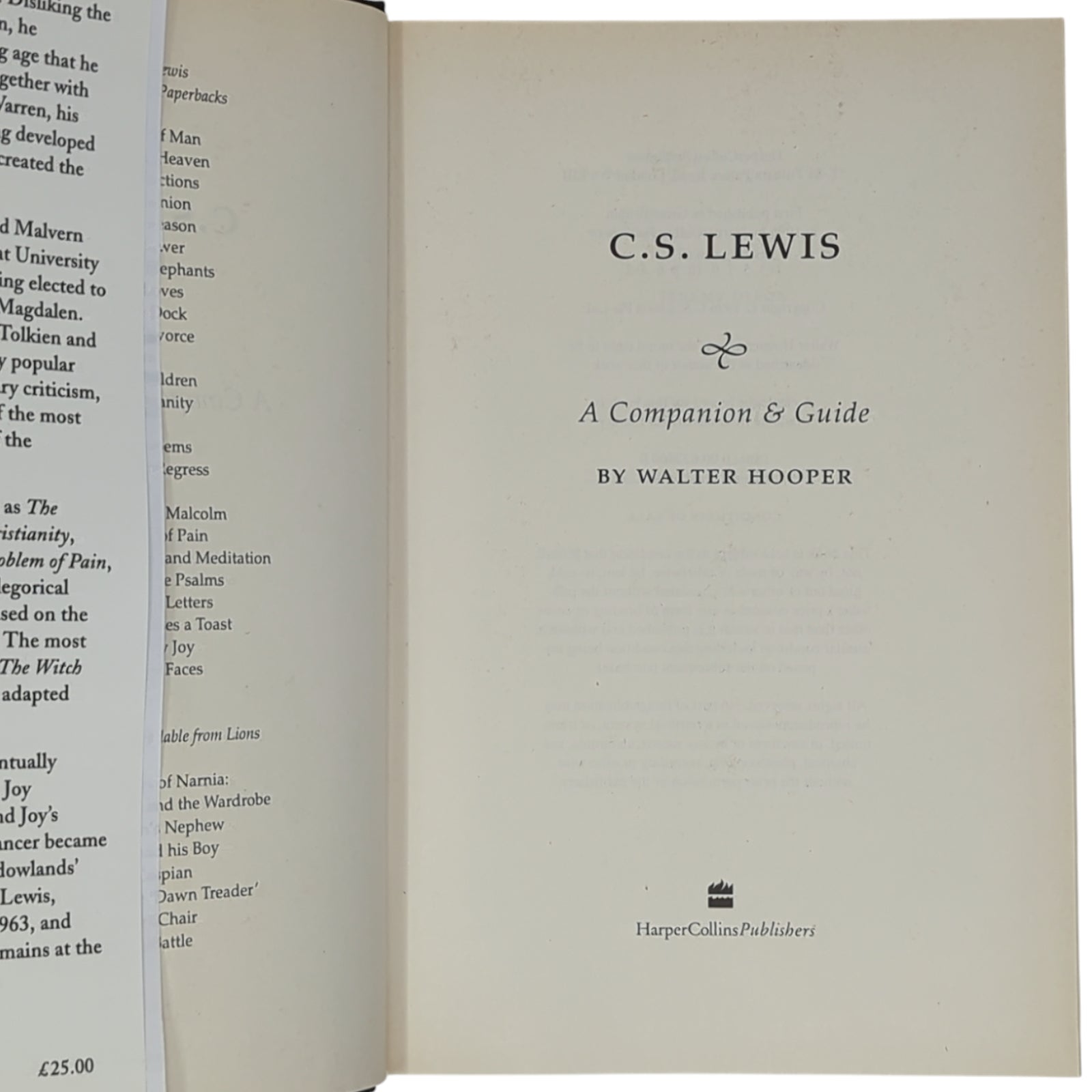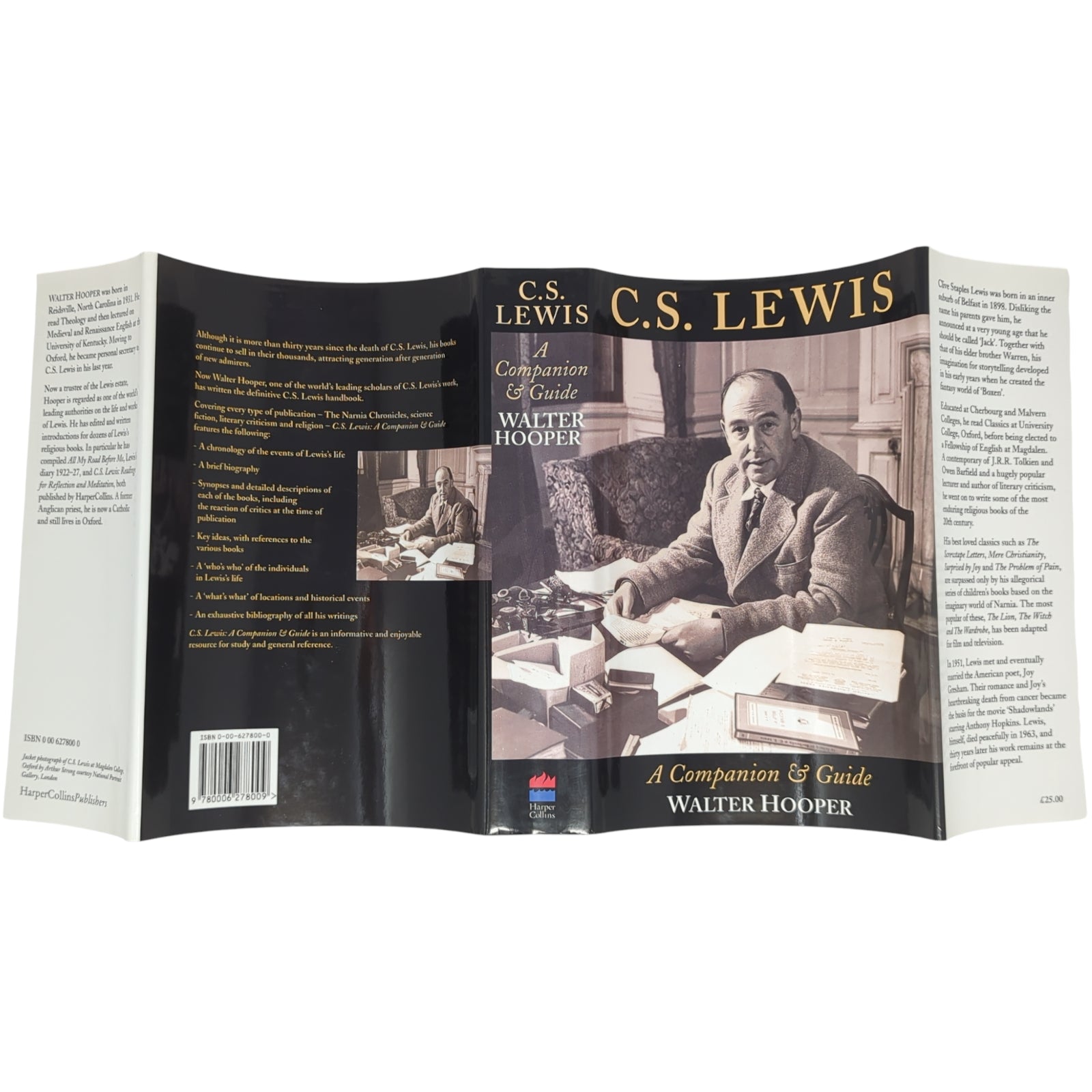 HOOPER, Walter. C. S. Lewis: A Companion and Guide. London: HarperCollins,1996. First printing of this exhaustive guide to the entire works of C. S. Lewis, including the religious works, the literary criticism, the fiction and the children’s books. Publisher's quarter black cloth binding with paper sides, gilt titles to spine, plain endpapers; in unclipped (£25.00) dust wrapper.