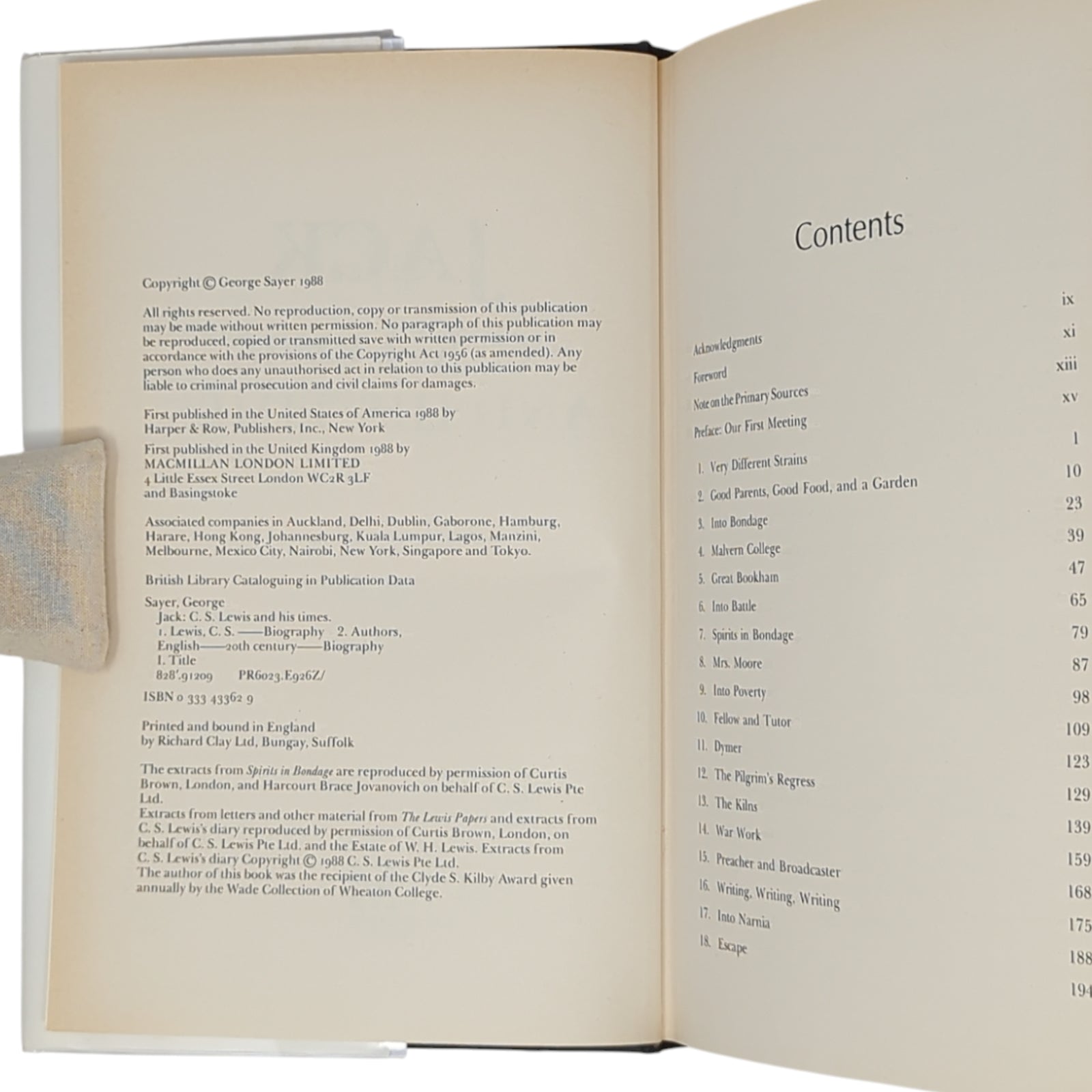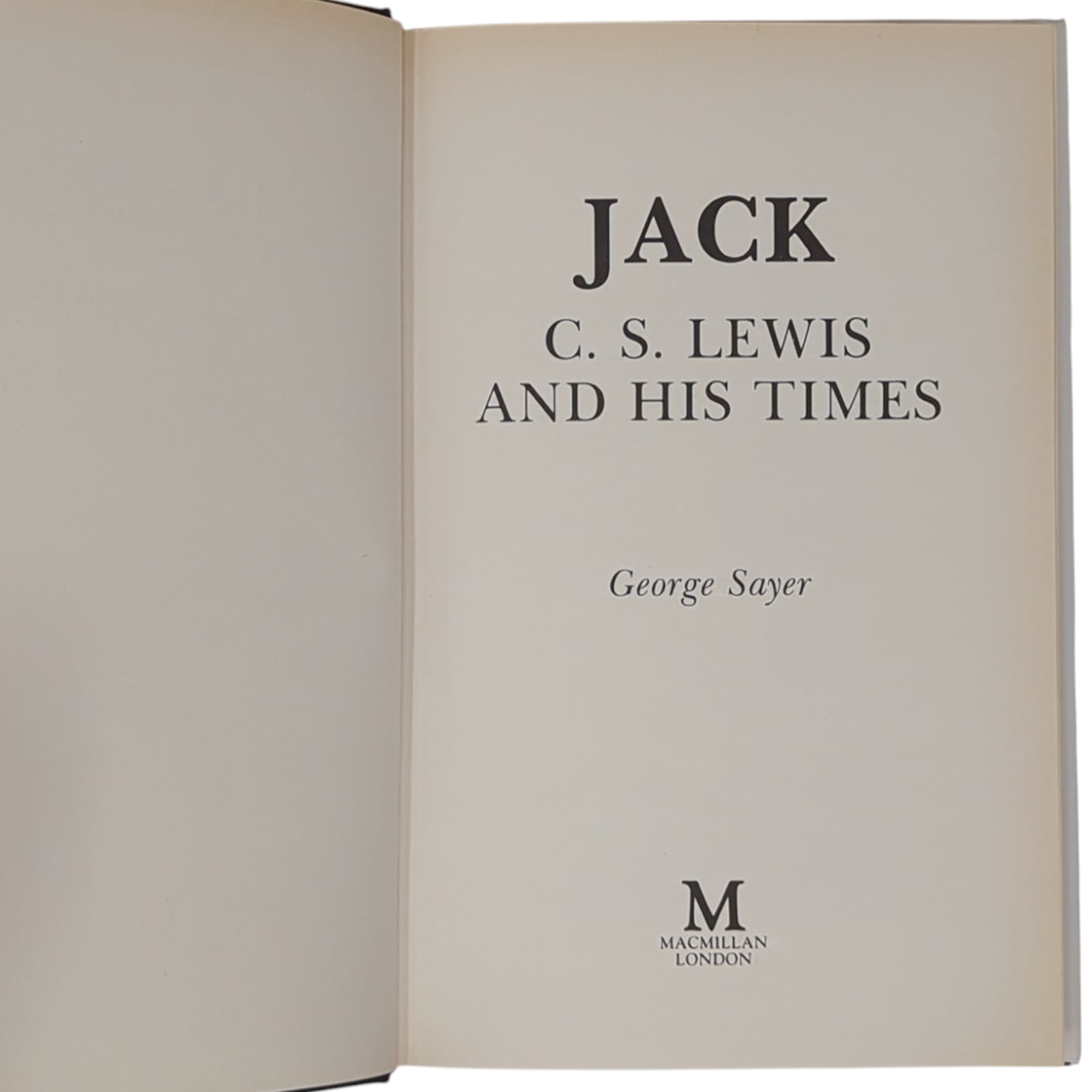 SAYER, George. JACK: C. S. Lewis and His Times. London: Macmillan, 1988. First UK edition, first printing of this biography of Lewis written by a lifelong friend, and tracing his life and career, his childhood and education, and his major writings.