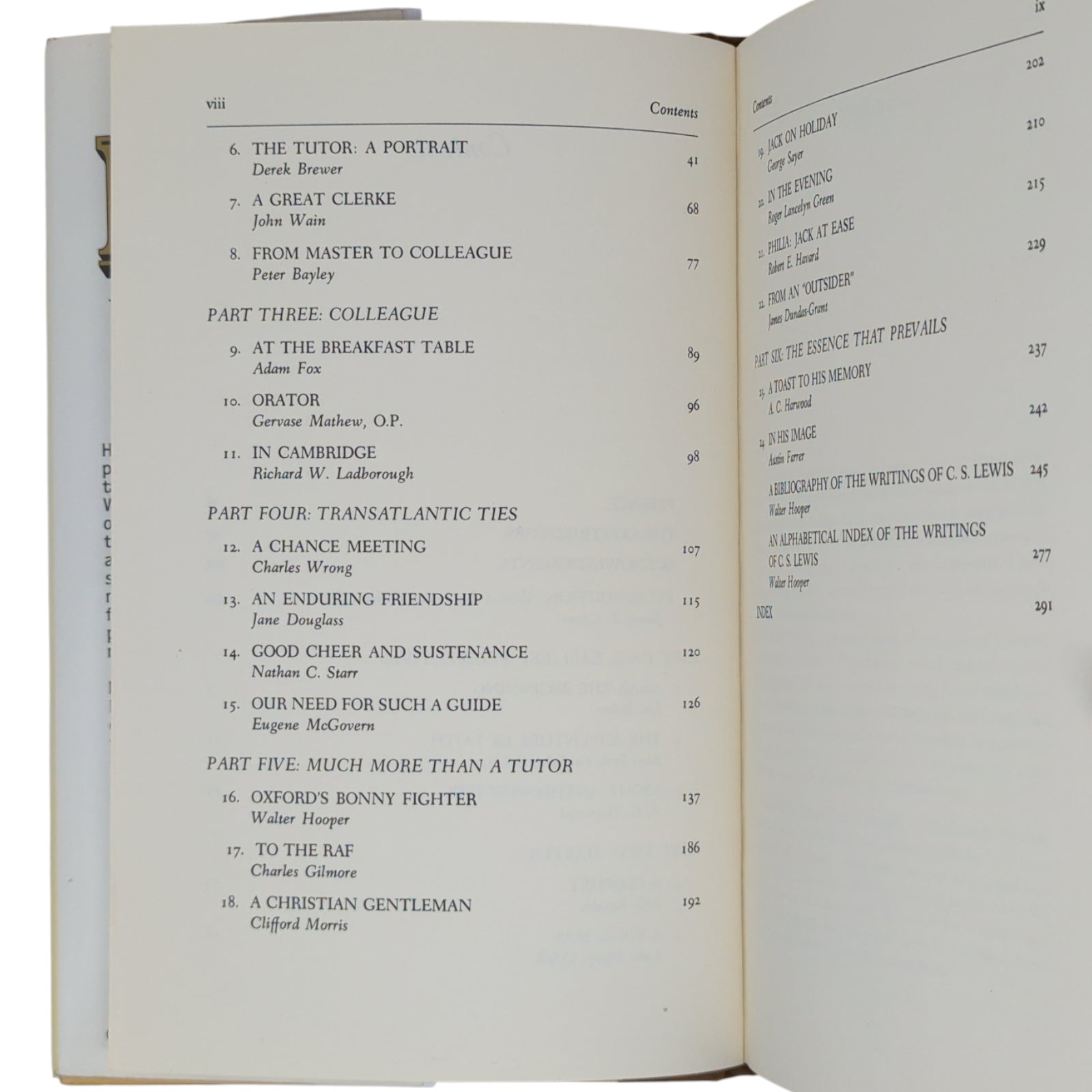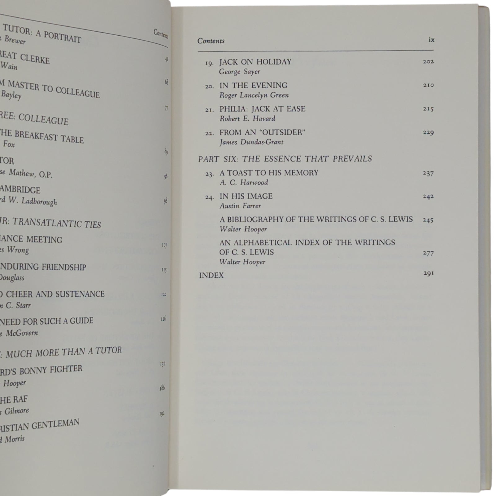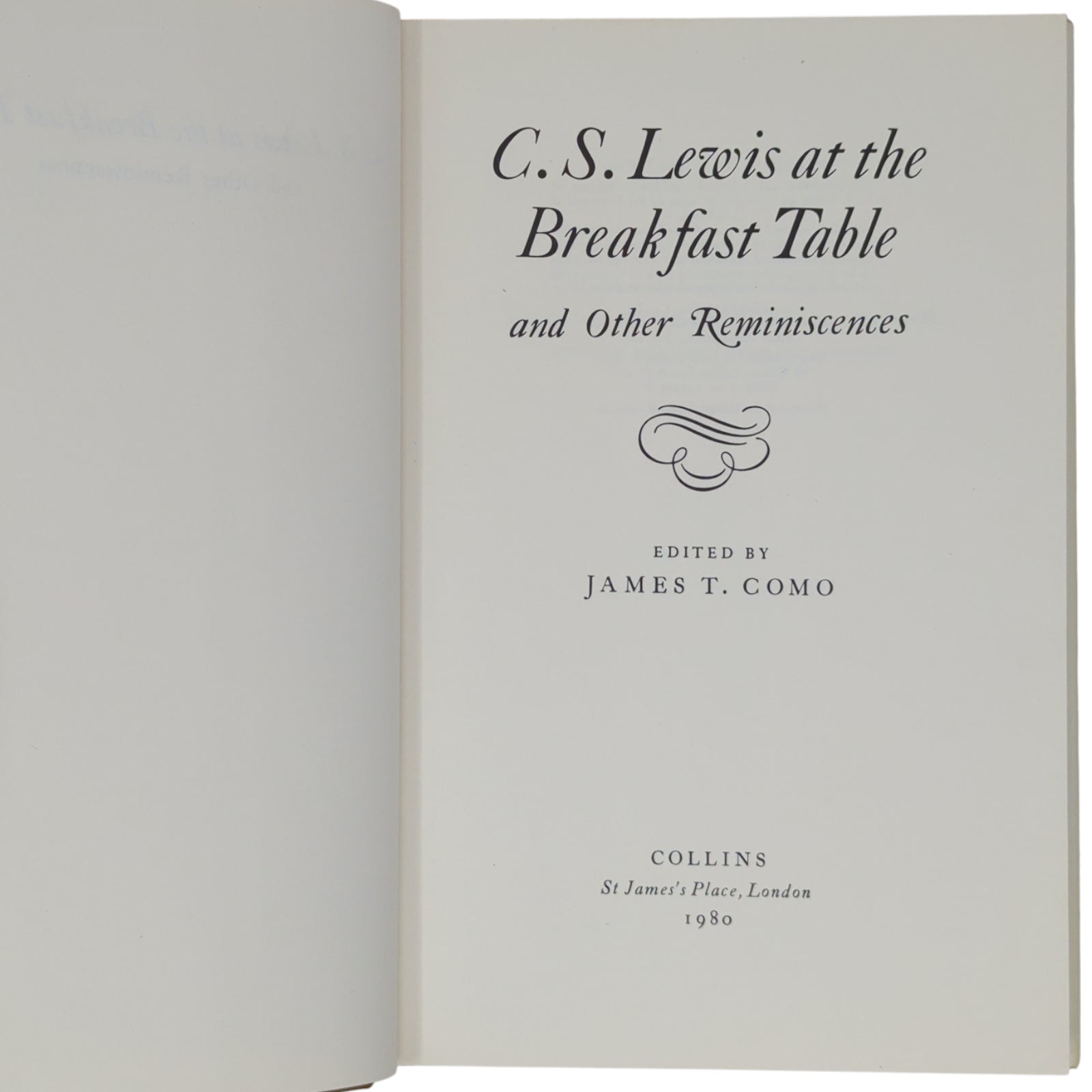 COMO, James T. C. S. Lewis at the Breakfast Table and Other Reminiscences. London: Collins, 1980. First UK edition, first impression of this collection of essays by twenty-two men and women whose reminiscences of Lewis as teacher, colleague, and friend form an intimate, candid, and sometimes surprising community biography.
