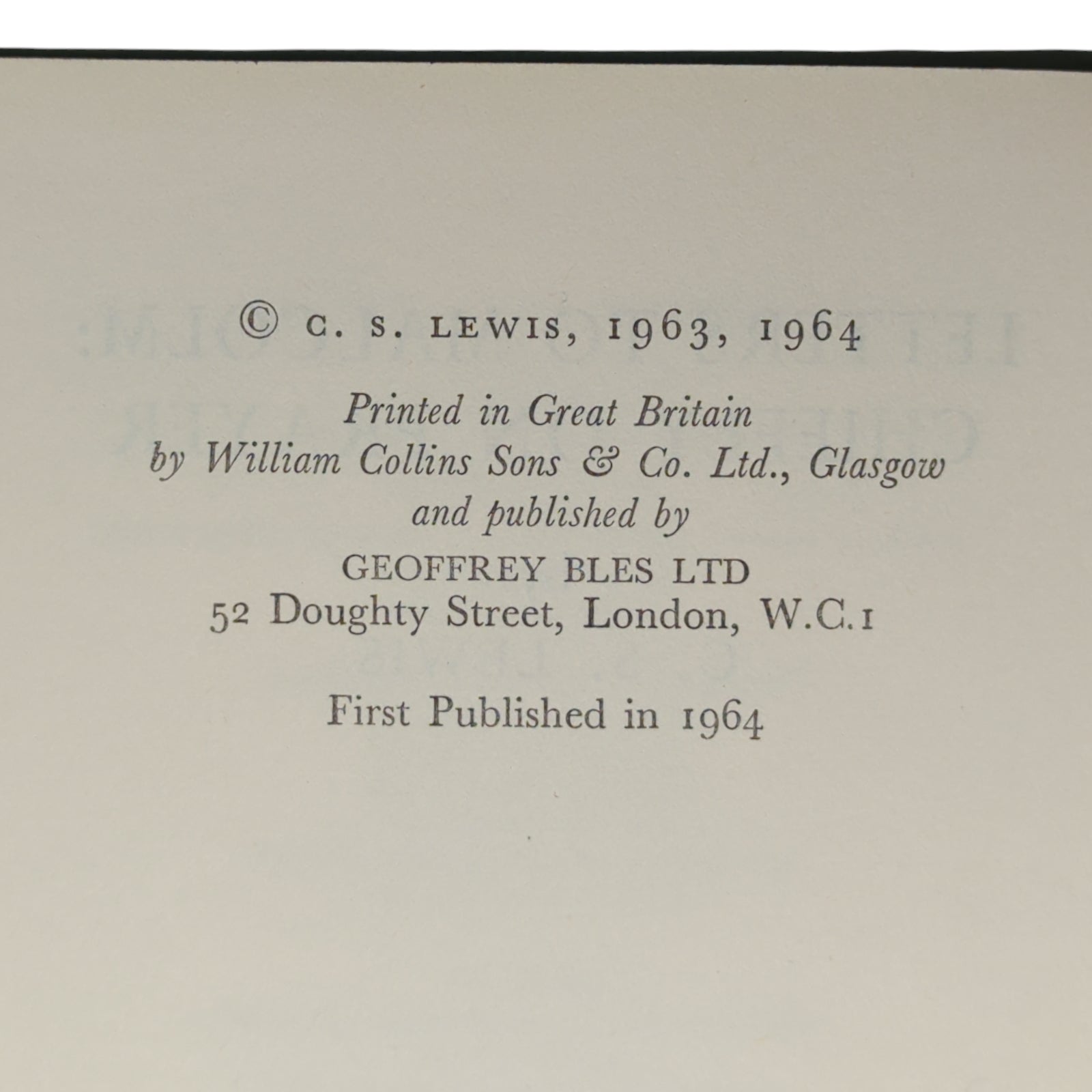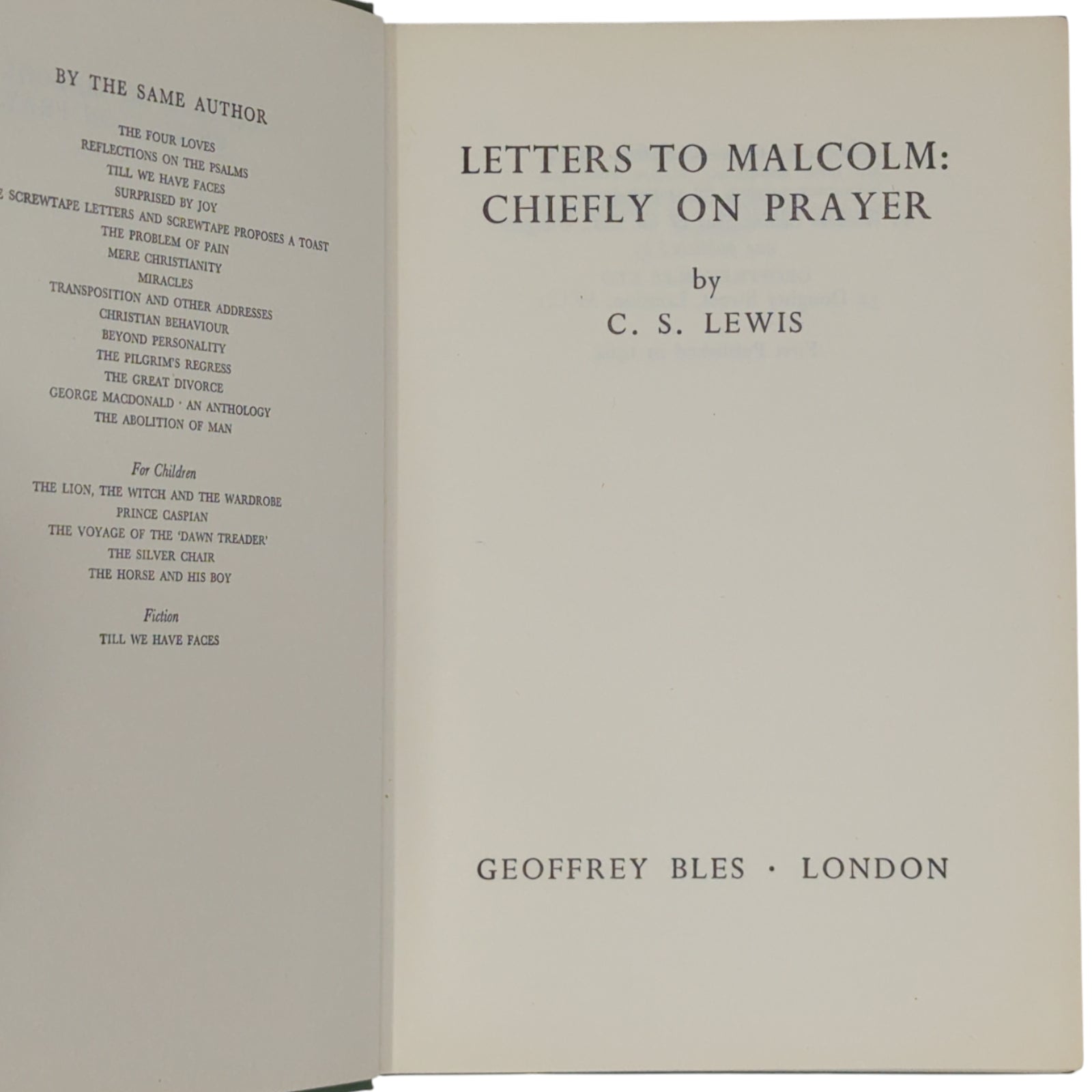 - LEWIS, C.S. Letters to Malcolm: Chiefly on Prayer. Geoffrey Bles, 1964. First printing. A good-only ex-Library copy with library stickers to spine, paste downs and FFEP; else clean and uninscribed. No dustwrapper.