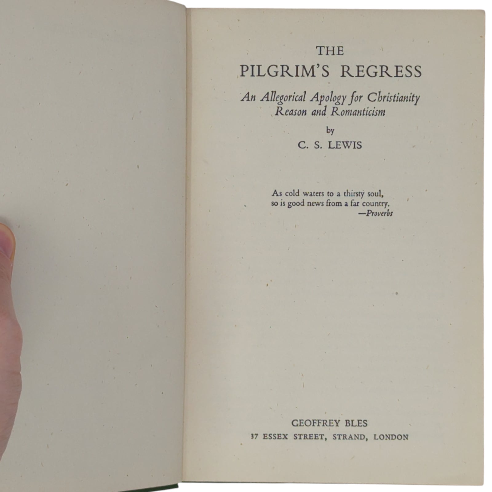 - LEWIS, C.S. The Pilgrim's Regress. Geoffrey Bles, 1933. 1944 reprint. A good-only ex-library book with pen inscription and card pocket to FFEP; else clean and uninscribed. Without dustjacket.