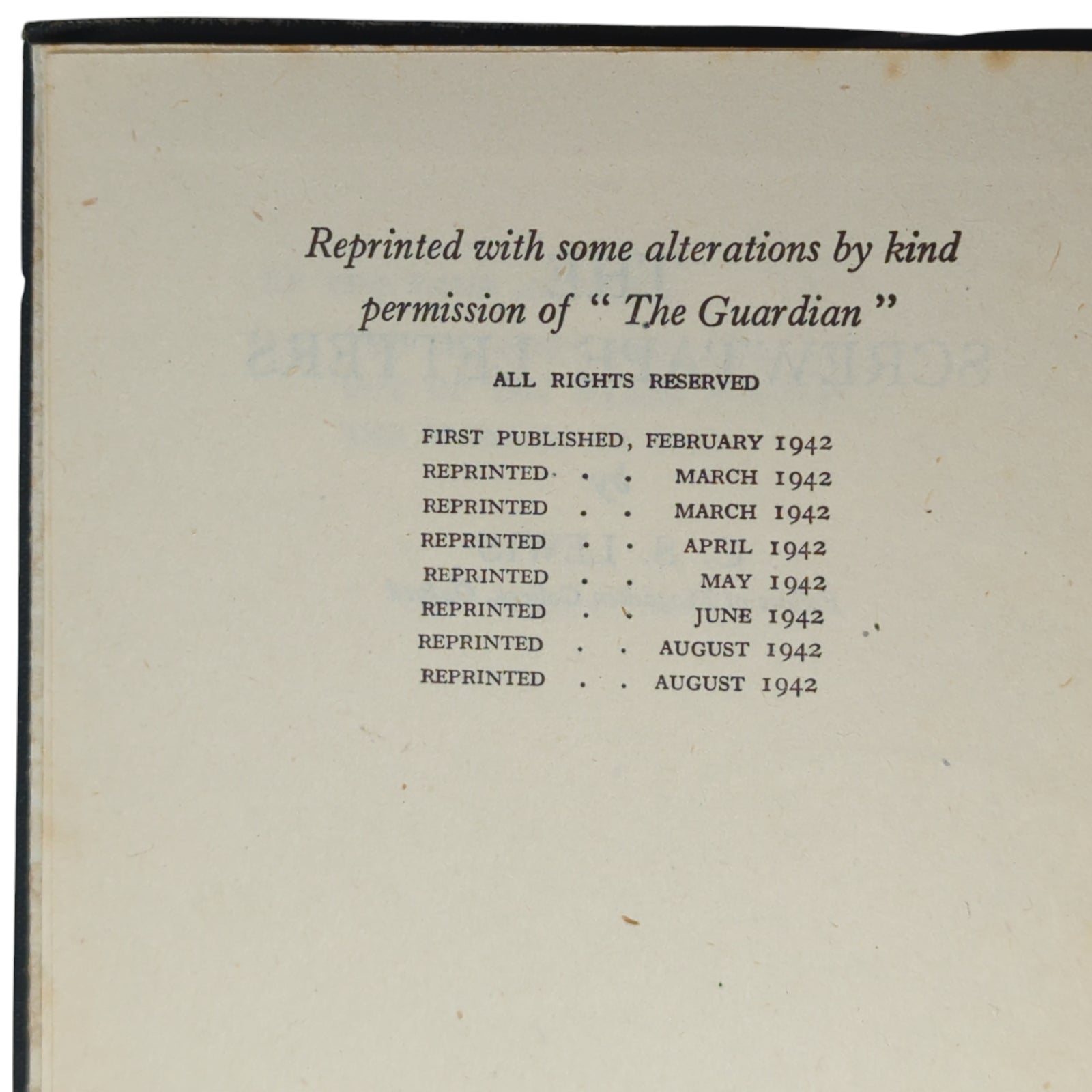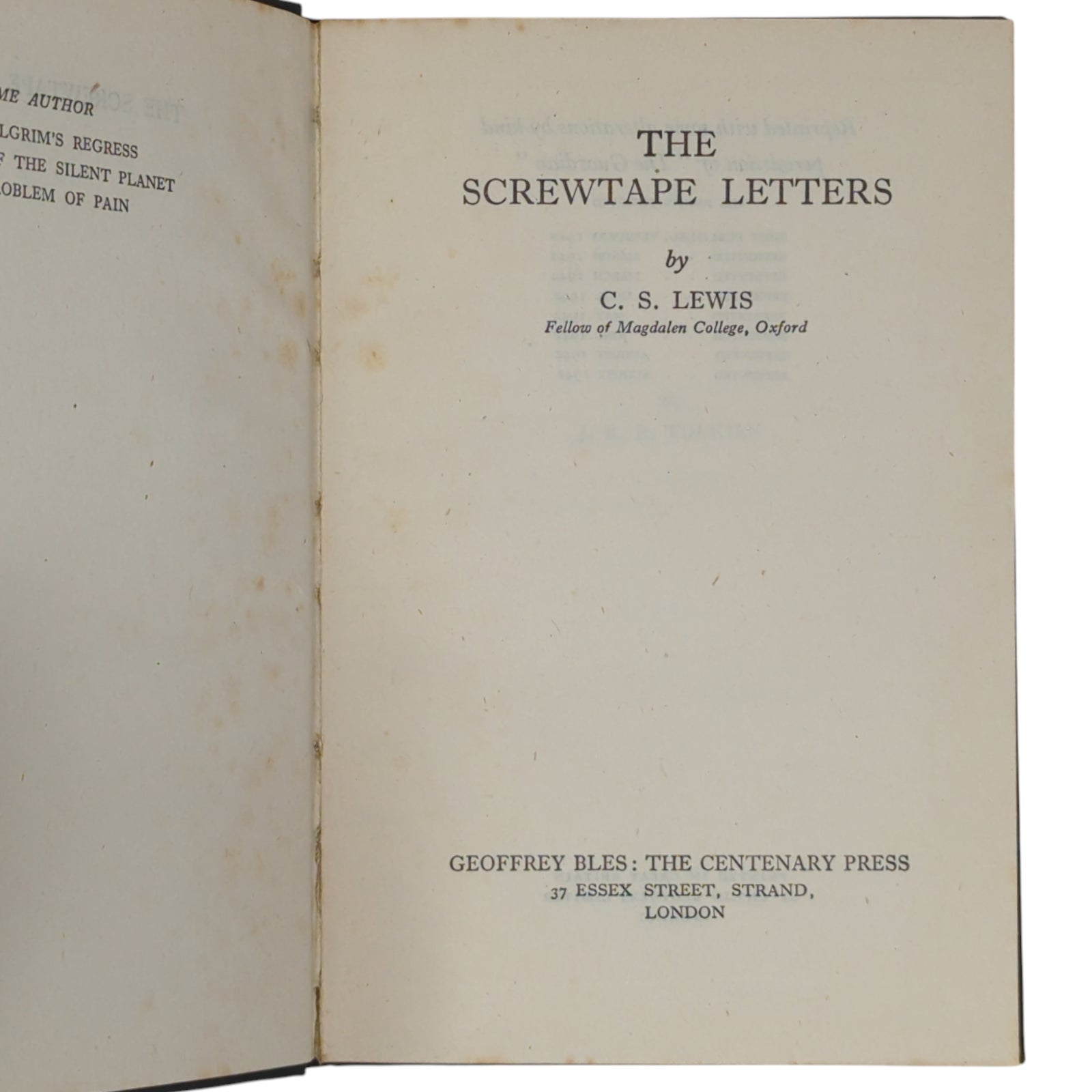 - LEWIS, C.S. The Screwtape Letters. Geoffrey Bles, 1942. 7th reprint, 1942. A very poor copy with gift inscription to FFEP and rear free end paper removed; else clean and uninscribed. Without dustjacket.