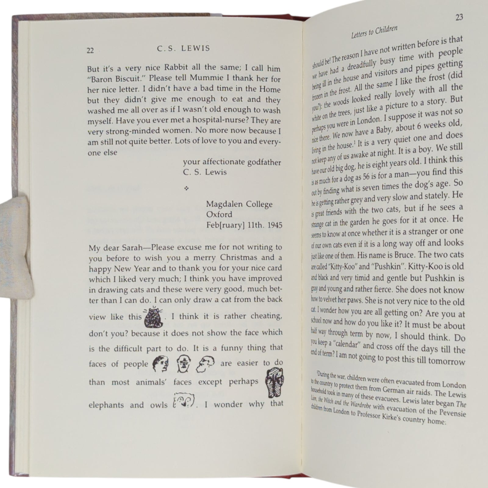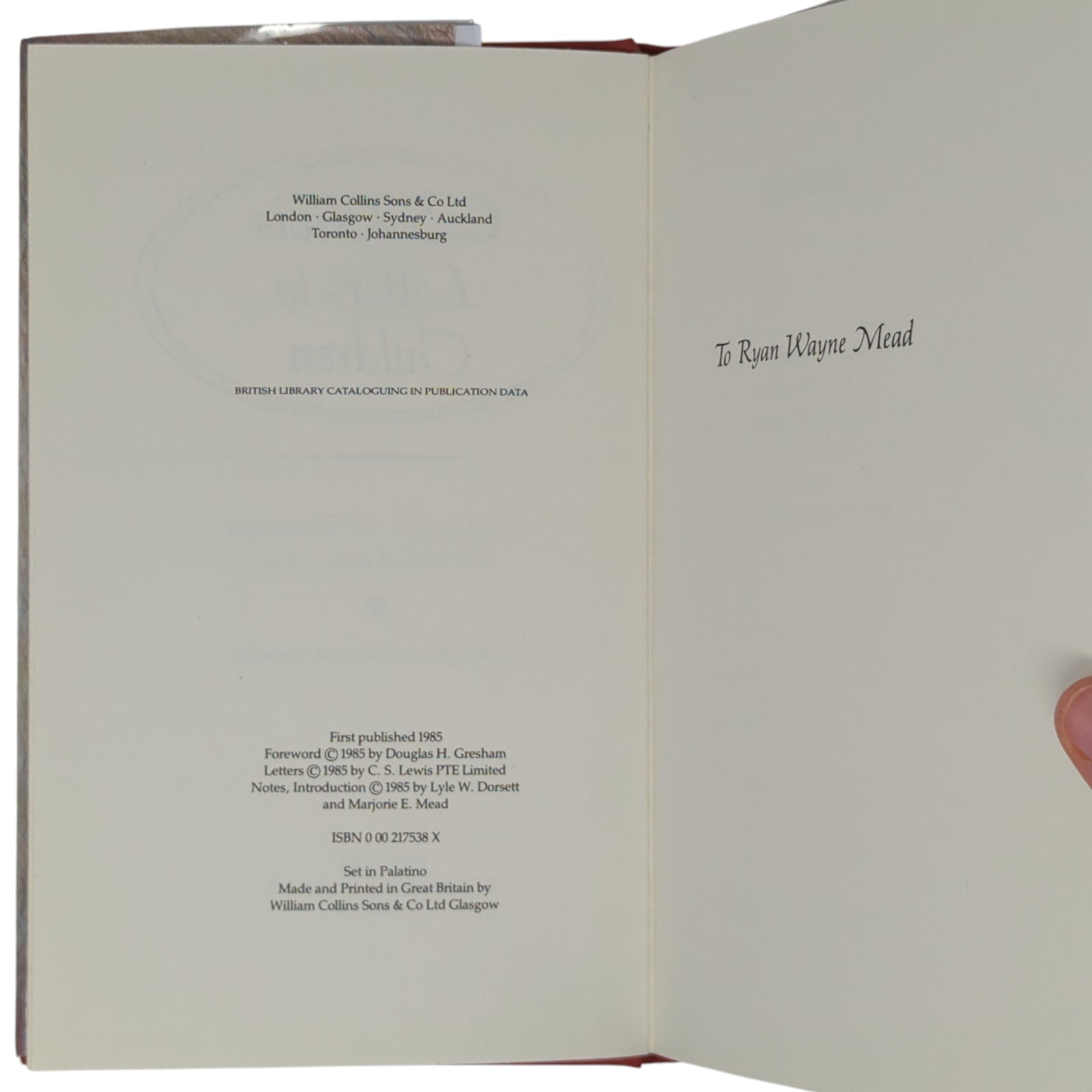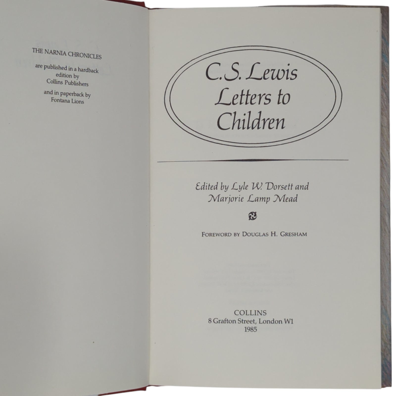 LEWIS, C.S. (Written by); DORSETT, Lyle W.; MEAD, Marjorie Lamp (Edited by). C. S. Lewis: Letters to Children. London: Collins, 1985. First edition, first printing of this lovely anthology of letters written by C. S Lewis in response to letters from young fans who were eager for more knowledge of his bestselling Narnia books and their author. In these responses, he shares his feelings about writing, school, animals, and of course, Narnia.