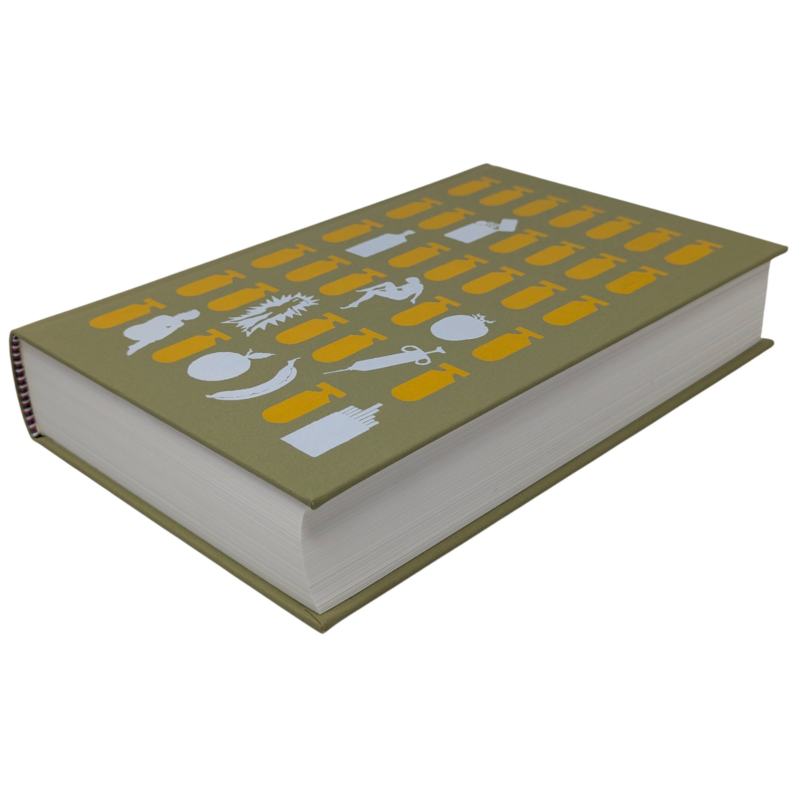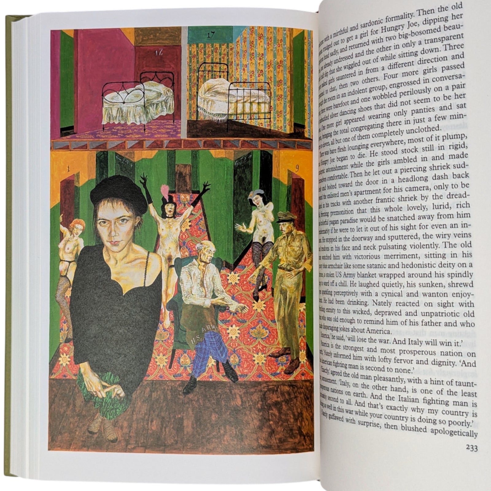 Introduction by Malcolm Bradbury, illustrations by Neil Packer. 252 × 168 × 43 mm. Pp. [i–vi] vii–xxix [xxx–xxxii], 1–438 [439–440]: [9] leaves of colour plates (facing pp. [iii], 32, 129, 144, 233, 248, 328, 345 and 433). Type: Plantin with Stencil for display. Printed and bound by the Bath Press. Full pale green-brown artificial cloth with a design in white, yellow, red and dark blue by Packer; cream endleaves with a design of military aircraft in dark green-grey by Packer. Blue slip case. The plates reproduce Packer’s remarkable paintings, which capture well the surreal violence of the novel. This title was the ‘Castaway’s Choice’ of Terry Gilliam.