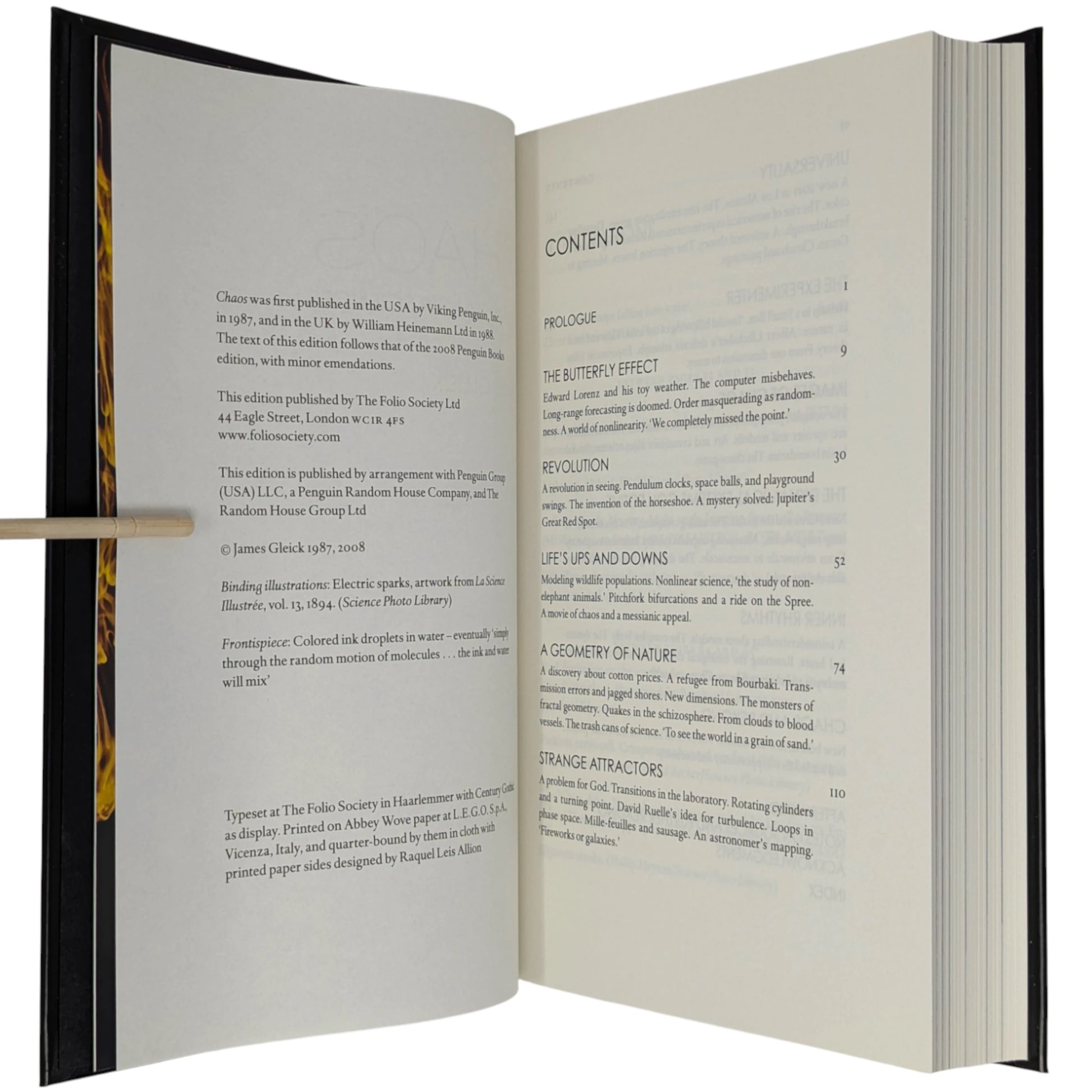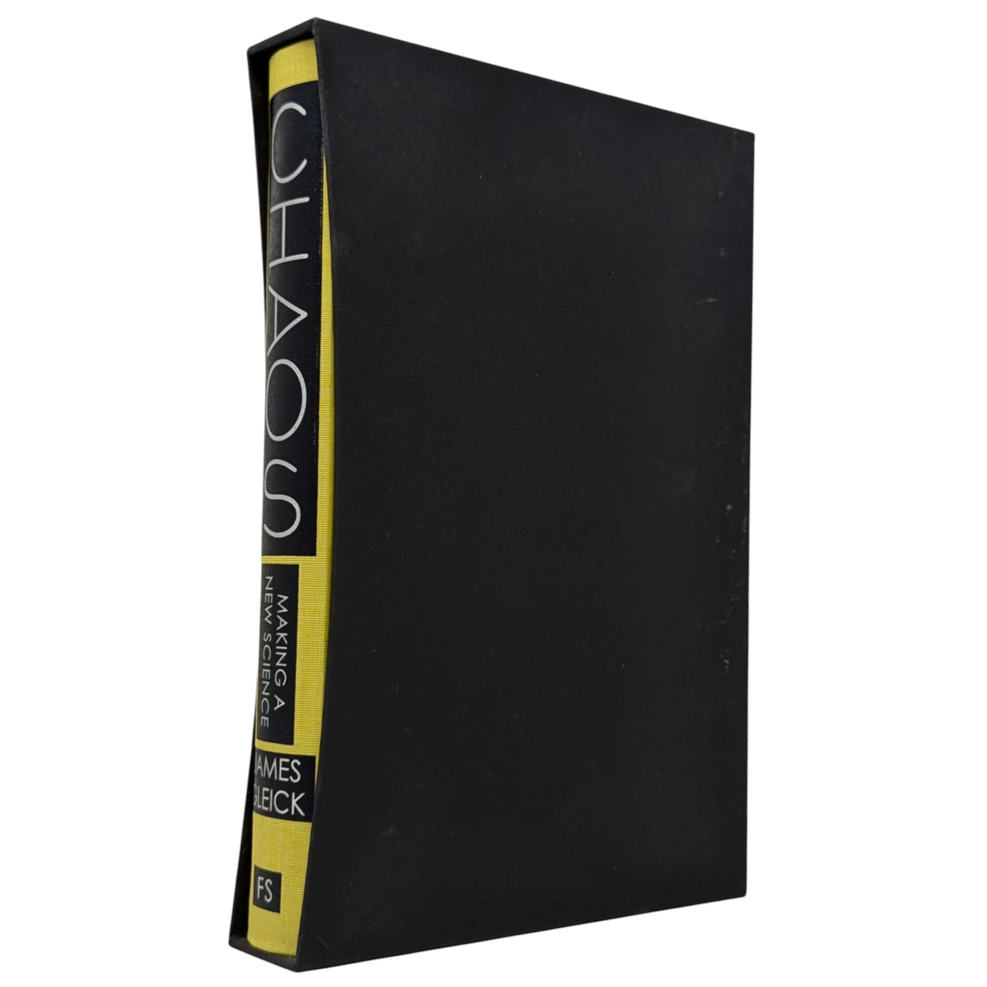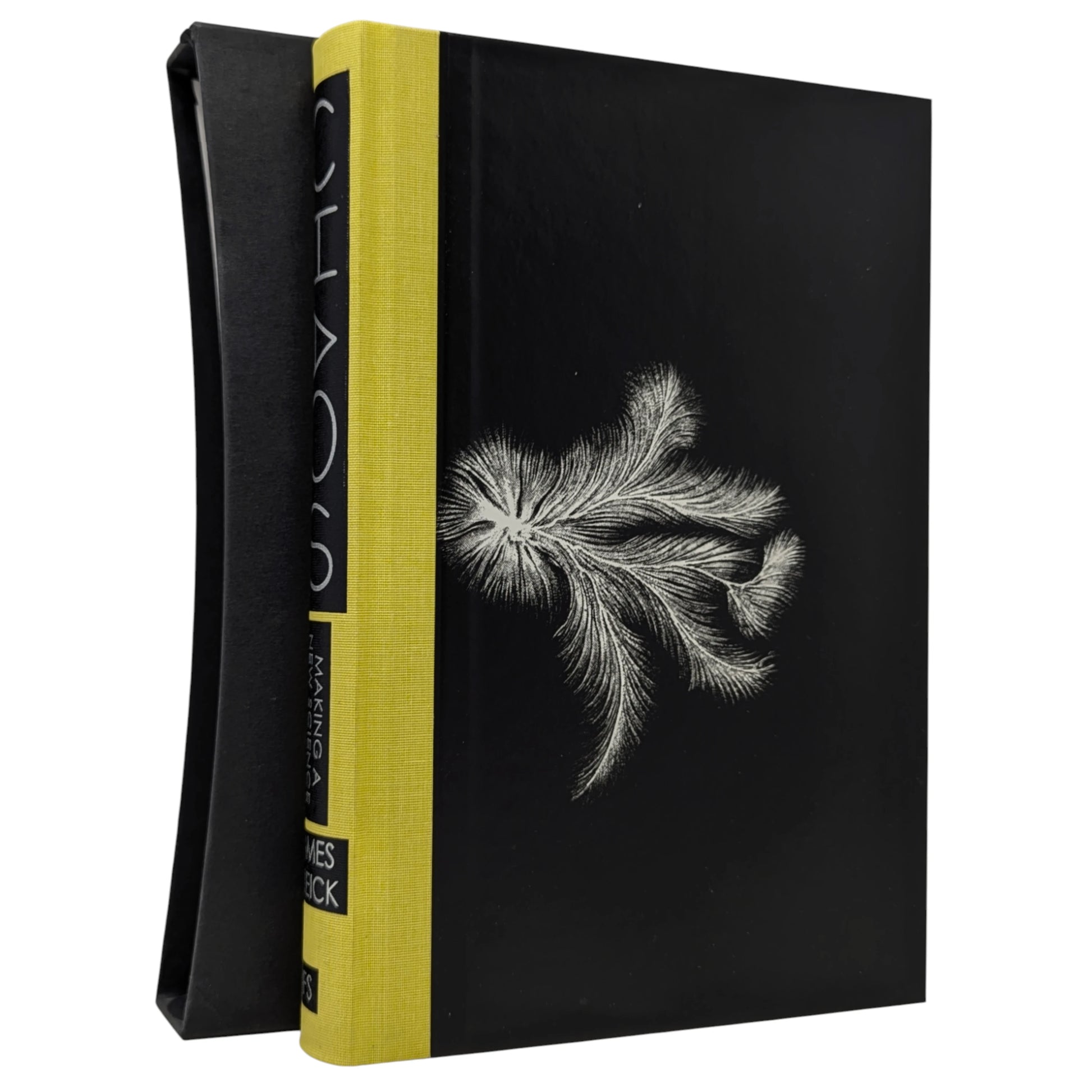 Chaos, Making a New Science, James Gleick. London: The Folio Society, 2015. First printing thus. 241 × 162 × 32 mm. Pp. [i–v] vi–ix [x–xvi], [1] 2–347 [348–352]: [13] leaves of colour plates. Type: Haarlemmer with Century Gothic for display. Printed and bound by L.E.G.O. in quarter yellow cloth with printed paper boards with a design by Raquel Leis Allion; black endleaves. Black slip case. The plates reproduce photographs from science and nature. In the text are black and white images. The first in the Folio Modern Science Collection.