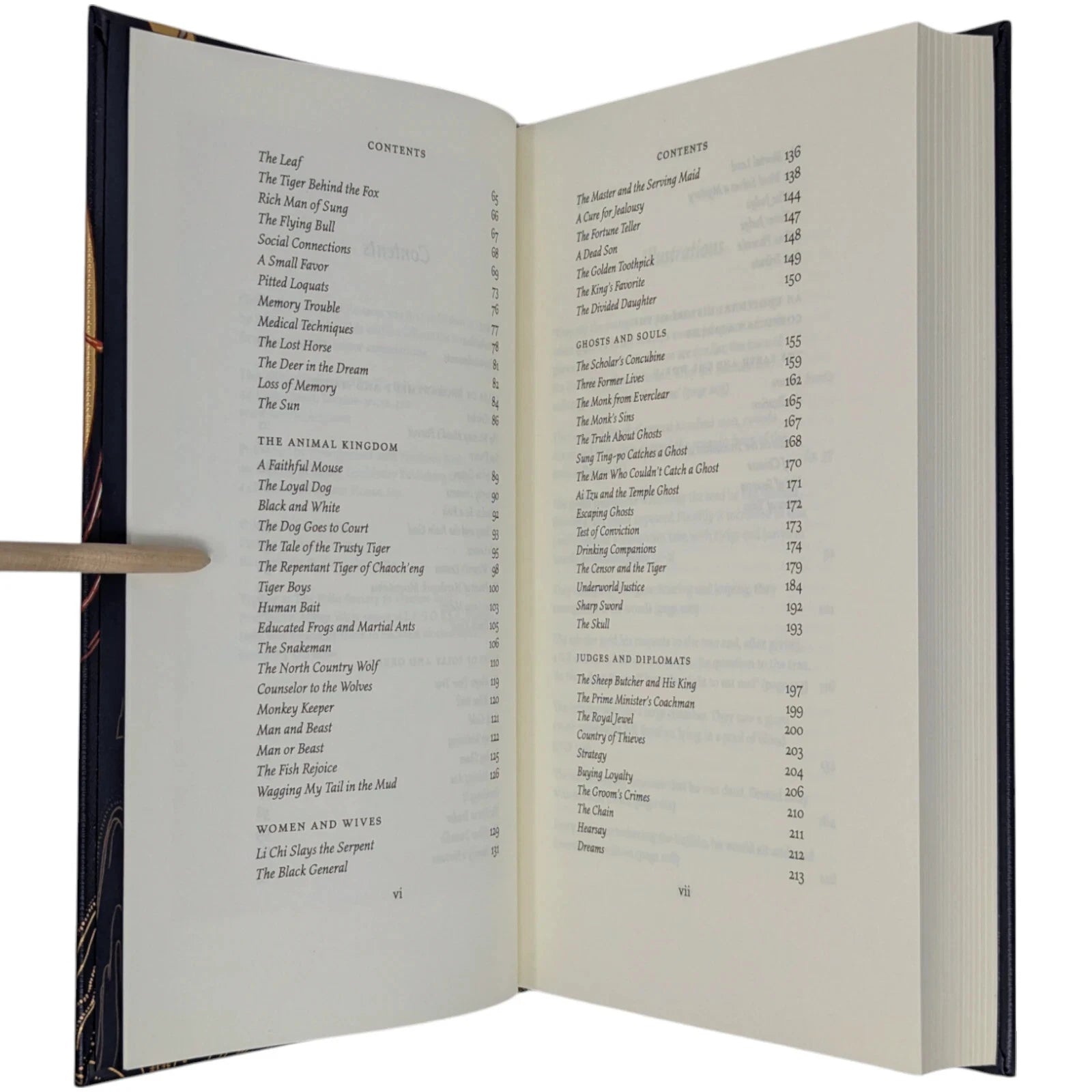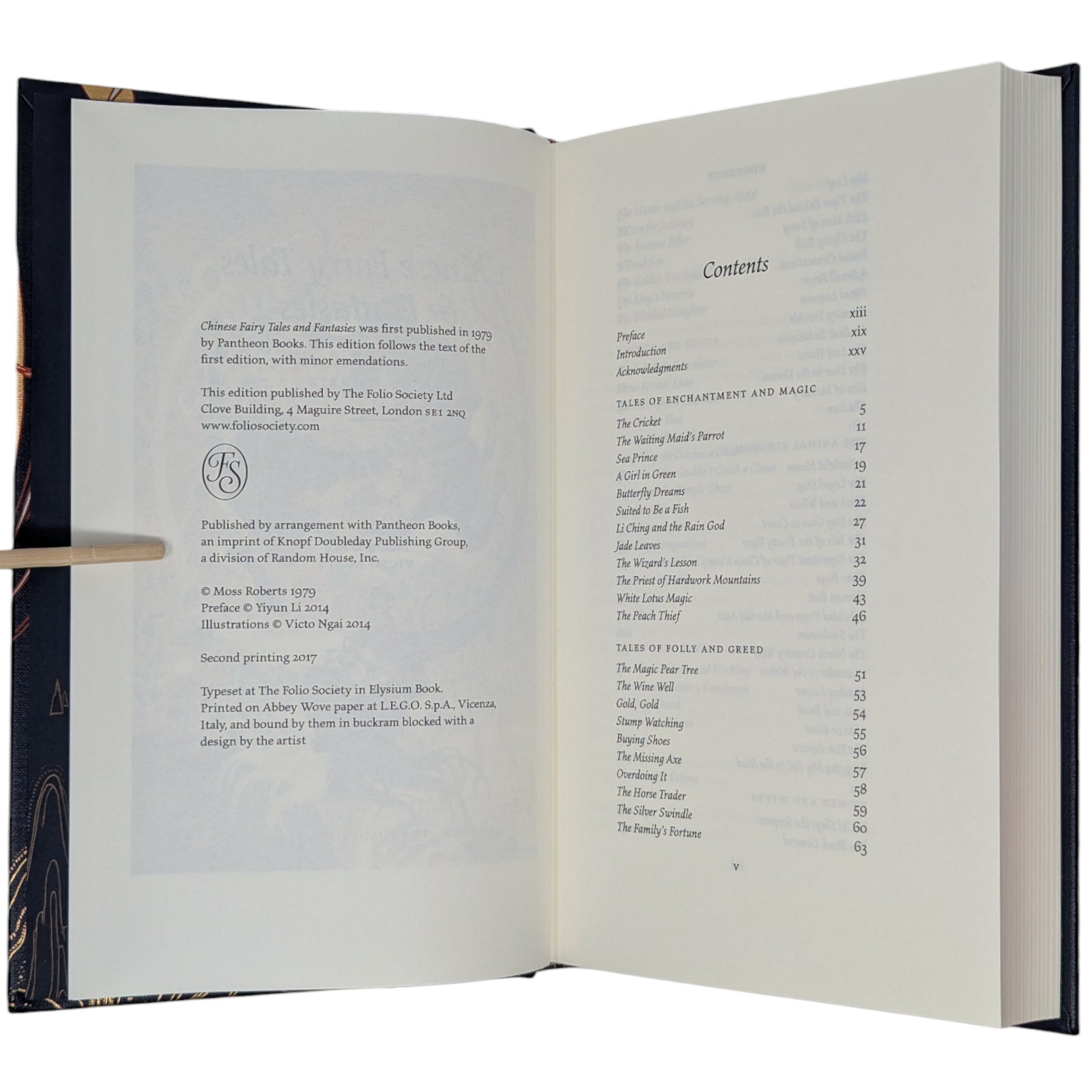 Chinese Fairy Tales & Fantasies. London: The Folio Society, 2014. Second printing thus, 2017. Translated and edited by Moss Roberts, with the assistance of C.N. Tay, preface by Yiyun Li, illustrated by Victo Ngai. 240 × 151 × 30 mm. Pp. [i–iv] v–xxv [xxvi–xxviii], [1–4] 5–256 [257–260]: [8] leaves of colour plates (facing pp. [iii], 37, 52, 101, 116, 132, 164 and 228). Type: Elysium Book. Printed and bound by L.E.G.O. in full black buckram blocked in red, white and gold with a design by Victo Ngai; black endleaves printed in gold. Gold slip case.