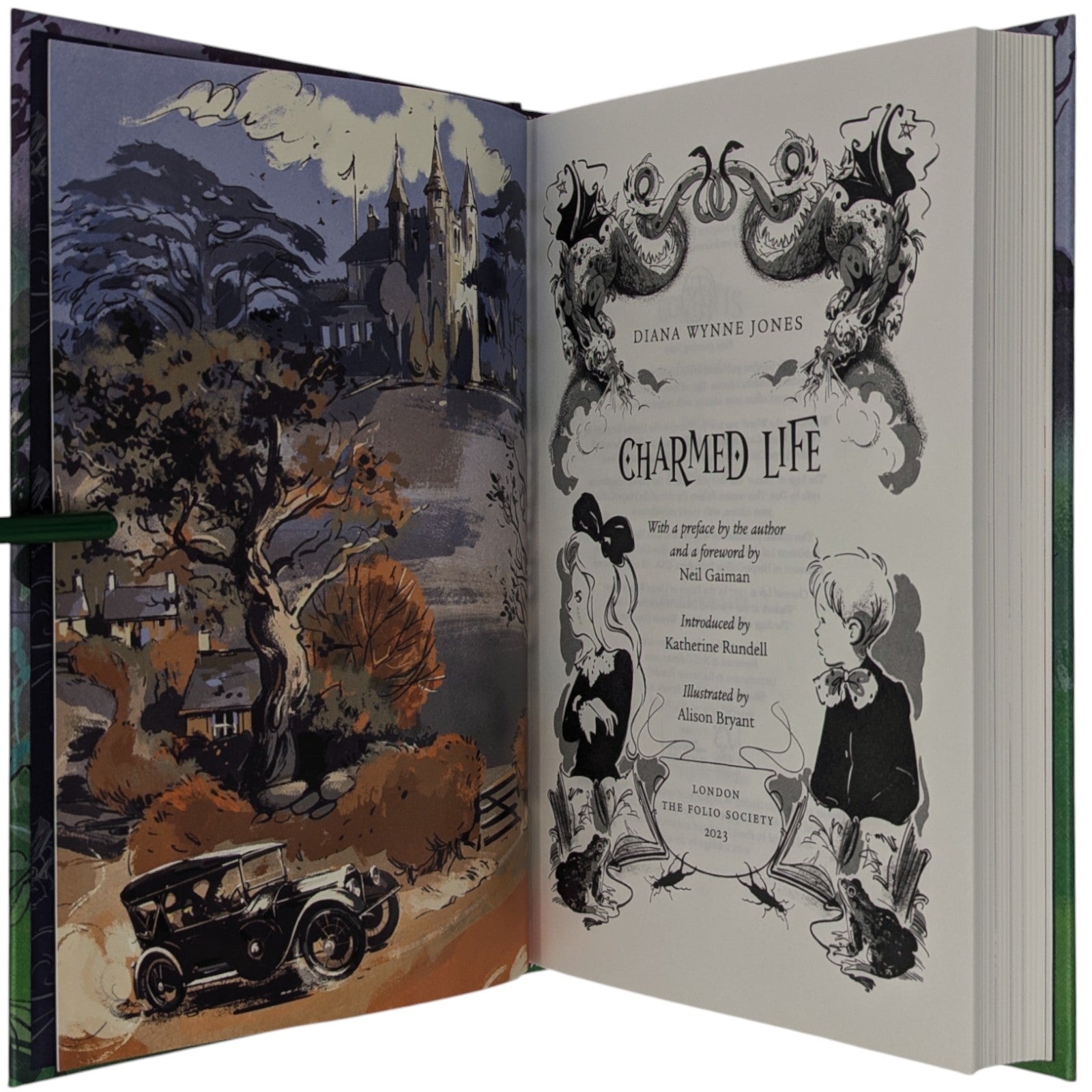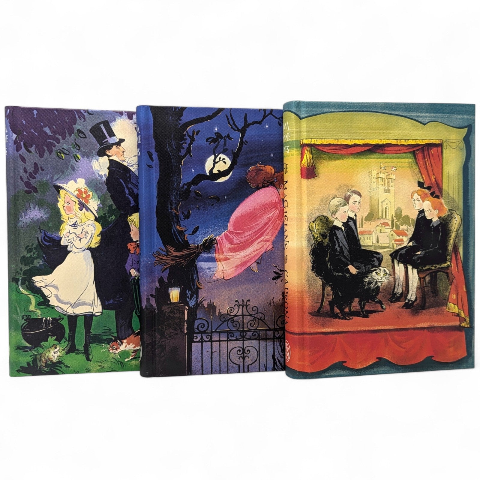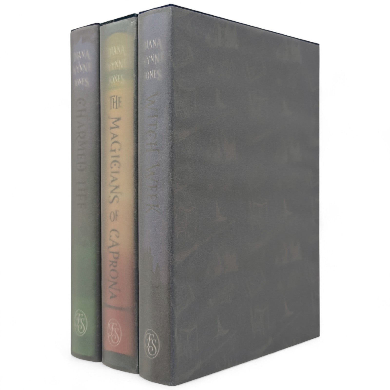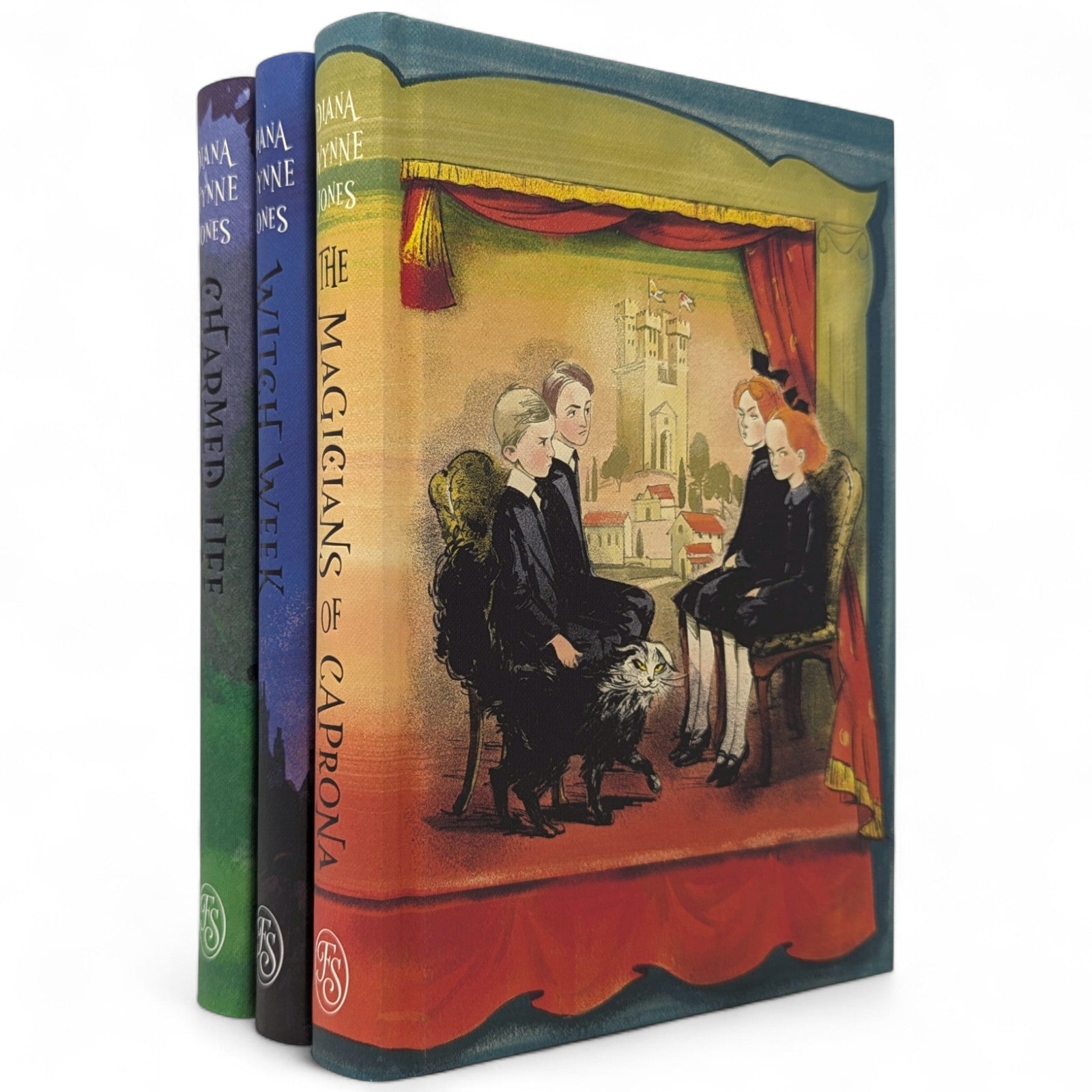 The first three books in The Chrestomanci series currently being published by The Folio Society. Written by Diana Wynne Jones and illustrated by Alison Bryant, these are Charmed Life, The Magicians of Caprona, and Witch Week.