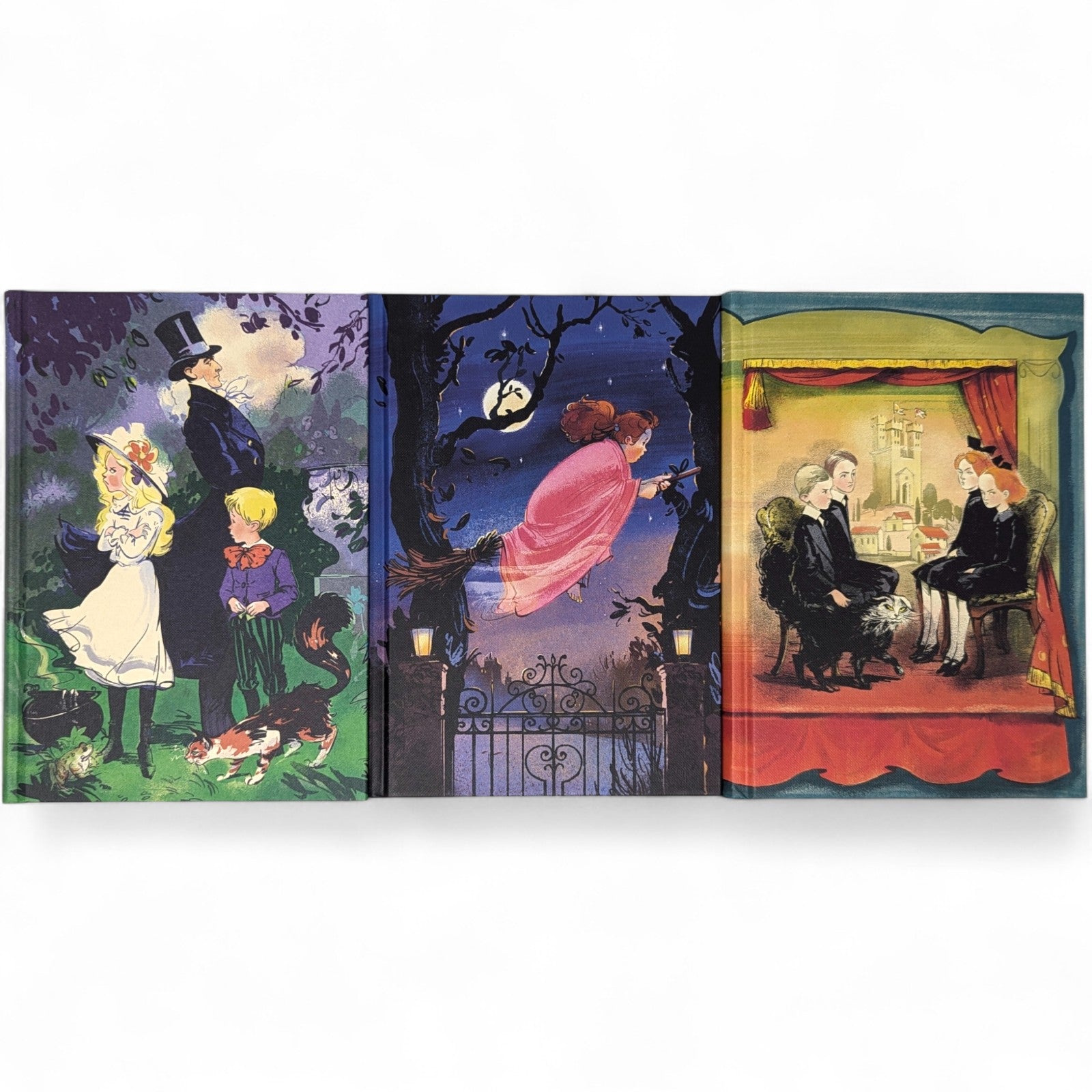 London: The Folio Society, 2023-2024. Bound in printed and blocked textured paper, with endpapers and slipcase printed in silver. 9 inches x 6¼ inches, 272 pages. Set in Legacy Serif with Wonder Night fonts as display. 272, 296, 224 pages. Each volume illustrated with 6 or 7 full-page colour plates and numerous black-and-white-illustrated title pages and chapter heads.